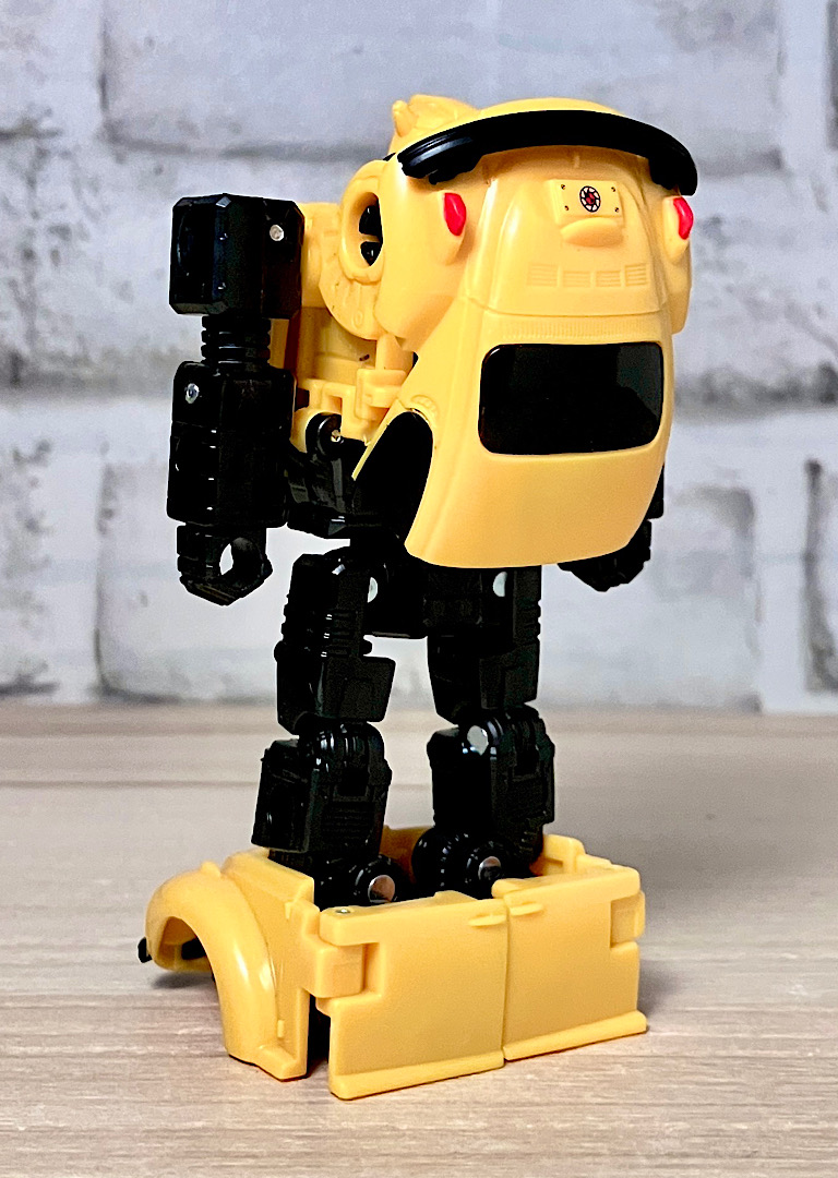 これはちょっと賛否の分かれるところ。背中に付いているビークル後部パーツが変形時に付け替えになっており、ロボ時にはシールドに見立てることもできます。コストの兼ね合いだと思うのですが、完全変形が基本のTFにとってはネガティブな要素でもあります。