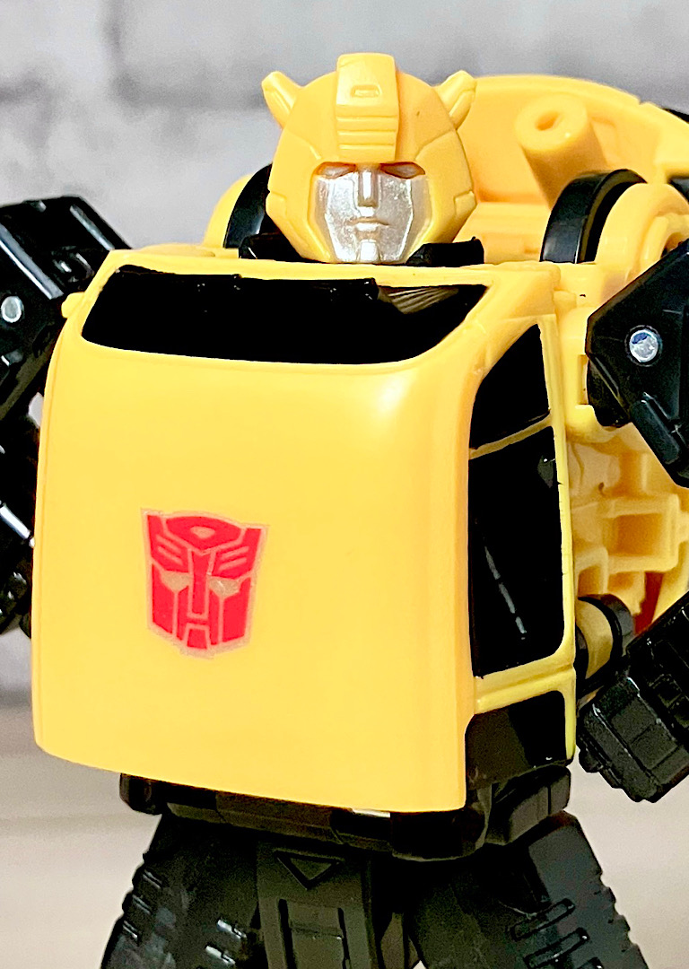 【アップ】G1ビーの愛嬌が若干クール目に再現されていて、結構好きな顔。ただし今回は顔がシルバー1色。これはビンテージトイを意識した配色なのですが、再販待ちの方にとってはちょっと残念だったかもしれません。なお胸にオートボットエンブレムが追加されたのは嬉しい変更。