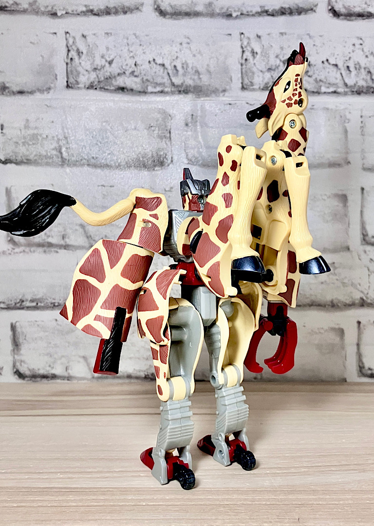 【ロボットモード】少し頭身が崩れていますがロボットモードもよくできています。キリンの首が右腕になるという意欲的なデザイン。キリンの優しい色合いも特徴ですね。