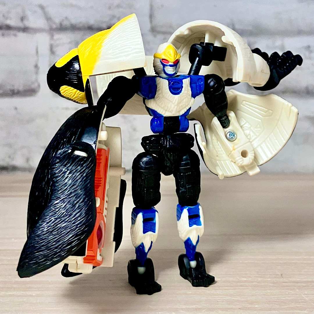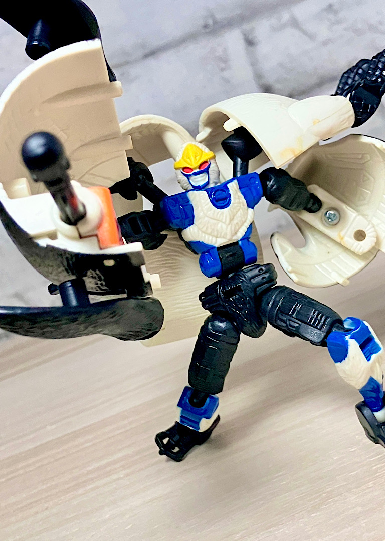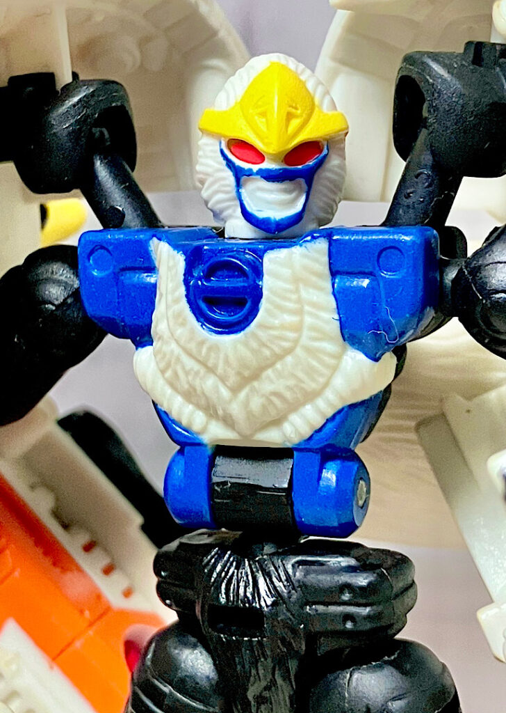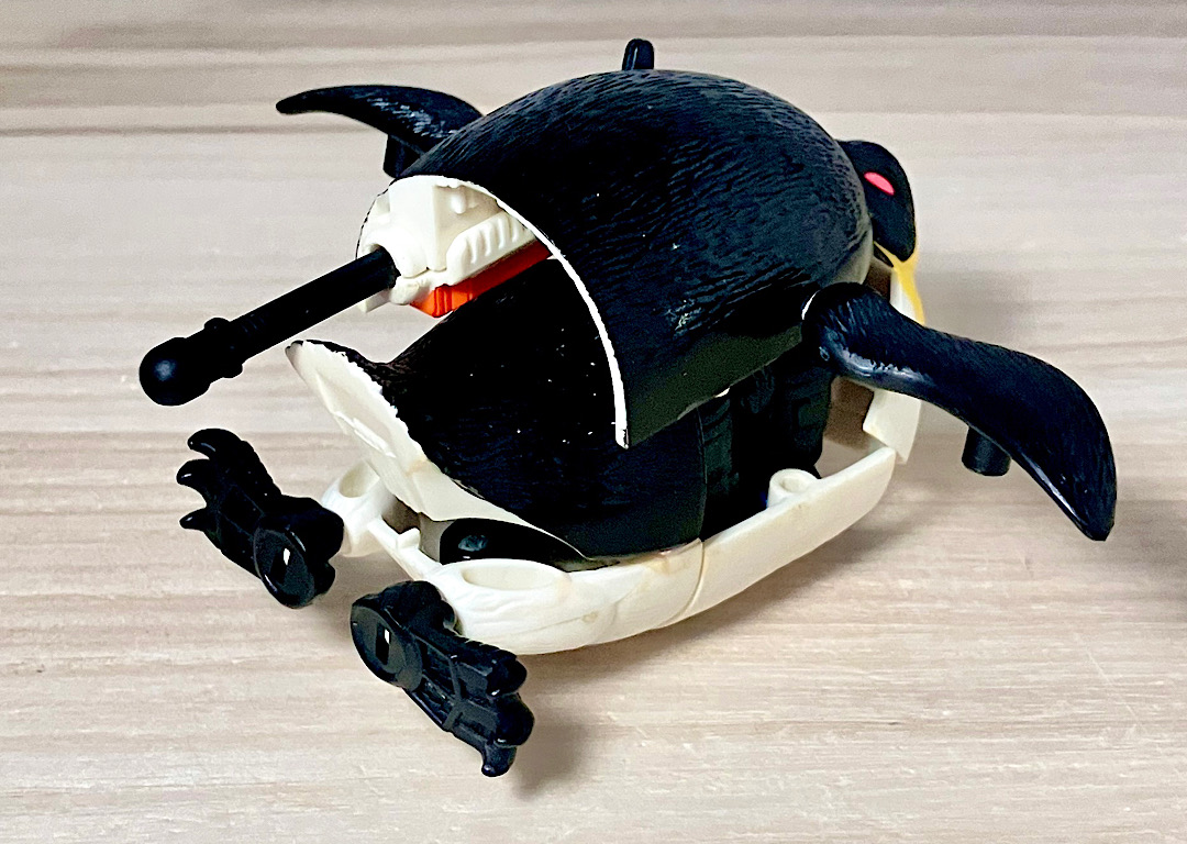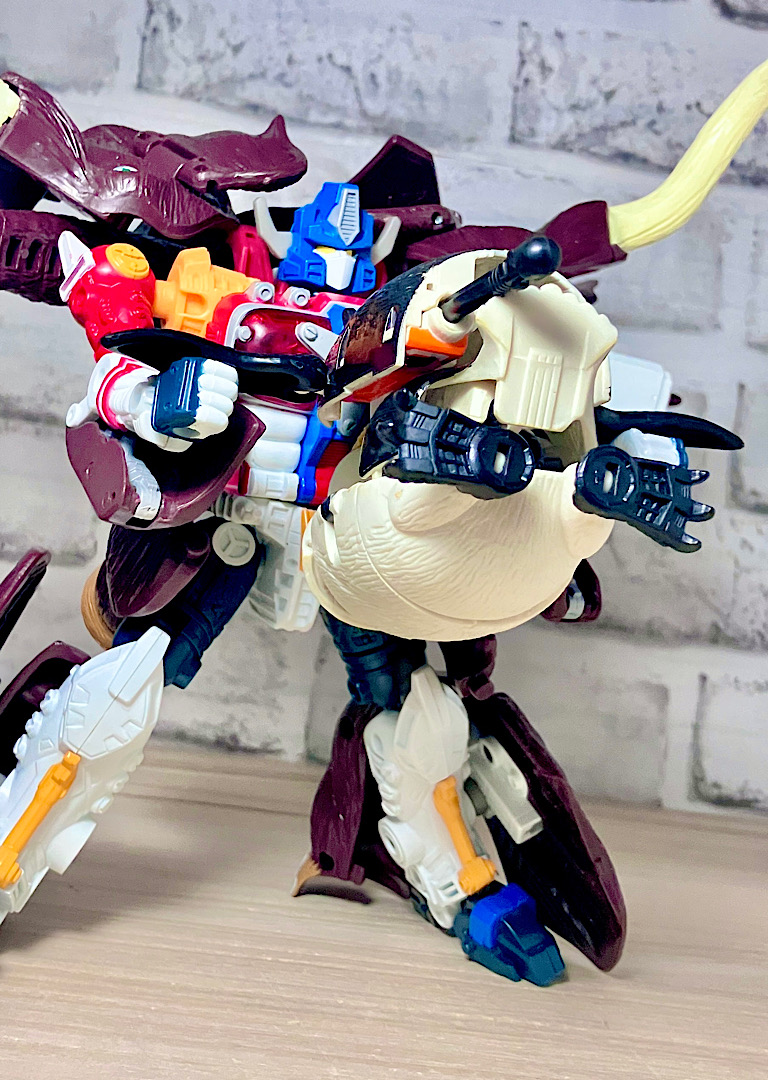 【ロボットモード】ペンギンパーツがかなり窮屈に周辺に配置されたロボットモード。ビースト戦士らしいといえばらしいのですが、もはや考えることをぶん投げたかのようなガワ変形ぶり。「TF史上トップクラスのシェルフォーマー」という不名誉な言われ方もします。ちなみに変形はロボパーツを正確な位置に折り畳まないとうまくガワを被せられないという変な難しさがあります。