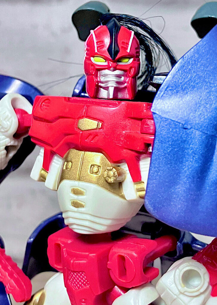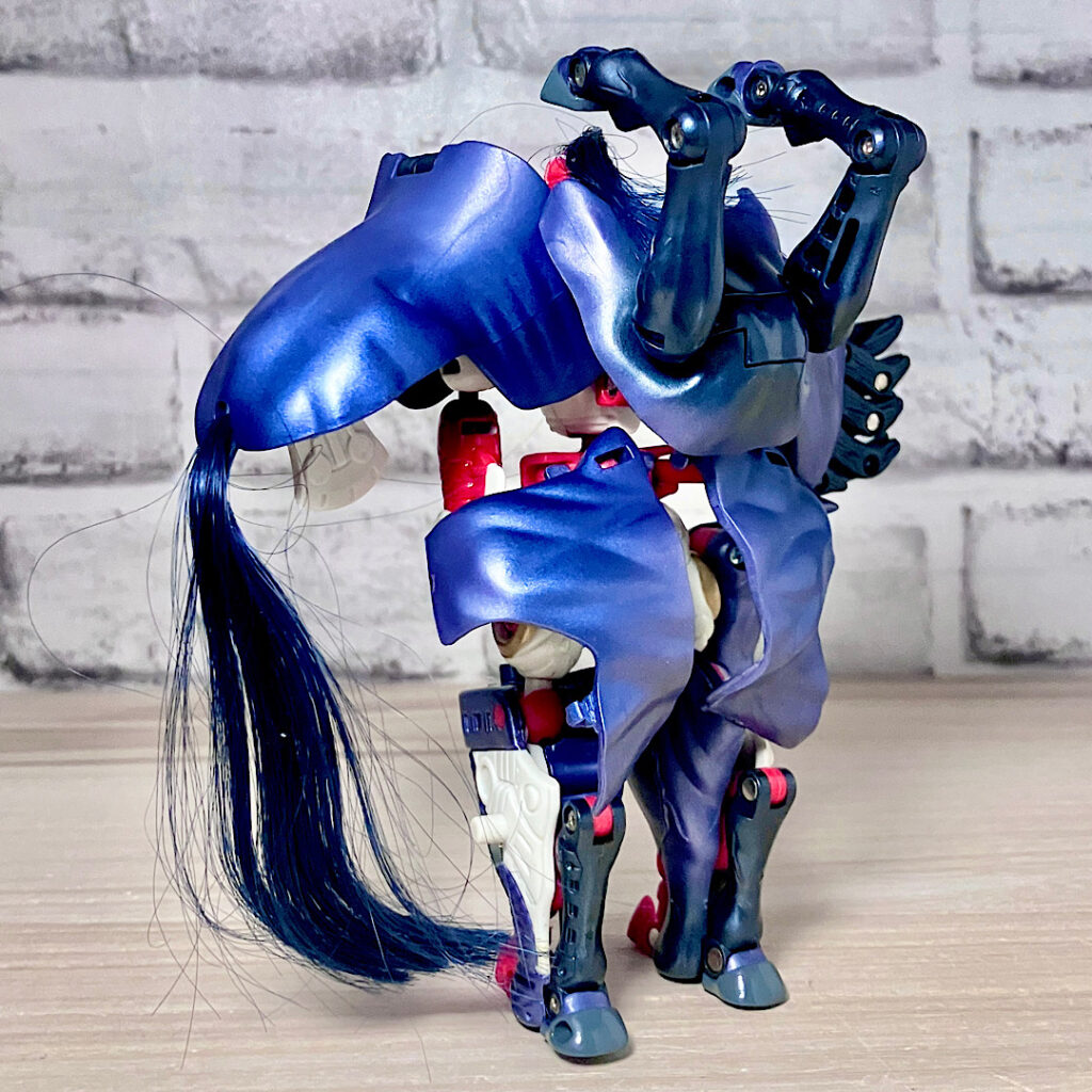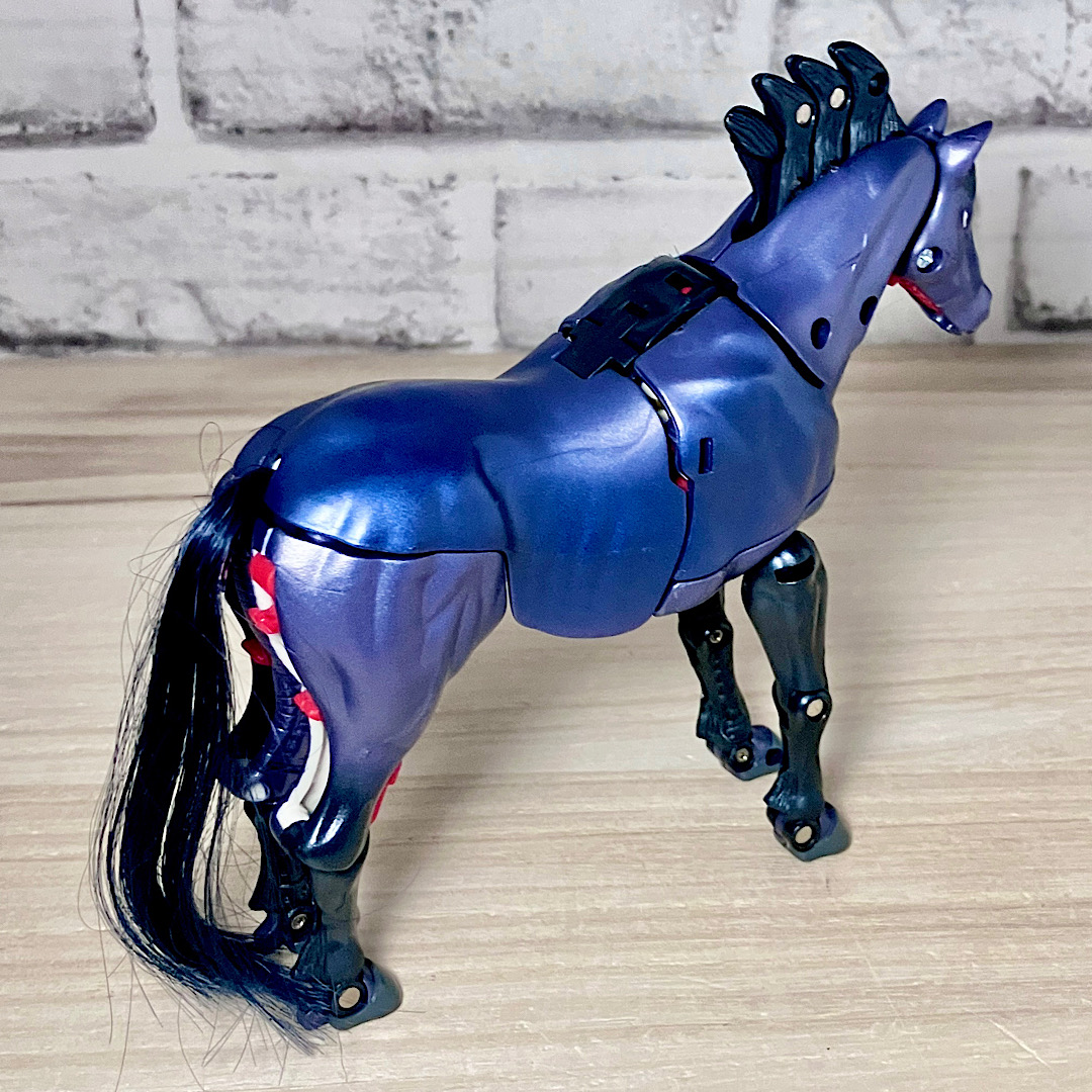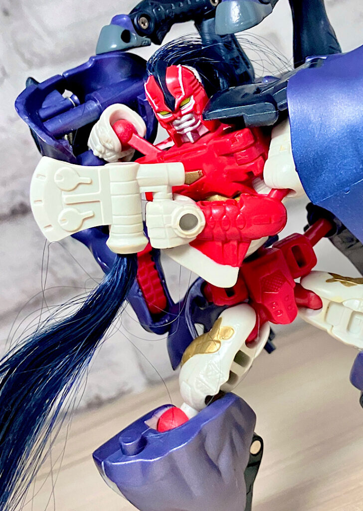 【ロボットモード】ロボットでも植毛で再現されたポニーテールが。顔は大陸的な雰囲気もありますが、ネイティブアメリカンや覆面レスラー味もあって複数モチーフなのかもしれません。なお変形はTF史上でもトップクラスの難易度とされています(特にロボ→馬)。ガワを合わせていく変形なんですが、ロボットパーツを中途半端な位置で交差させたり斜めに配置したりと、とにかく定位置がわかりずらいのが原因。説明書や動画は必須かも。