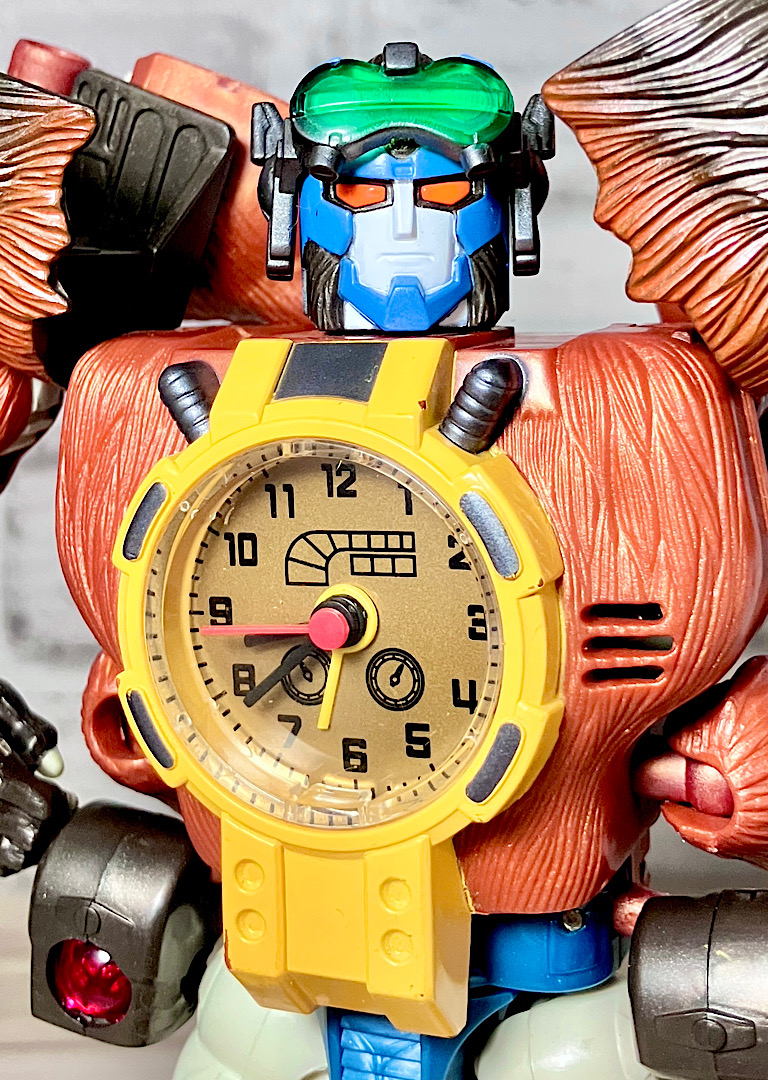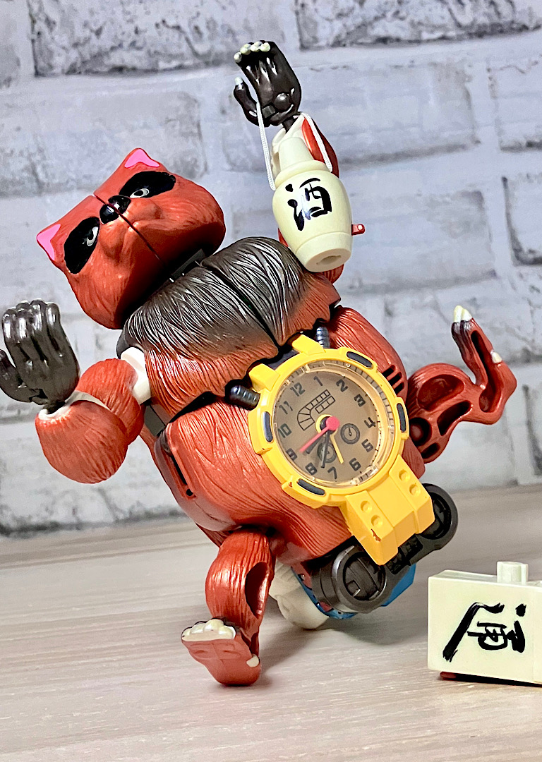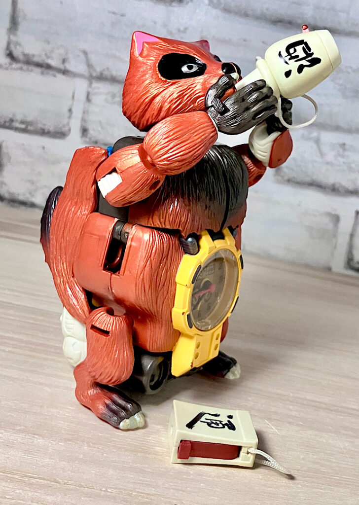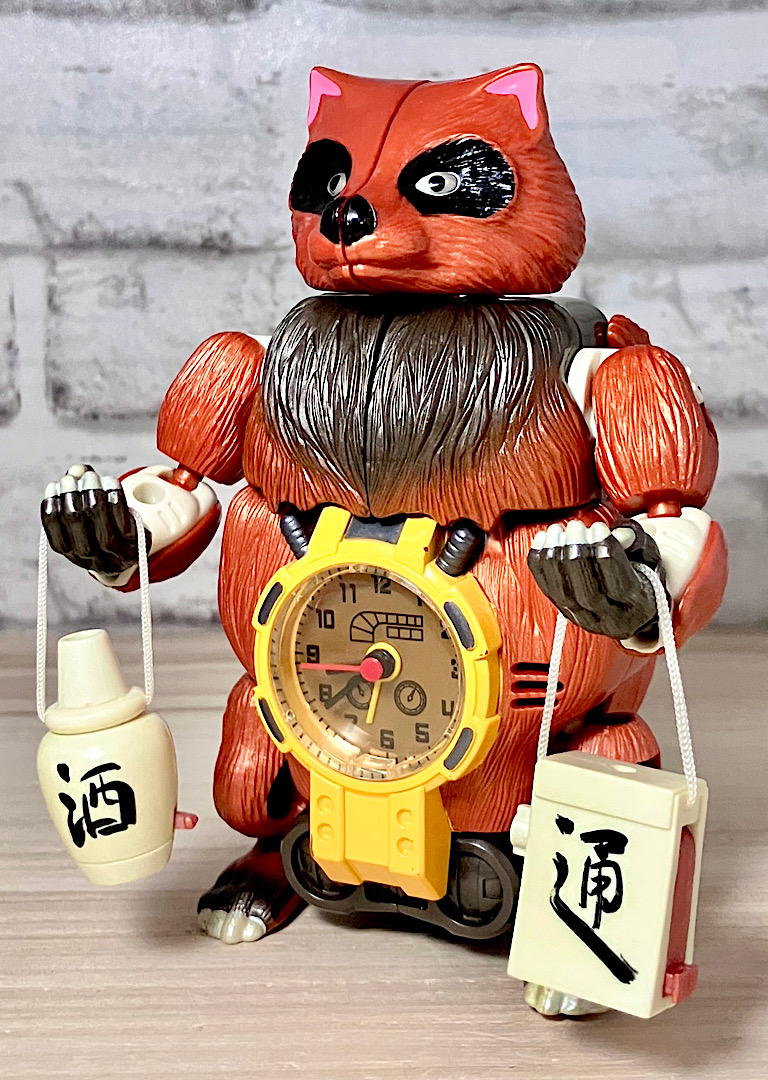 【ロボットモード】時計内蔵のためか少しバランスの悪いロボットモード。目覚まし時計を止めるにはロボットモードに変形してから頭部を押さなければなりません。真っ二つに割れたタヌキの頭がなんとも…。
