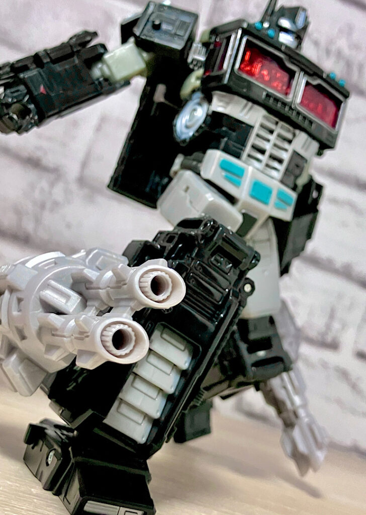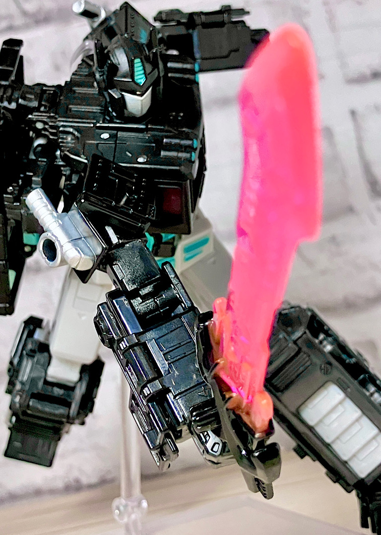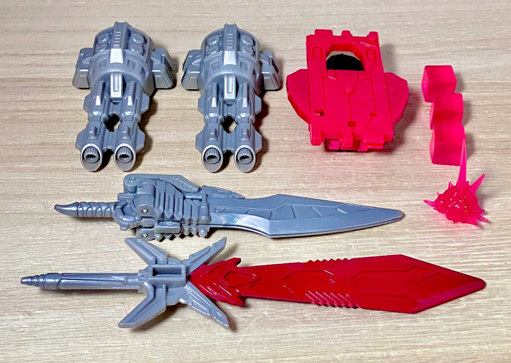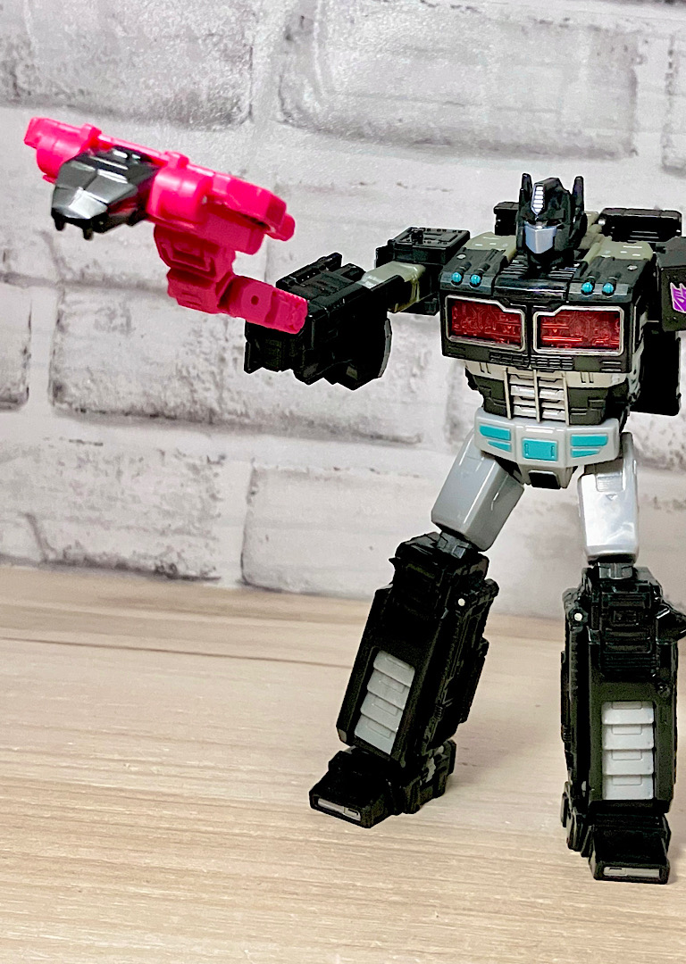 ちょっと付けずらいのですが、ボディ各所の5ミリジョイントで武装できます。なおこれらの武器は全てPOTP版ネメシスプライムの流用です。