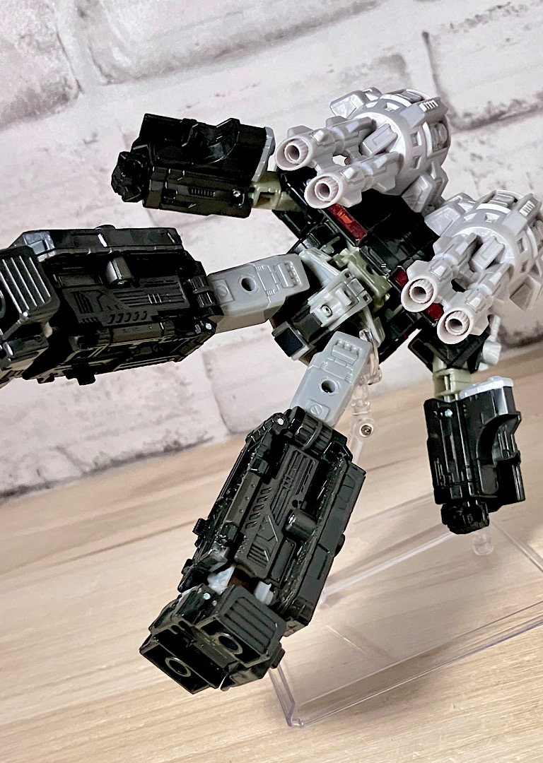 【可動】可動革命シージのアイテムなのでグリグリ動きますが、脚部の上がりが今ひとつ。ちなみにこの後にリリースされたアースライズ版司令官の脚部構造は「脚が長く見えすぎる」と言われることもありますが、ちゃんとシージ版の欠点を克服してたんですね。