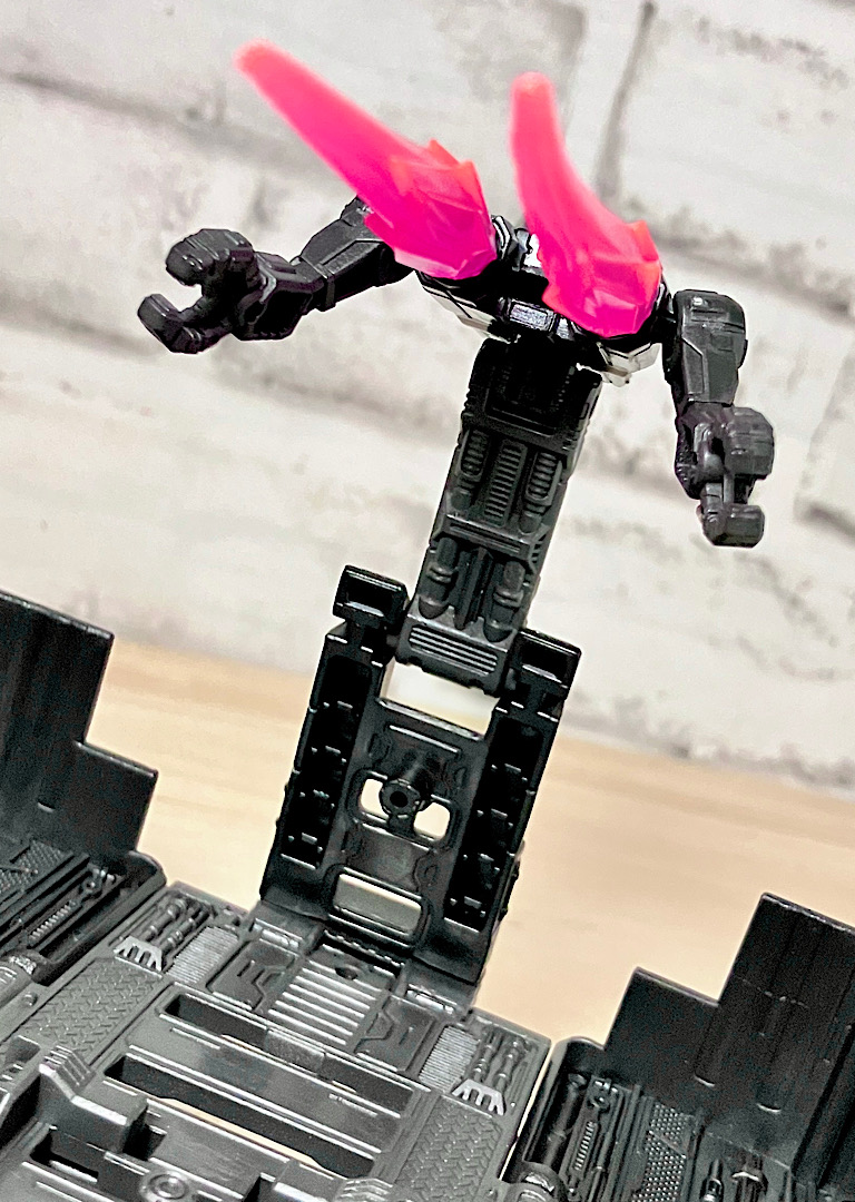 たたんであるアームレーダーはG1トイと同じように立ち上がることが可能。ミサイル機能は付いていませんが、その代わり別売りエフェクトに対応しています。