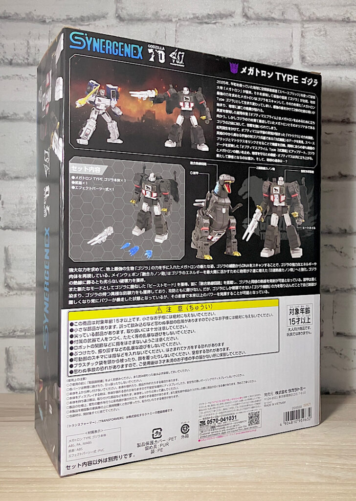 【パッケージ】タカラトミーの自社IPと他社IP・ブランドのコラボレーションシリーズSYNERGENEX。トランスフォーマーとして第1弾となるのはゴジラとのコラボです。TF40周年とゴジラ70周年の縁で実現したようで、2アイテムが同時発売。ゴジラとの組み合わせに選ばれたのは、なんとメガトロン!