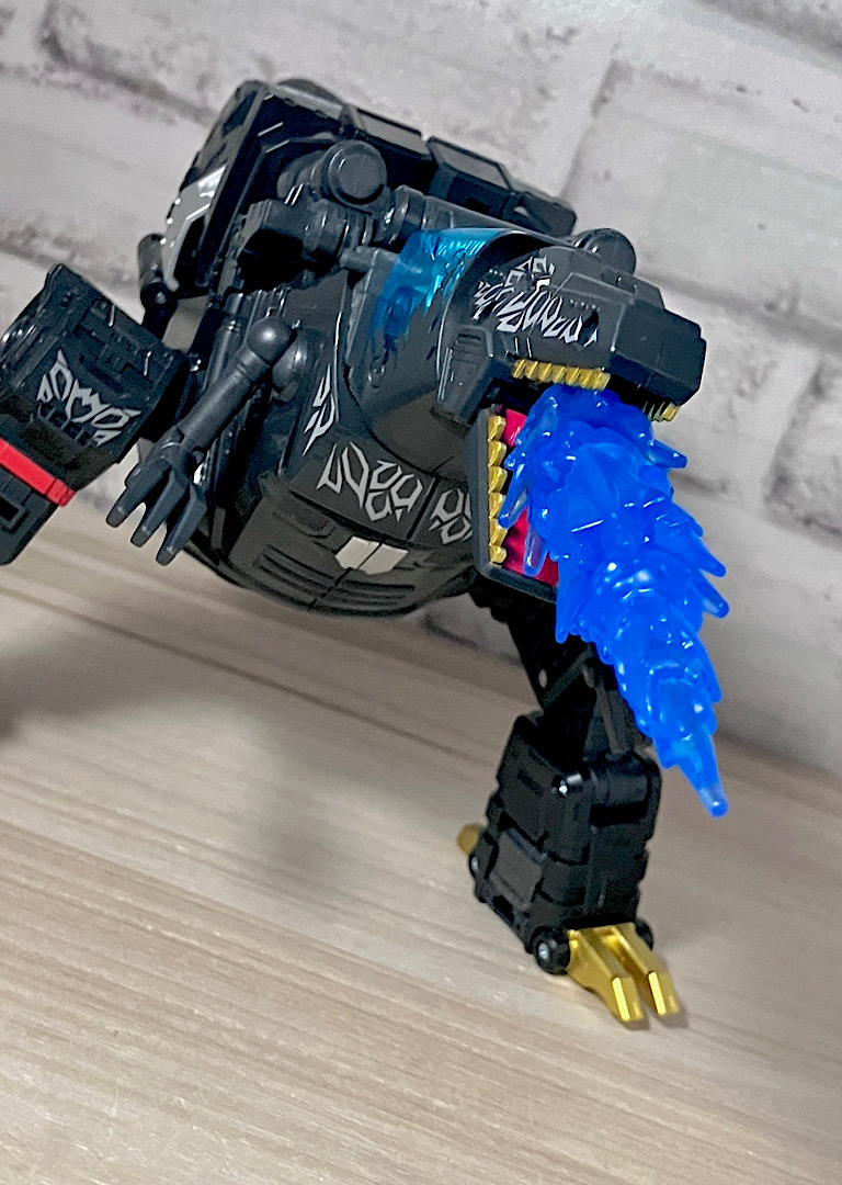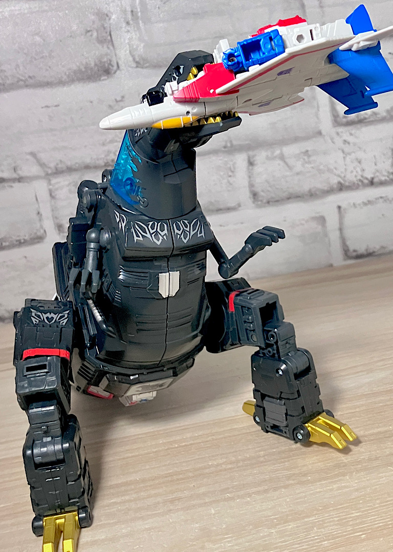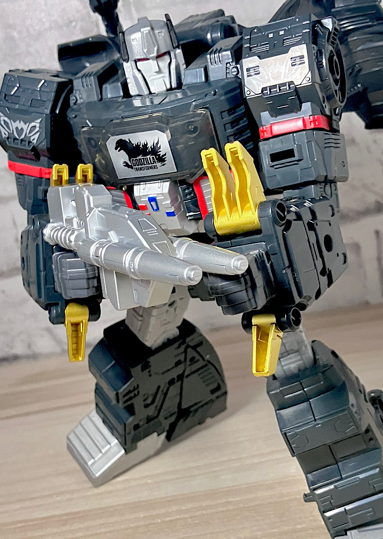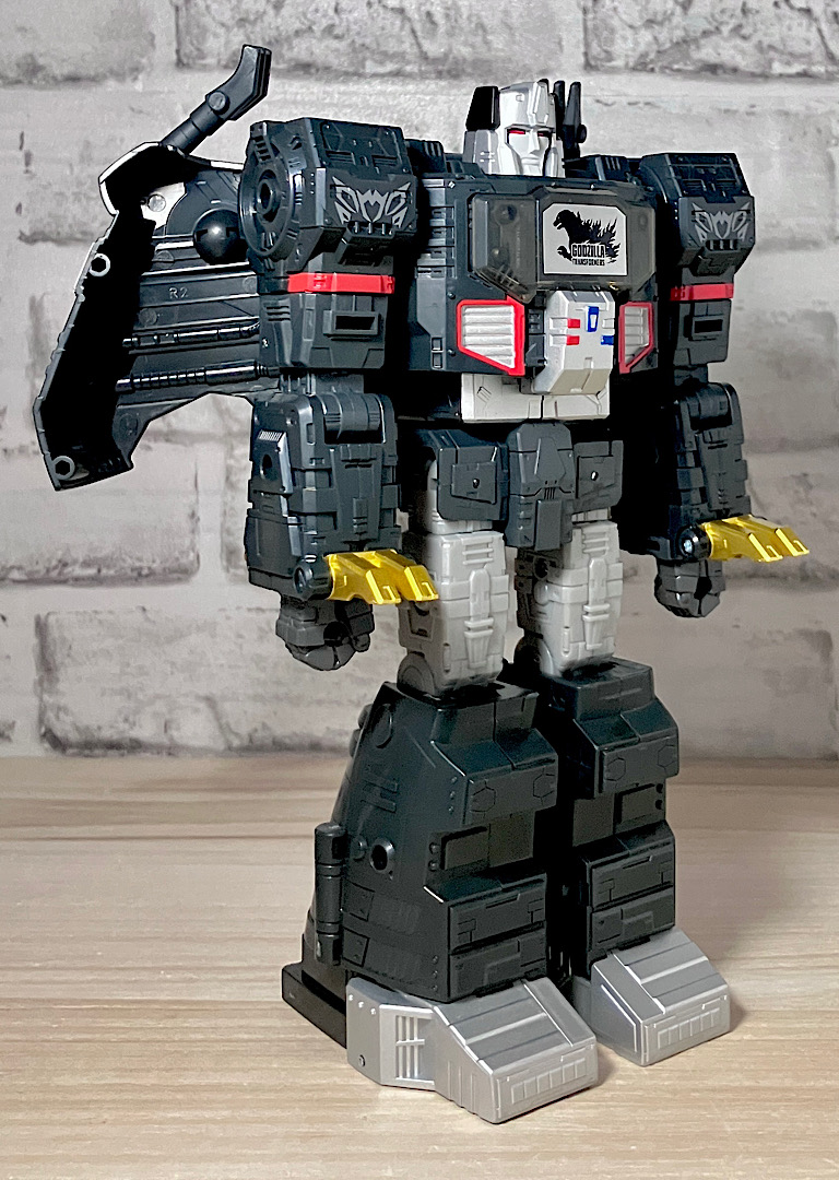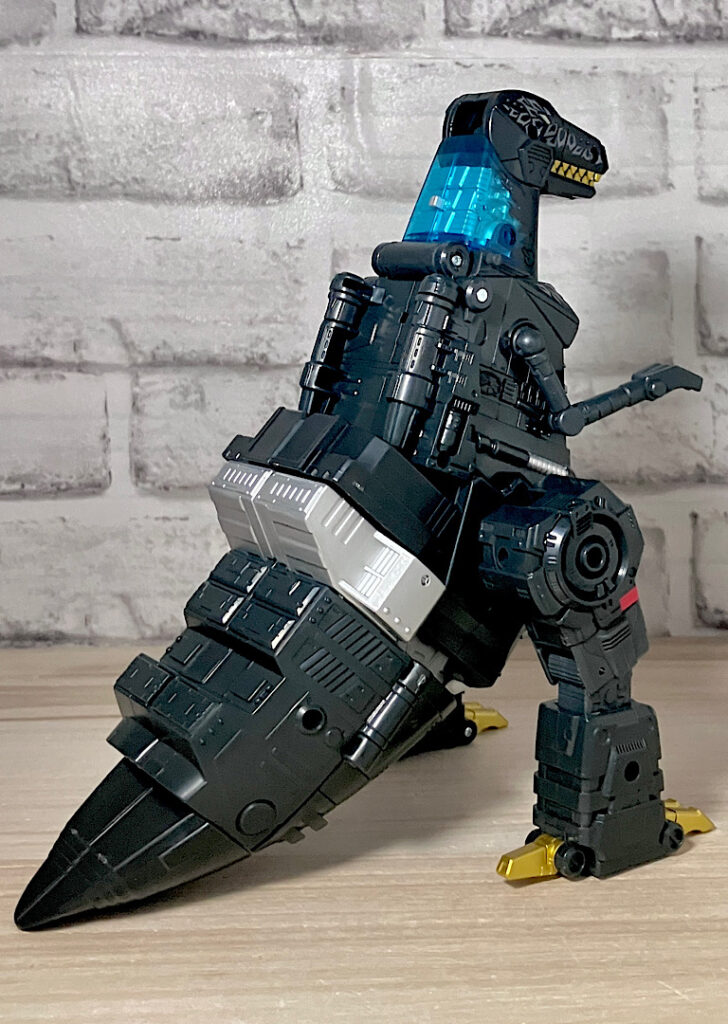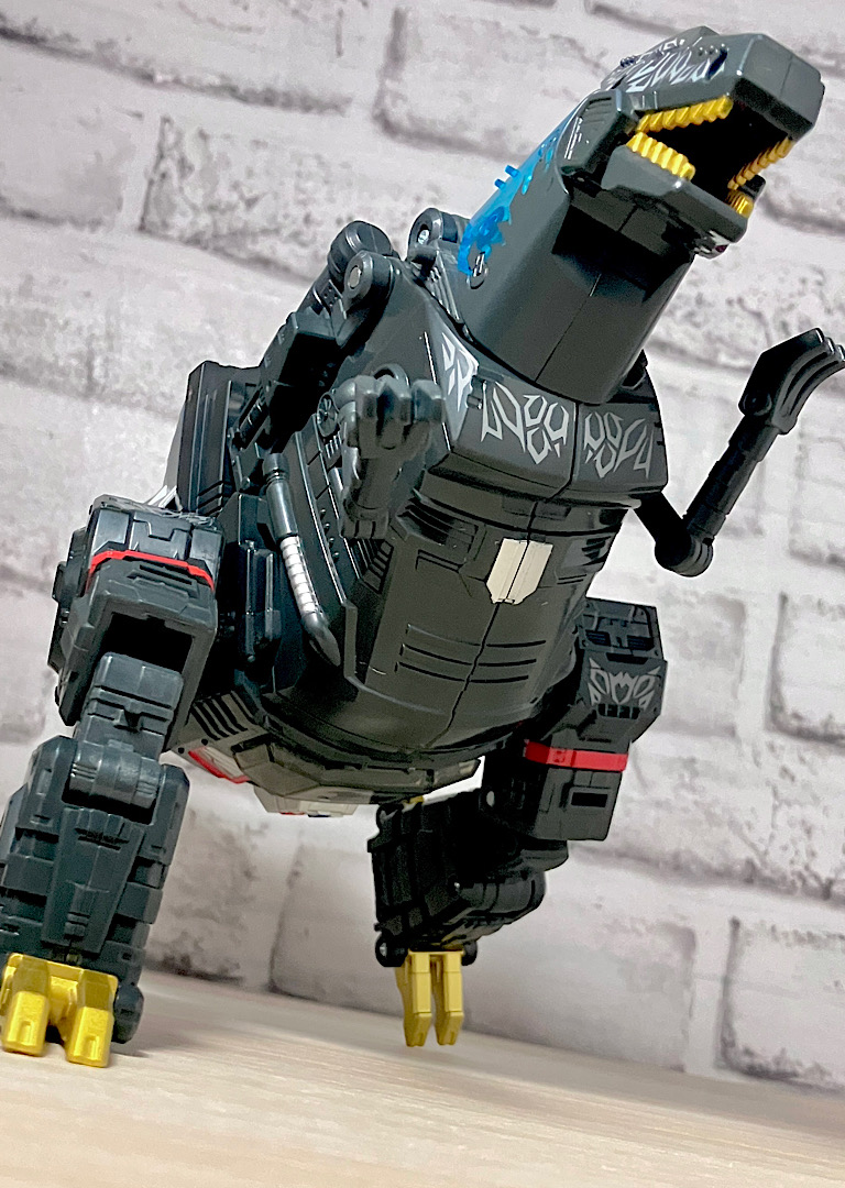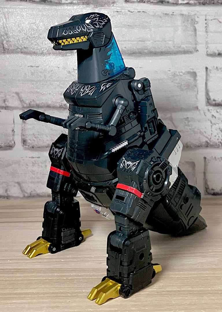 【ロボットモード】製品としてはSSグリムロックのリデコ。ゴジラの体色である黒をメインに、メガトロンのシルバーが差し色に使われています。