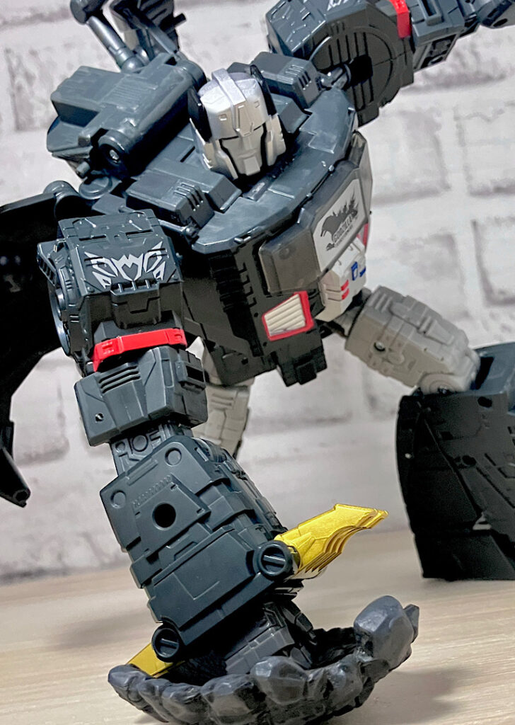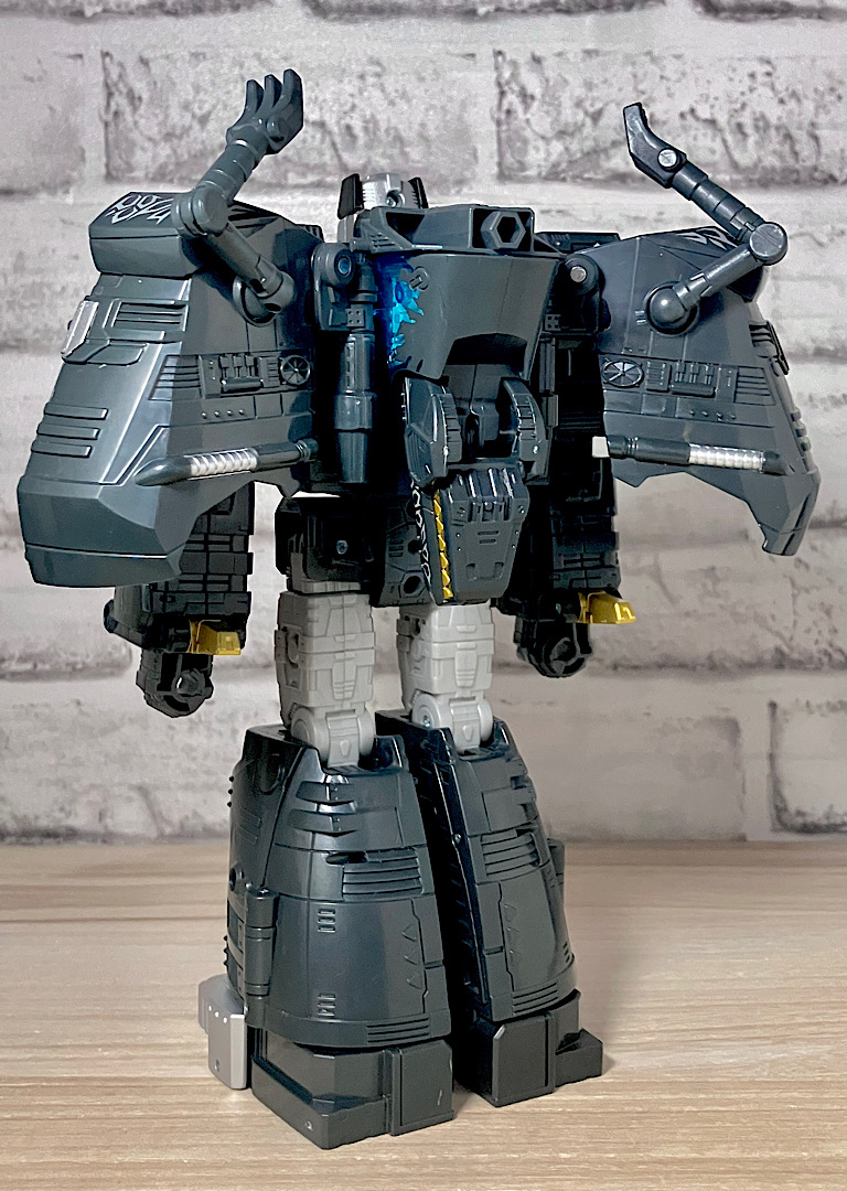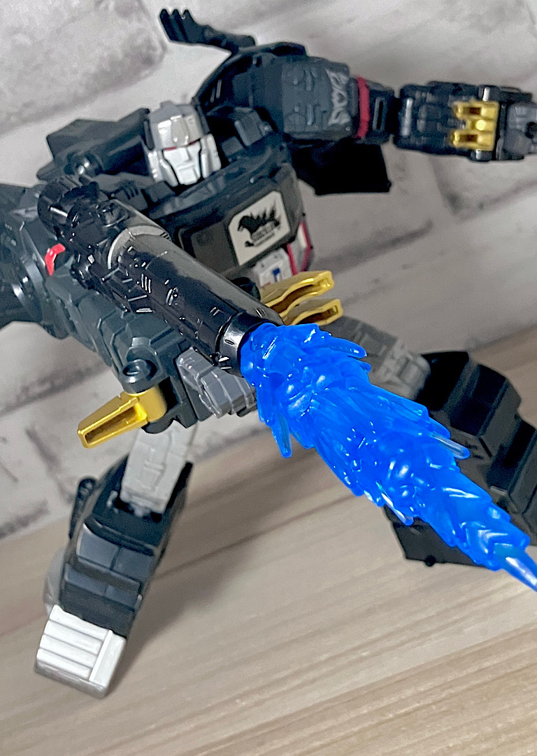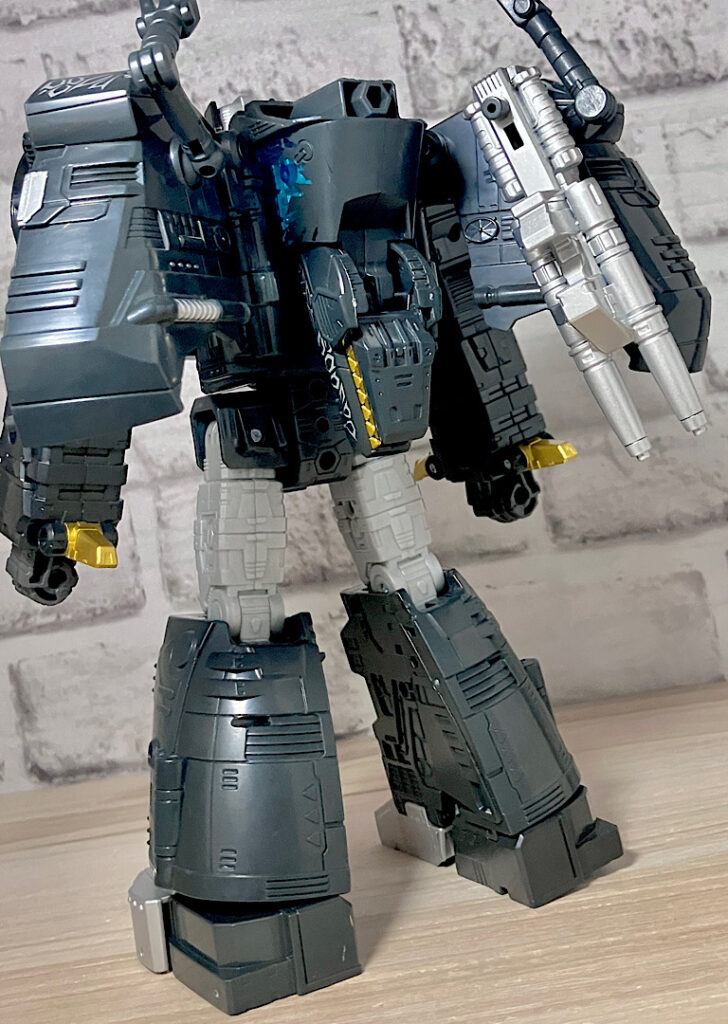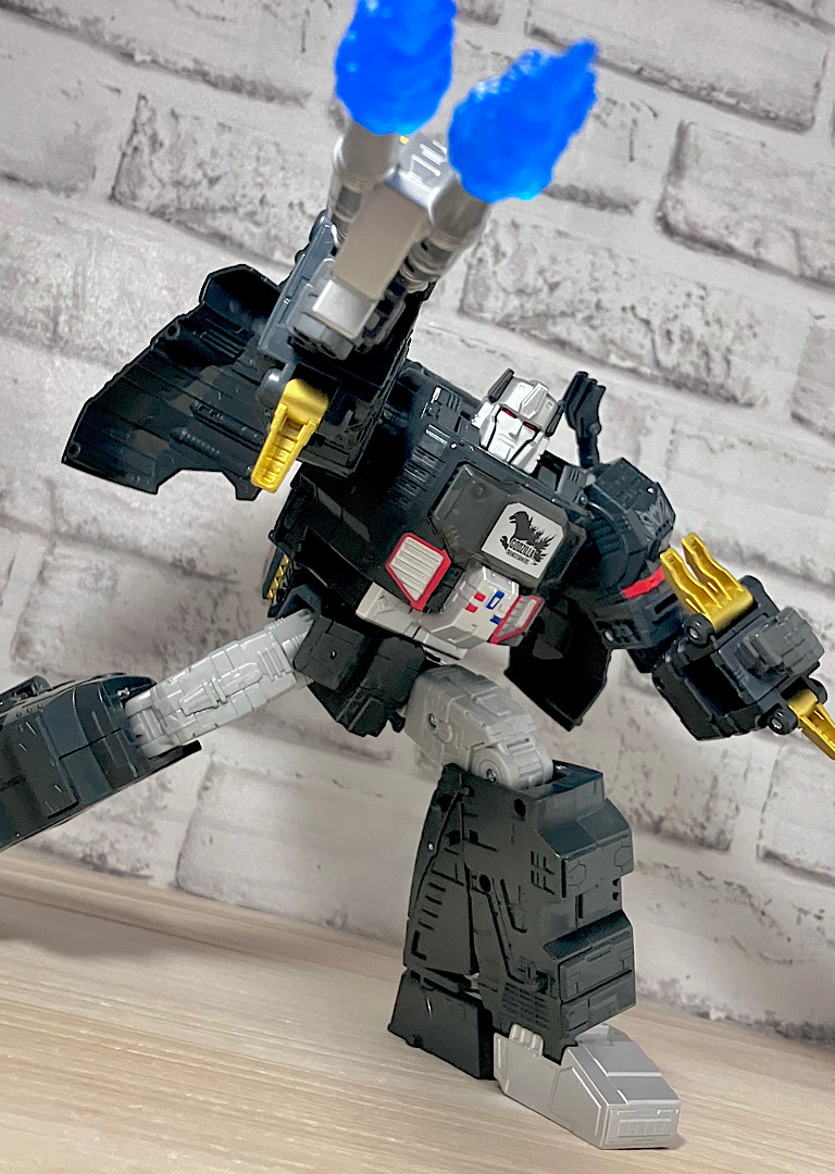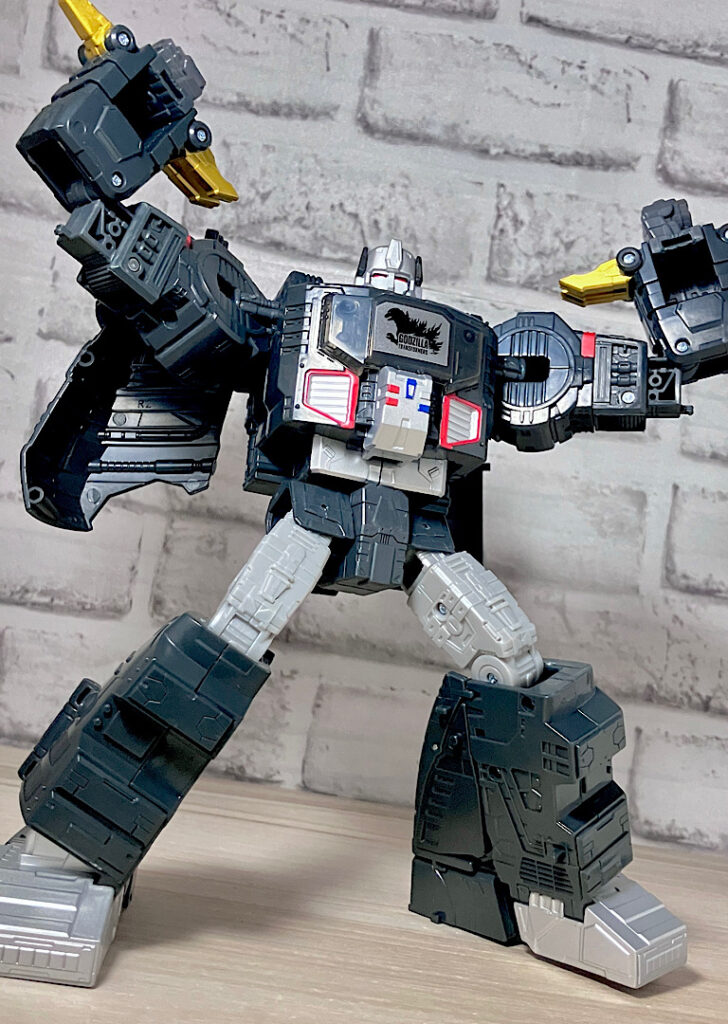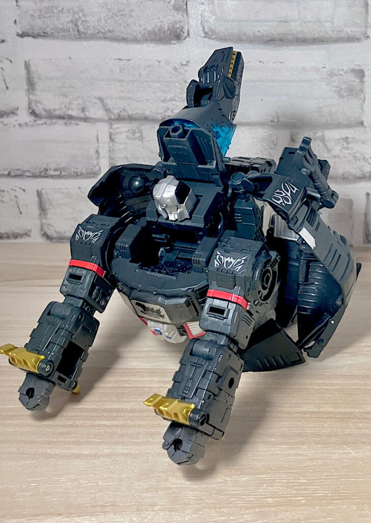 【ロボットモード】製品としてはSSグリムロックのリデコ。ゴジラの体色である黒をメインに、メガトロンのシルバーが差し色に使われています。