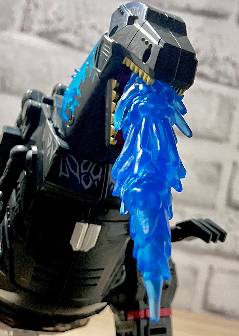 【ビーストモード】恐竜型メカに変形。これがまさにゴジラの姿ということになるわけです。ただまあ要するにグリムロックのリカラーで、特徴的すぎてゴジラに見立てるのは苦しいかな。せっかくのゴジラなんだから背びれくらいは追加しても良かったでしょうに…。なお首の後ろの青いクリアパーツはゴジラの熱放射?をイメージしたものでしょう。
