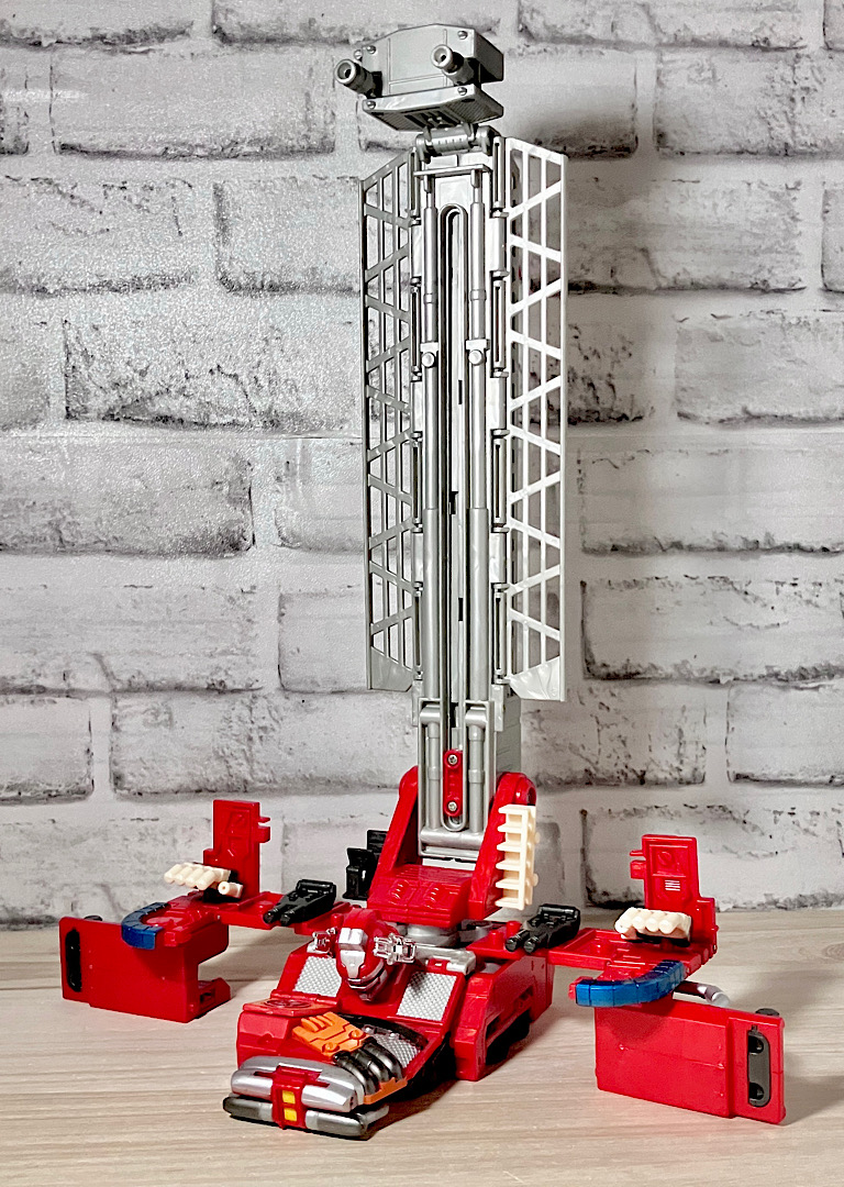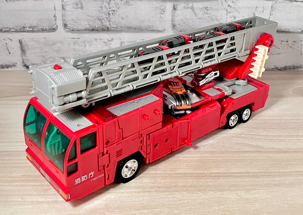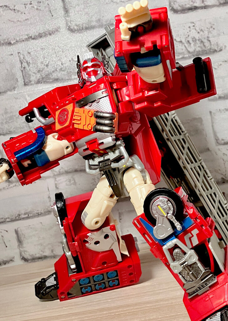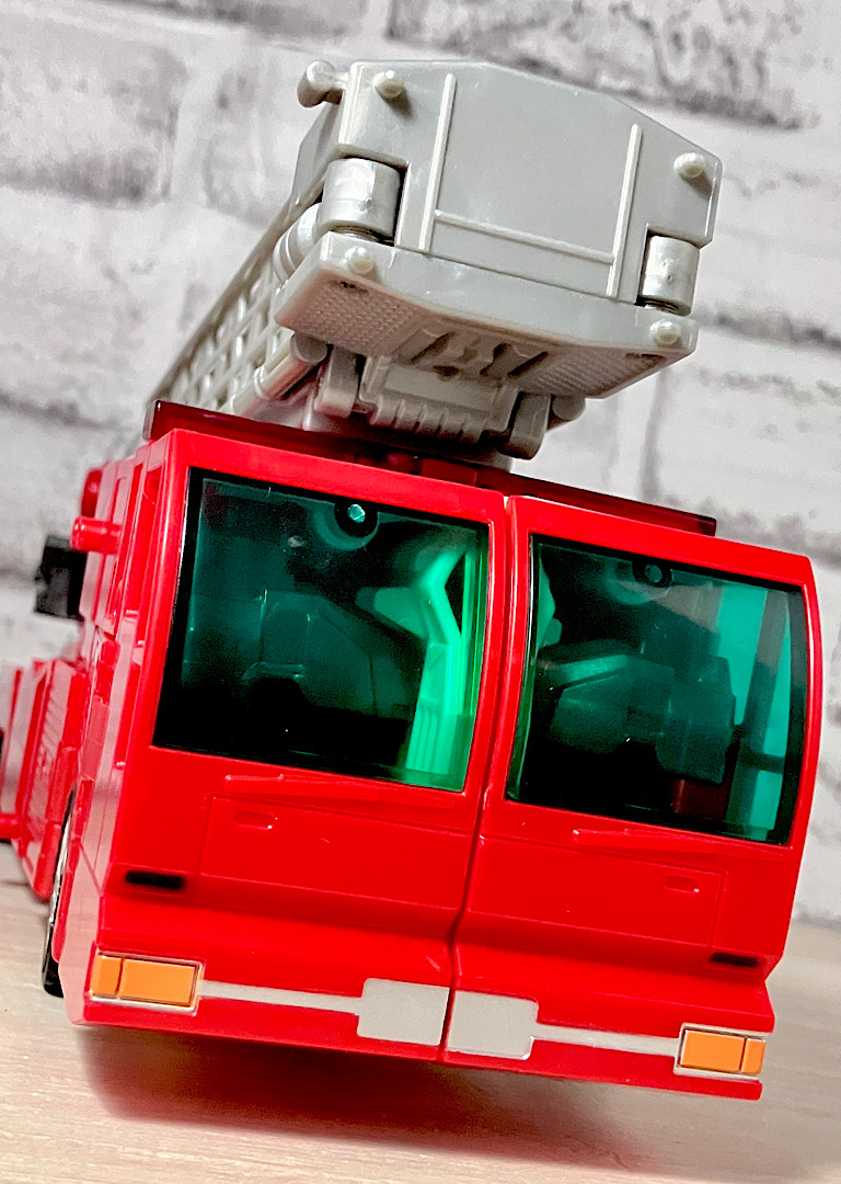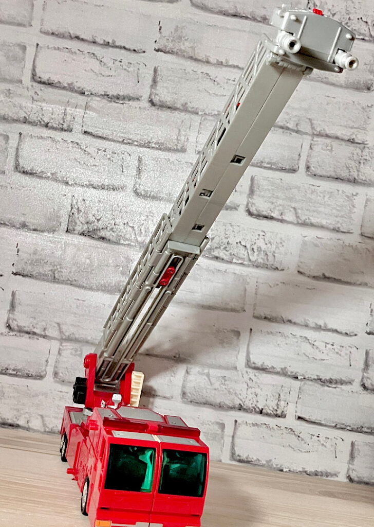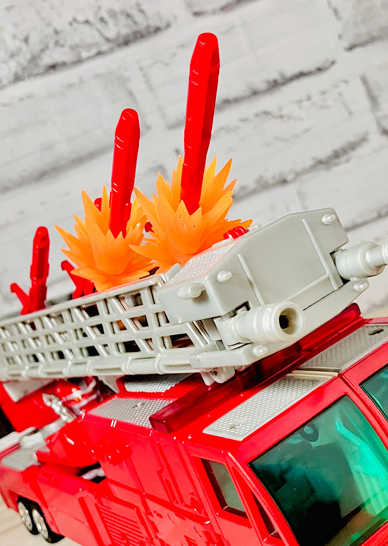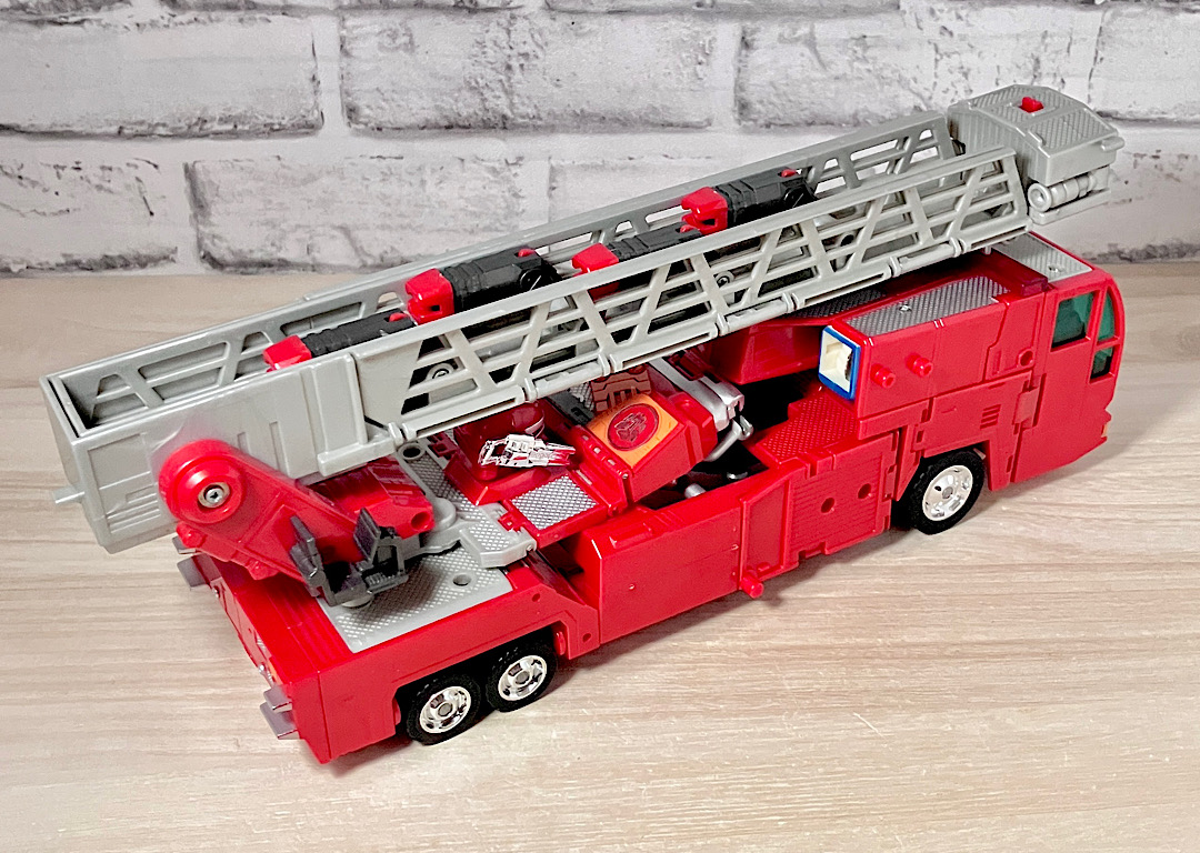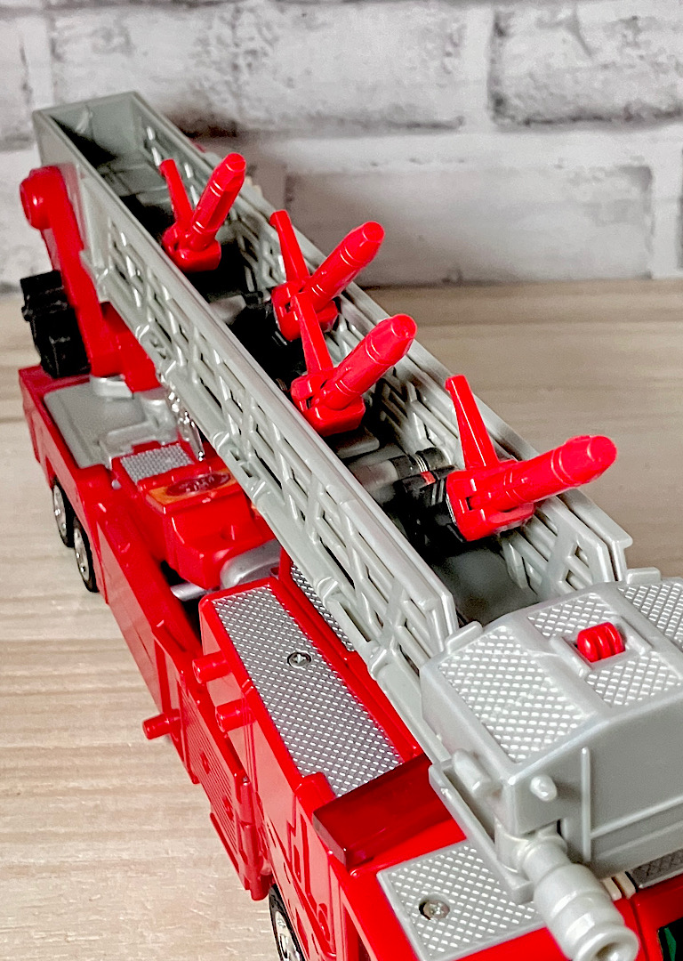 【ビークルモード】サイバトロンの熱血司令官。初めての消防車モチーフのコンボイ(オプ)で、後年にも影響を与えました。ビークルモードはサイズも大きくボリュームたっぷり。ただしパーツ同士の接続が甘くてポロポロ外れやすいのがちょっとストレスポイント。