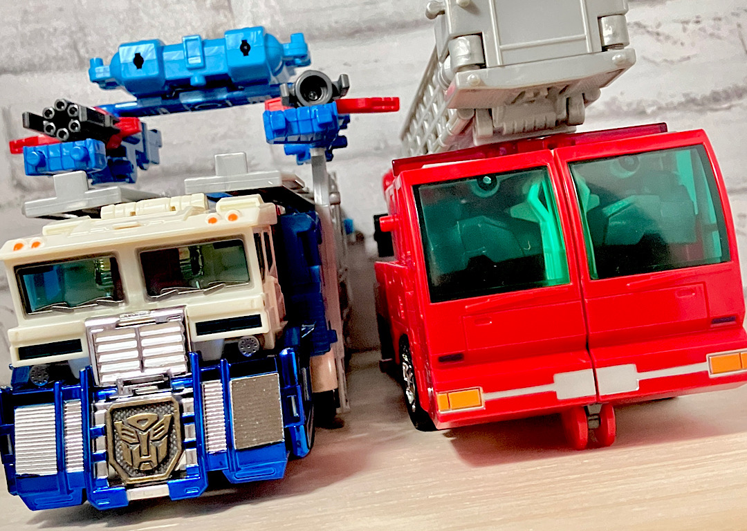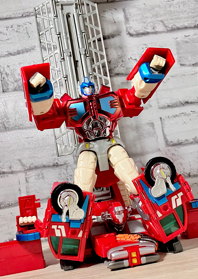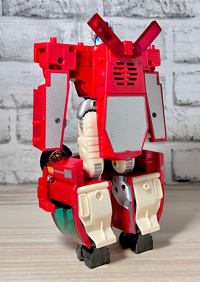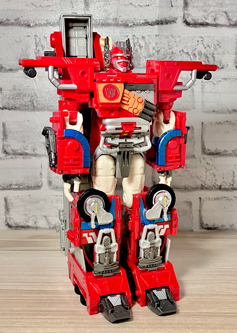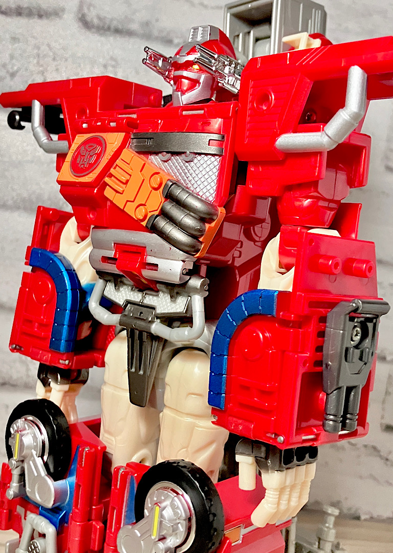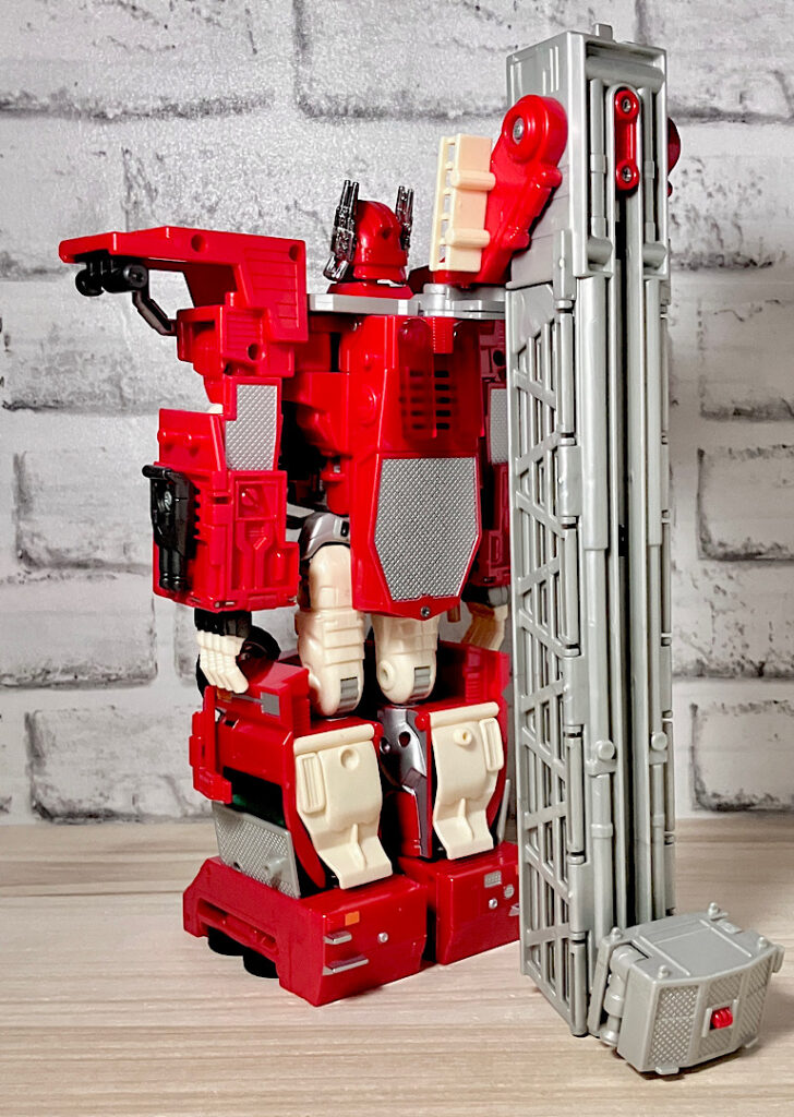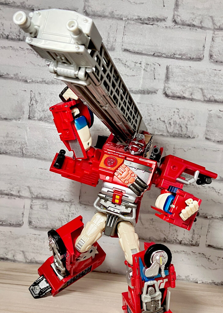 【ビークルモード】サイバトロンの熱血司令官。初めての消防車モチーフのコンボイ(オプ)で、後年にも影響を与えました。ビークルモードはサイズも大きくボリュームたっぷり。ただしパーツ同士の接続が甘くてポロポロ外れやすいのがちょっとストレスポイント。