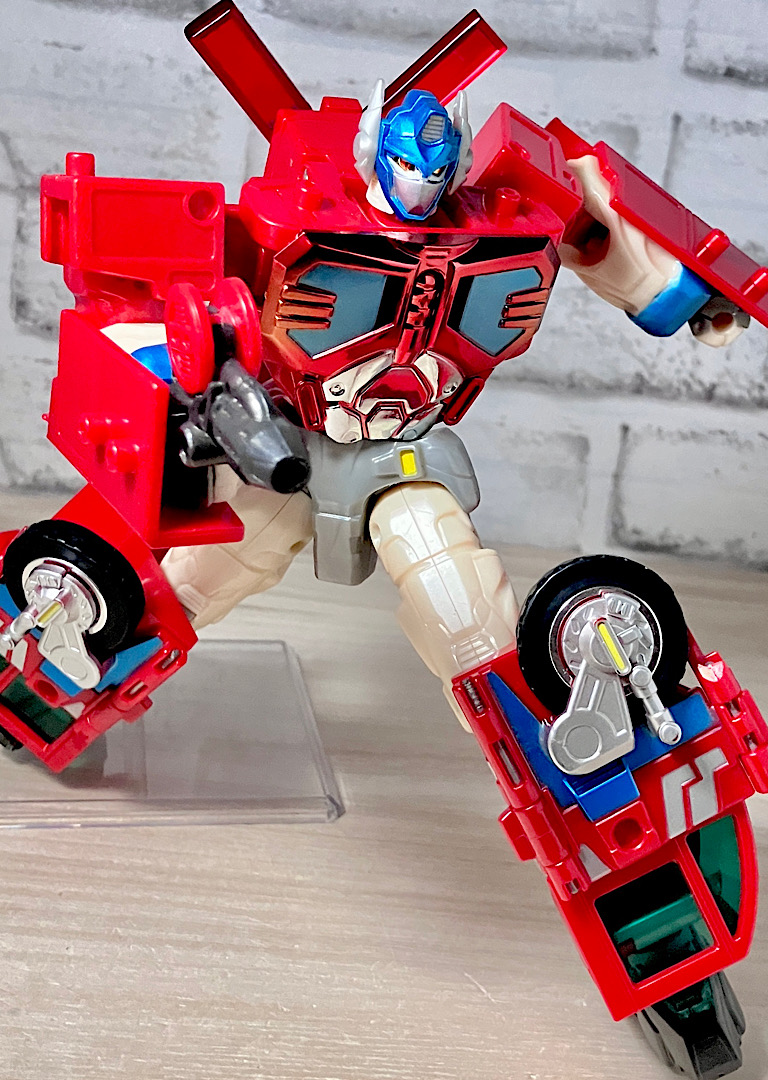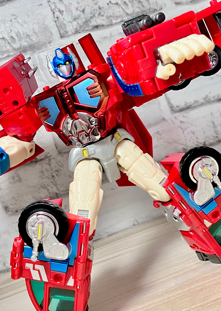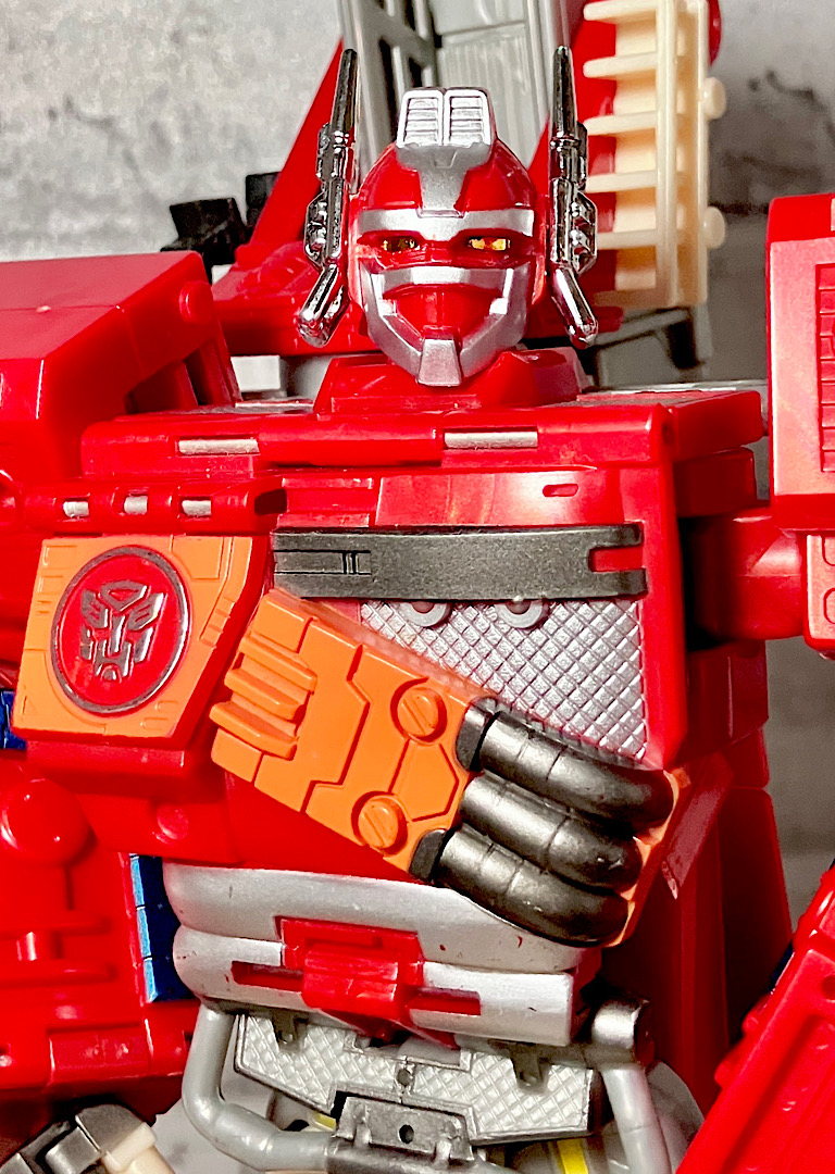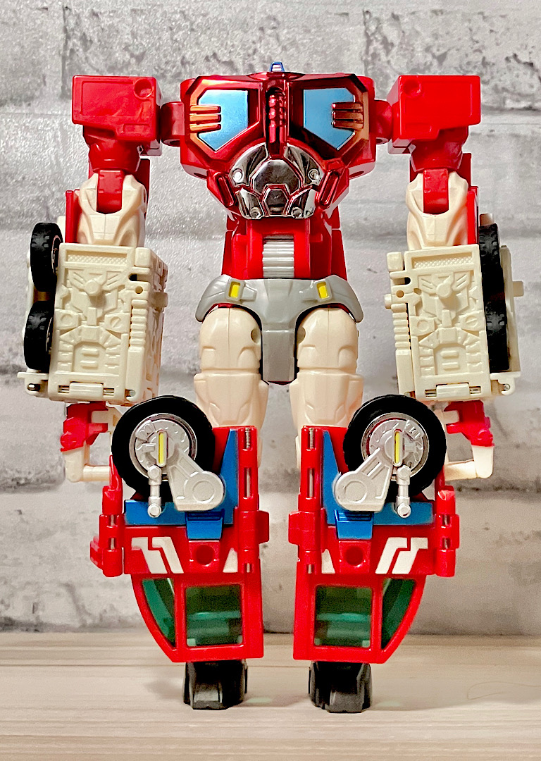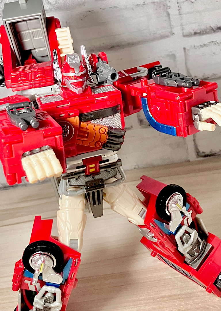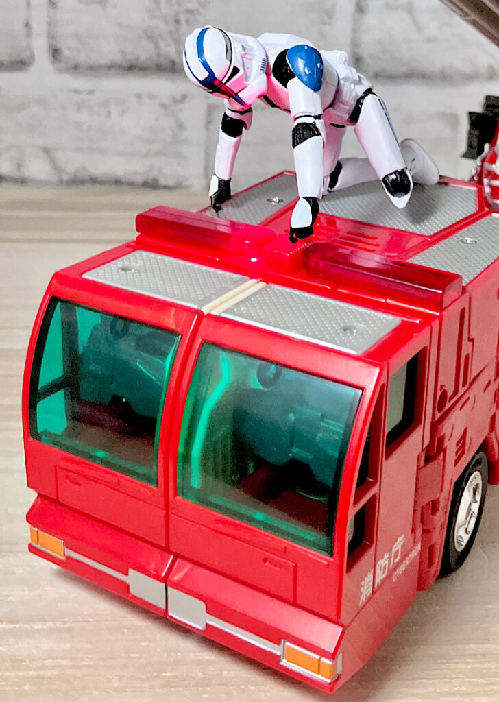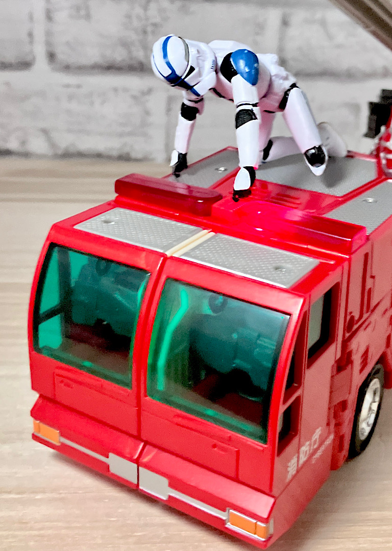 【ビークルモード】サイバトロンの熱血司令官。初めての消防車モチーフのコンボイ(オプ)で、後年にも影響を与えました。ビークルモードはサイズも大きくボリュームたっぷり。ただしパーツ同士の接続が甘くてポロポロ外れやすいのがちょっとストレスポイント。