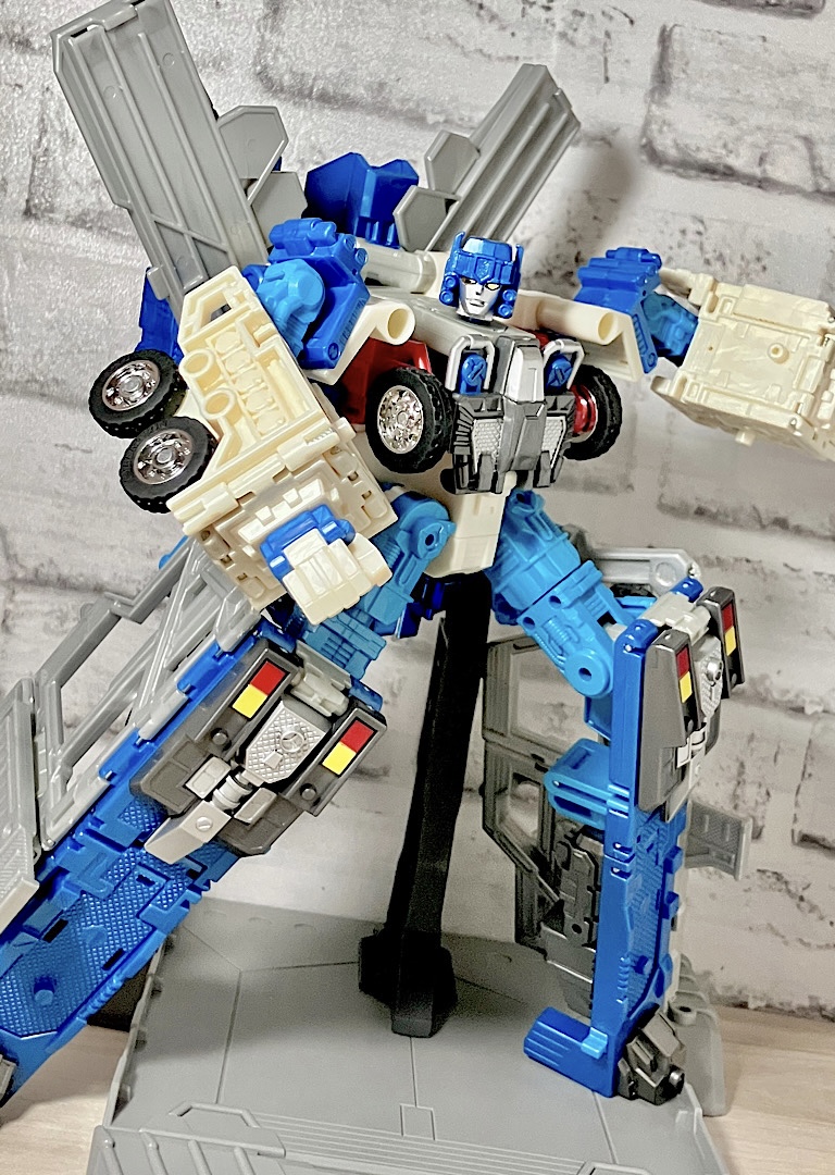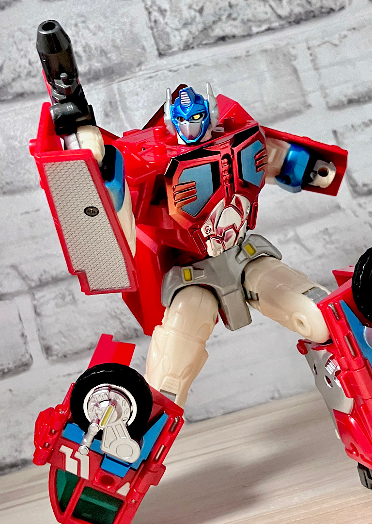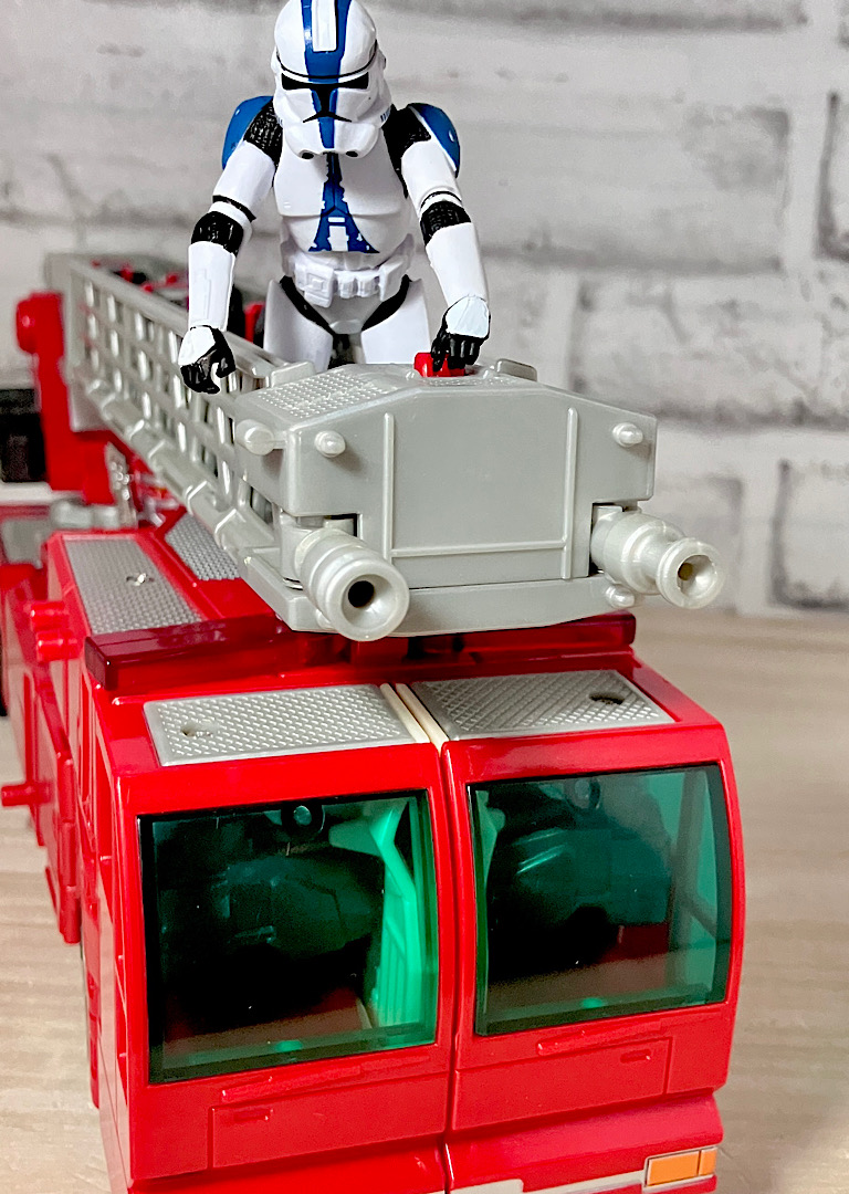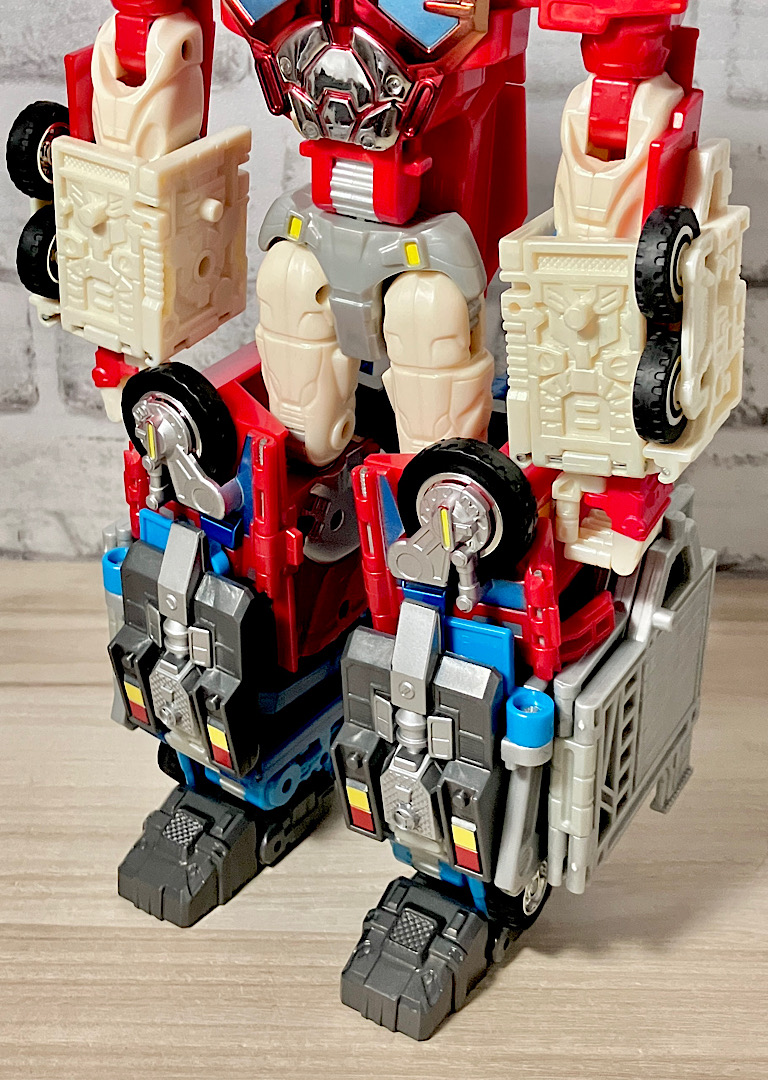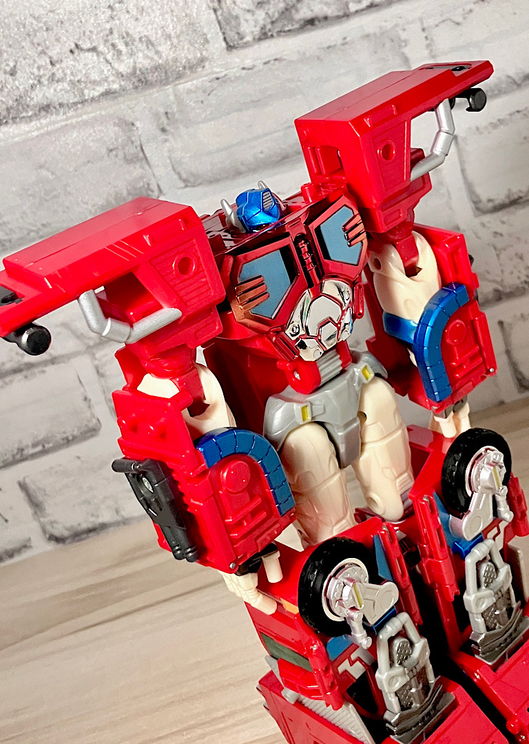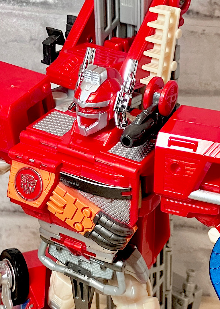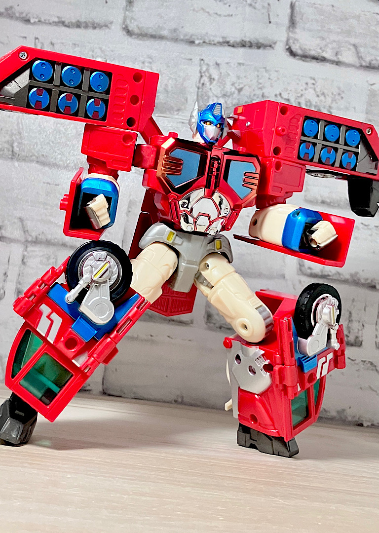 【ビークルモード】サイバトロンの熱血司令官。初めての消防車モチーフのコンボイ(オプ)で、後年にも影響を与えました。ビークルモードはサイズも大きくボリュームたっぷり。ただしパーツ同士の接続が甘くてポロポロ外れやすいのがちょっとストレスポイント。