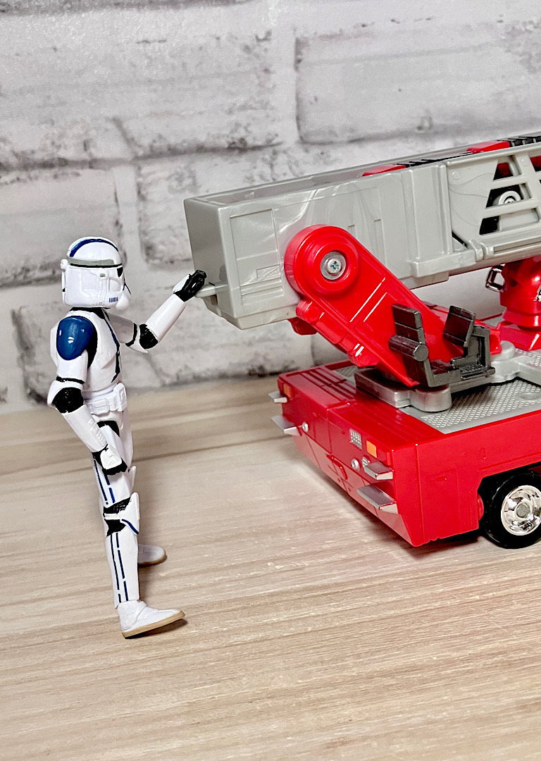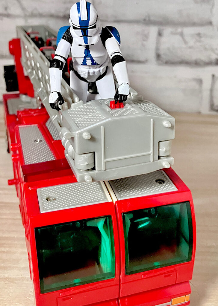 ハシゴの先端のボタンを押すと放水銃がパシャッと展開。