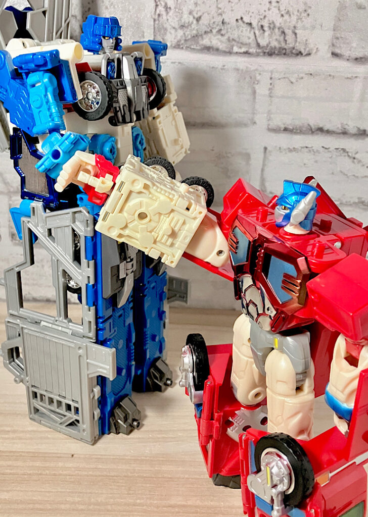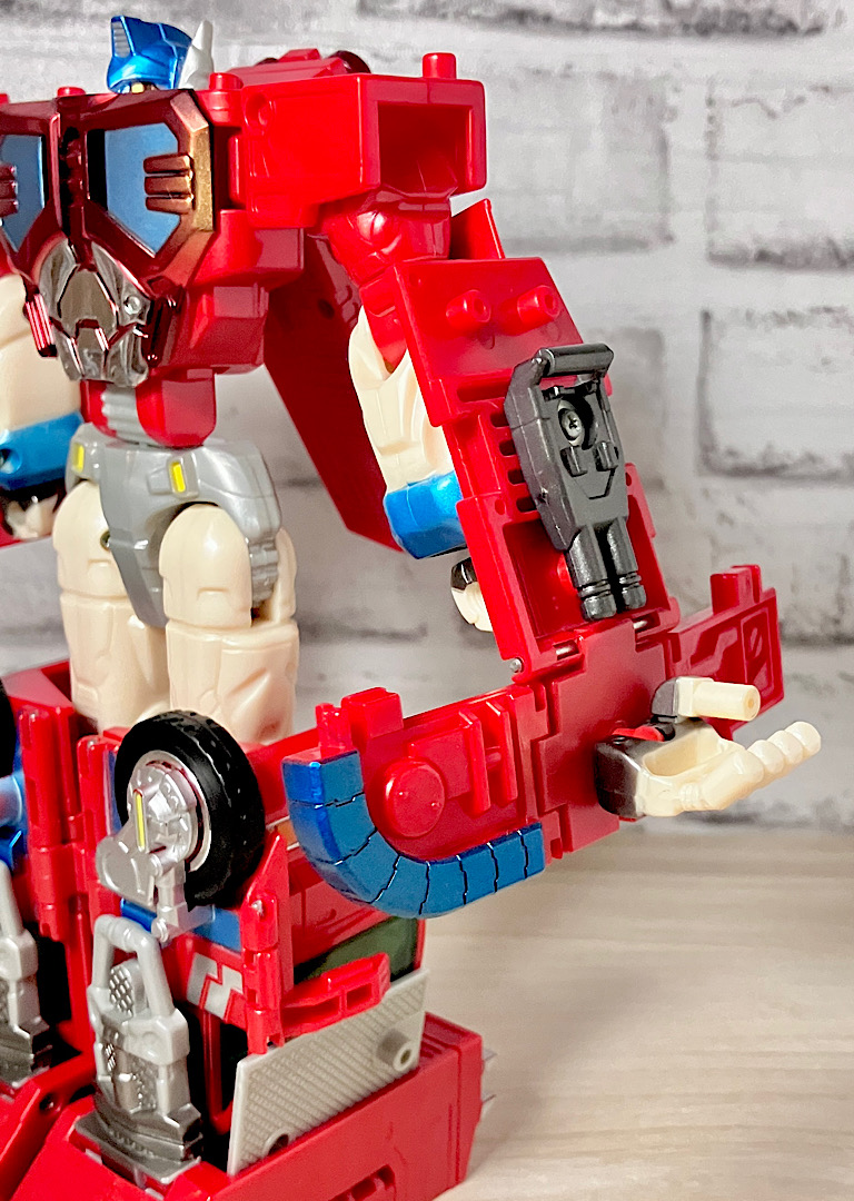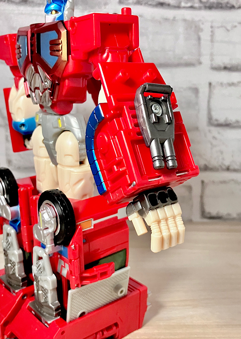 なんといってもまず握手から始まるのが最大のおもしろポイント。マグナスの腕をパカっと展開して、裏返すようにファイヤーコンボイに装着します。