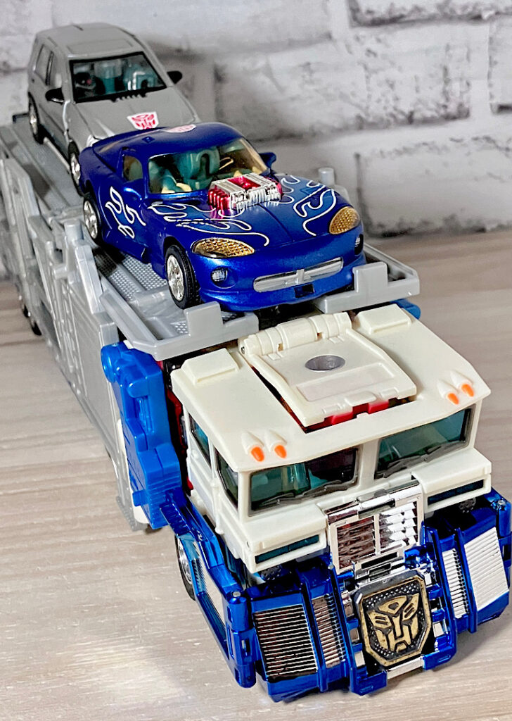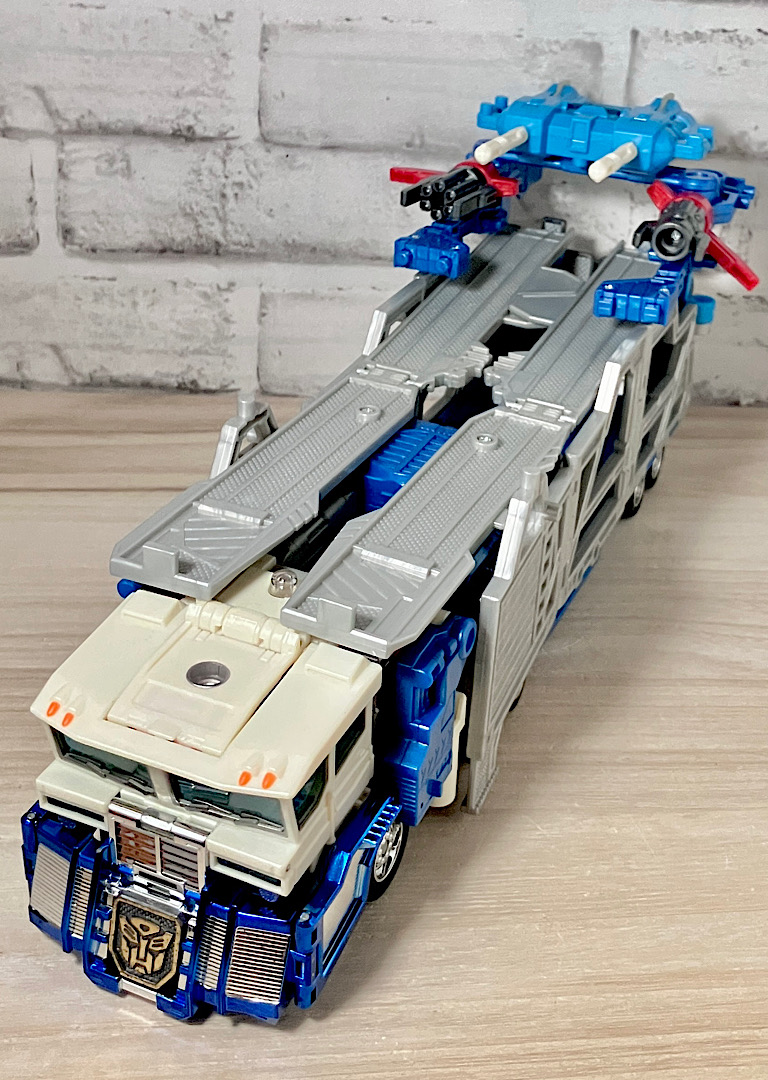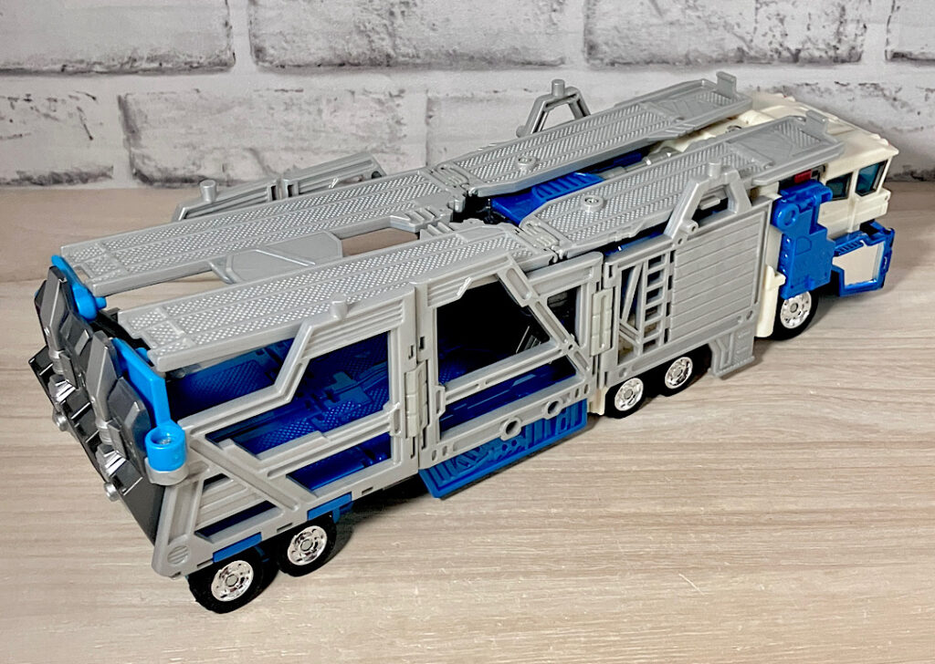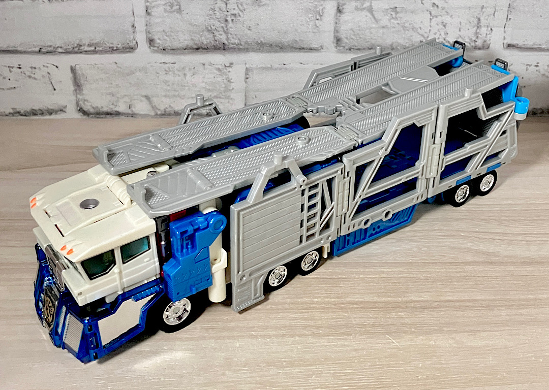 【ビークルモード】物語後半に登場したファイヤーコンボイの兄弟で、商品展開上の目玉アイテム。G1ウルトラマグナスをオマージュしたキャリアカーに変形します。ギラギラのイカついバンパーがカッコいい!