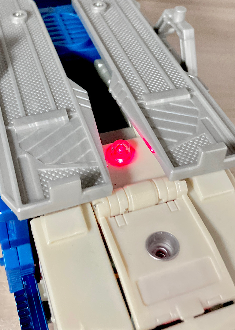 ライト&サウンドはこんなところが光ります。ただしボタンは押しづらいところにあり、ビークルモードで鳴らすのはあまり想定されていない模様。