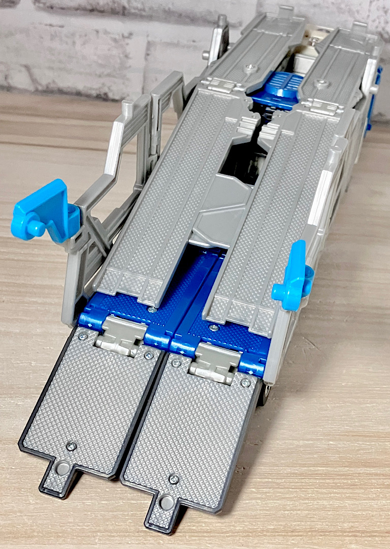 キャリア部分は実際に車を乗せることが可能。ちゃんとスロープを下げられるのがこだわりポイントで、「くるまごっこ」がはかどります。