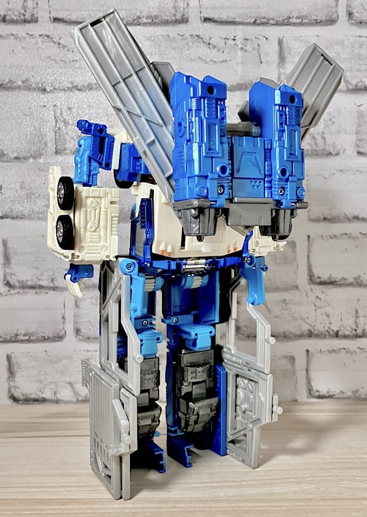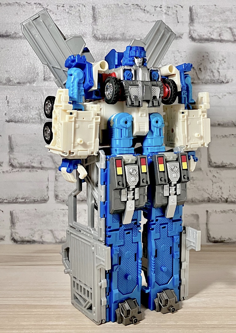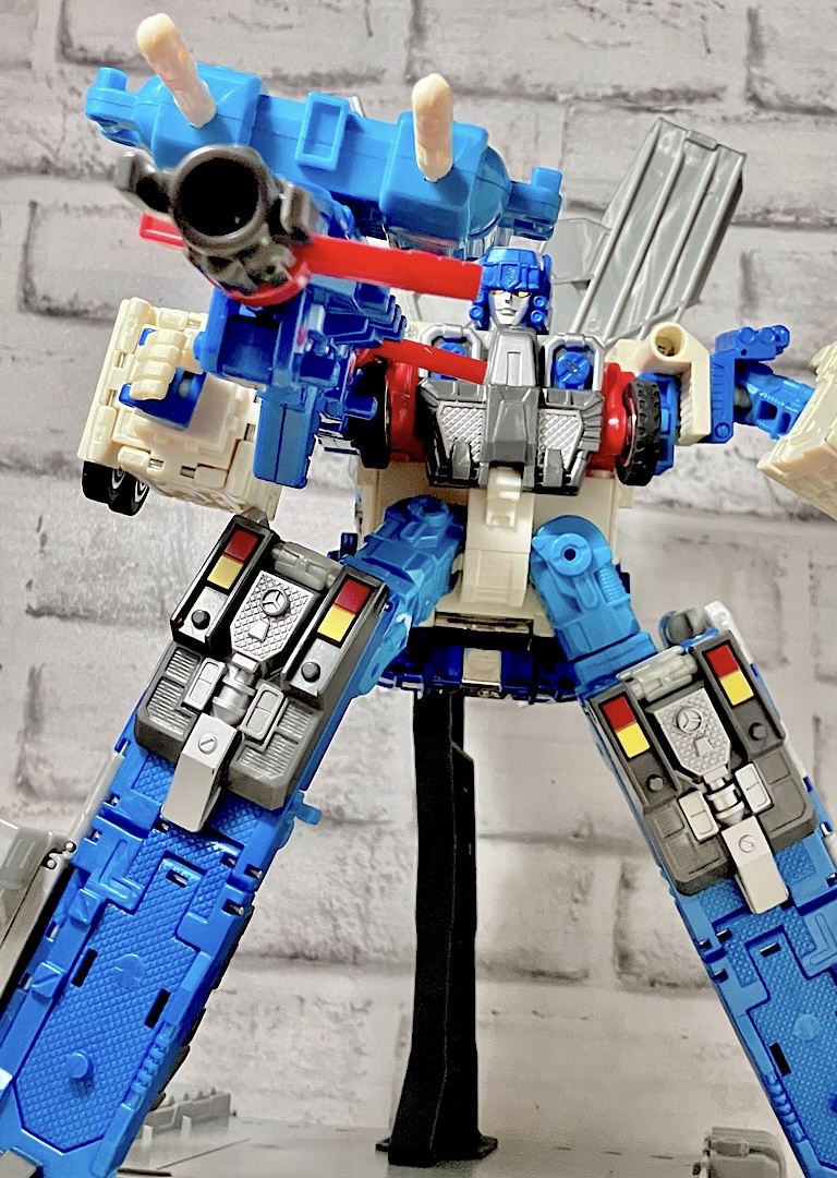 【ロボットモード】ファイヤーコンボイと対をなすブルーのカラーリングがクールなゴッドマグナス。脚の裏がスカスカなのと、上半身に重量があって不安定なのは複雑なギミックのしわ寄せということで。