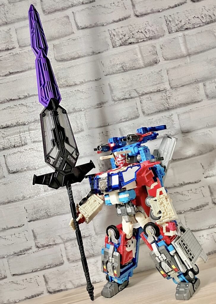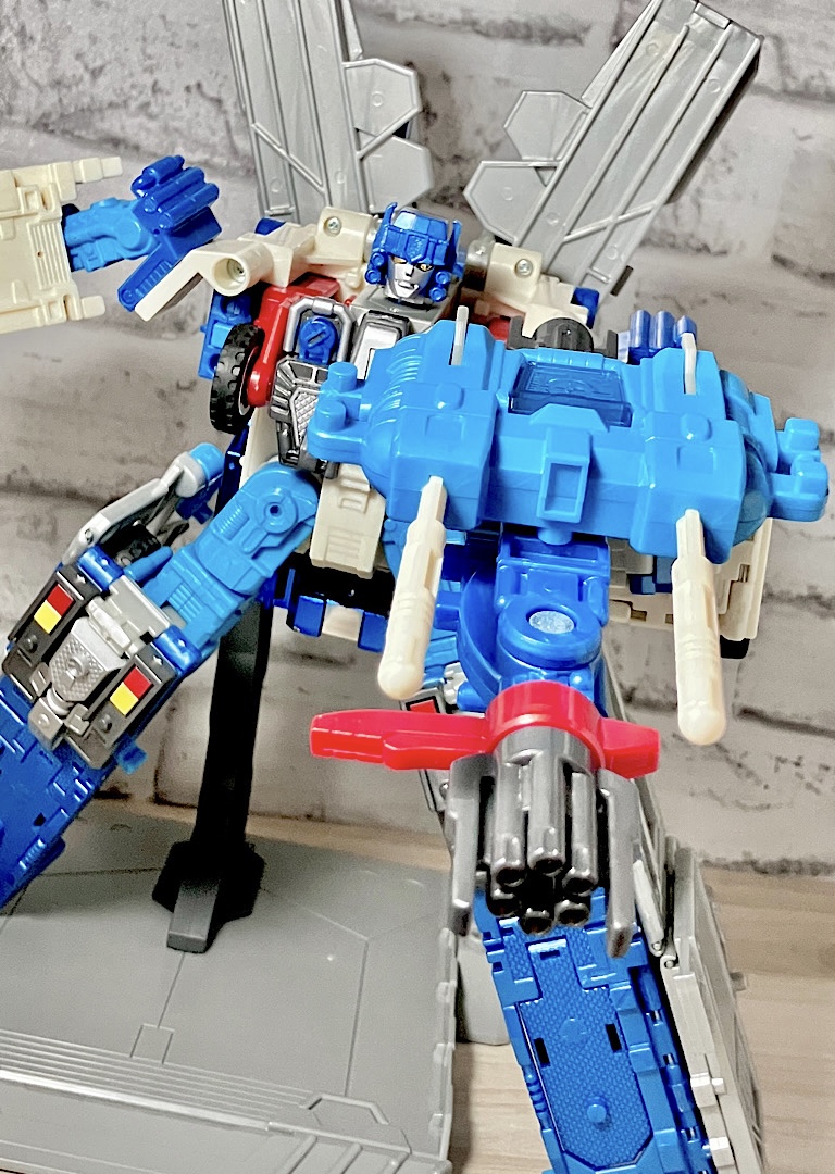 関節可動はちゃんとあるのですが、ポーズを付けるとまともに立てなくなるのが欠点。レガシー版オメガプライムにスタンドが付いていたので、それを借りてきました。