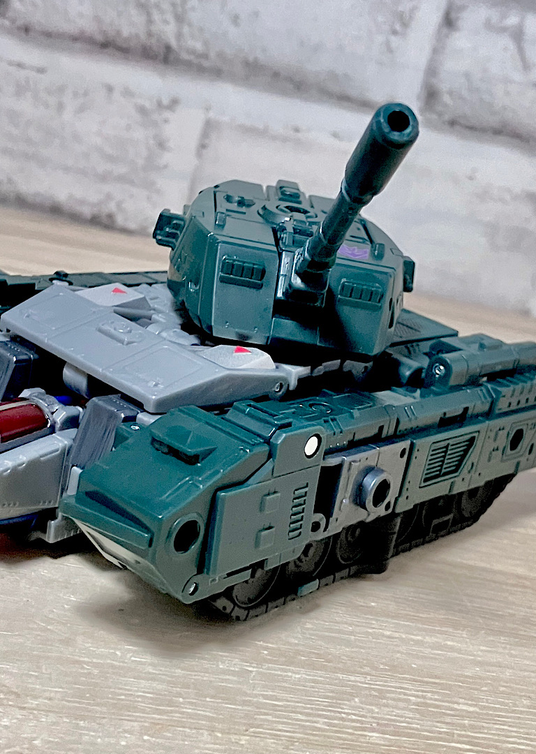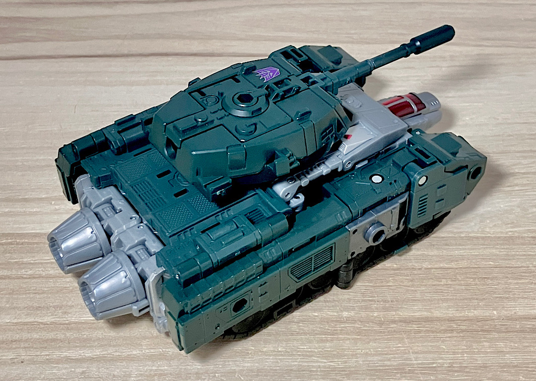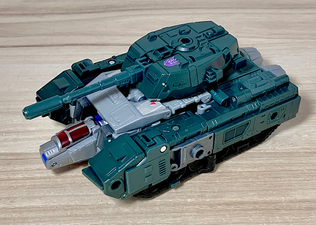 【ビークルモード2】オーバーチャージはさらに戦車に変形。カラーもガラリと変わってカーキ色になります。これは戦車らしくてイイですね。