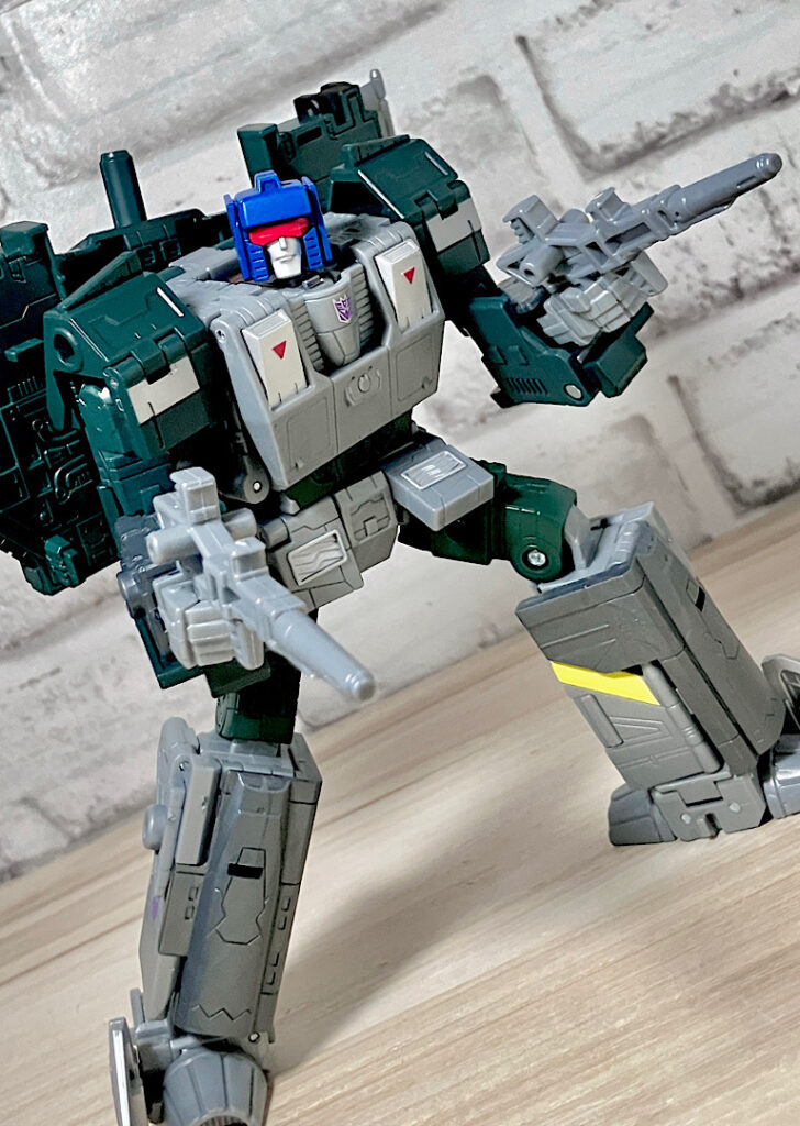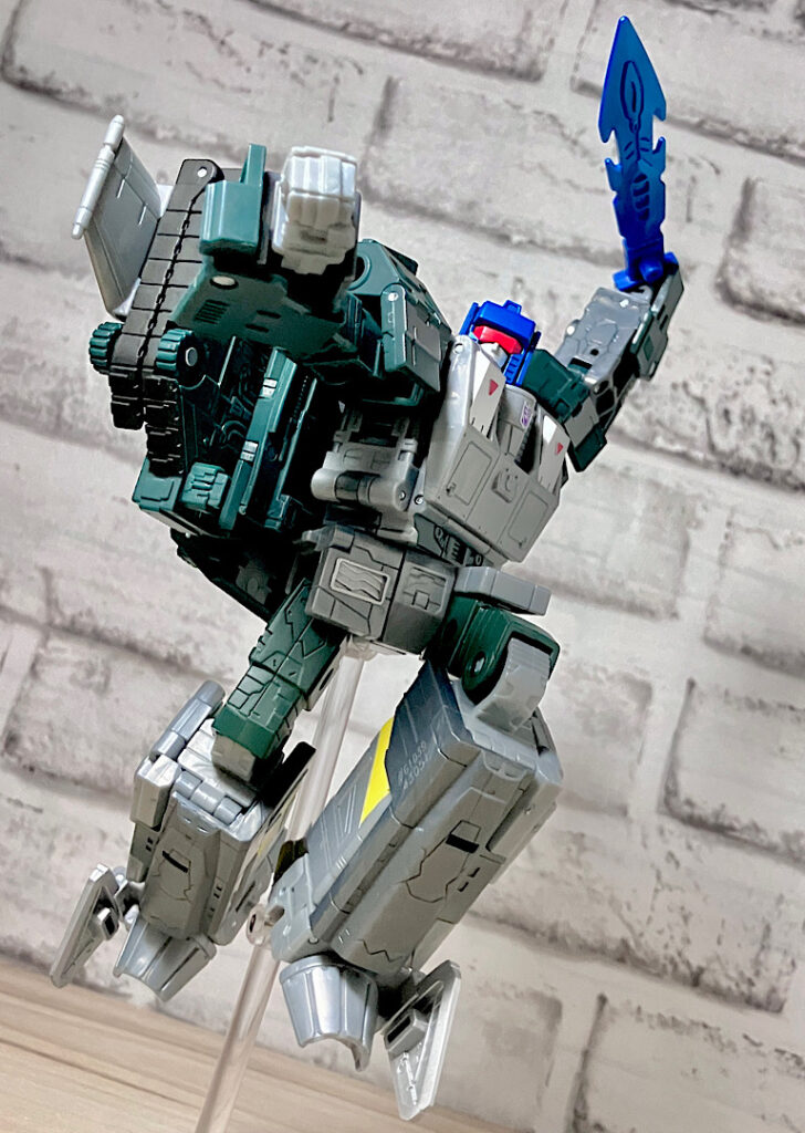 【ロボットモード】ブリッツウイングをカーキとグレーのミリタリーカラーに変更。この型はG1ライクな箱ロボ感が素晴らしいほか、中身がぎっちり詰まってズシリと重いのが特徴です。