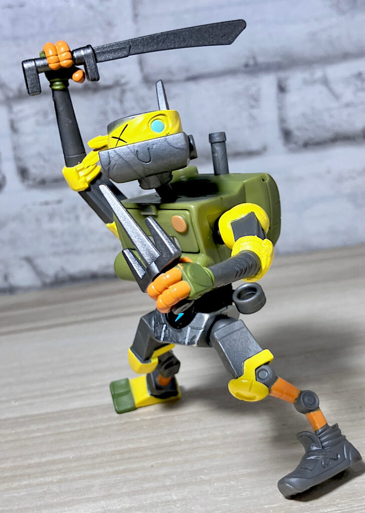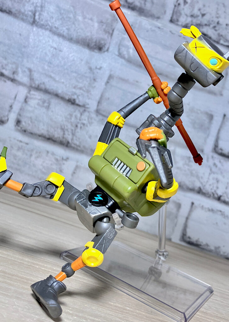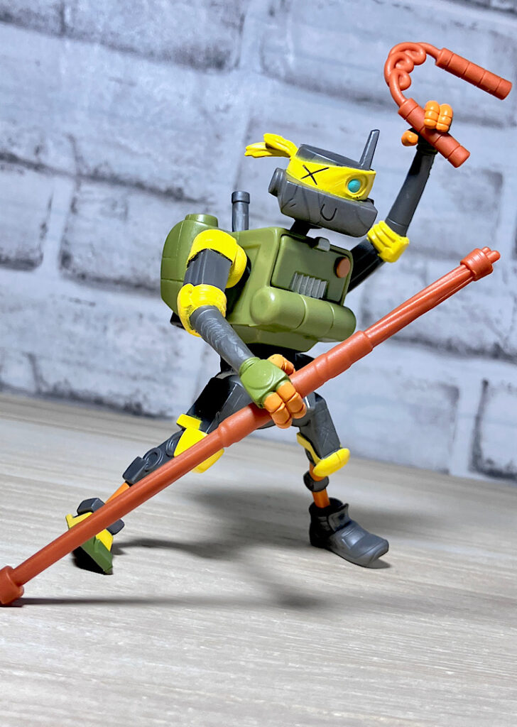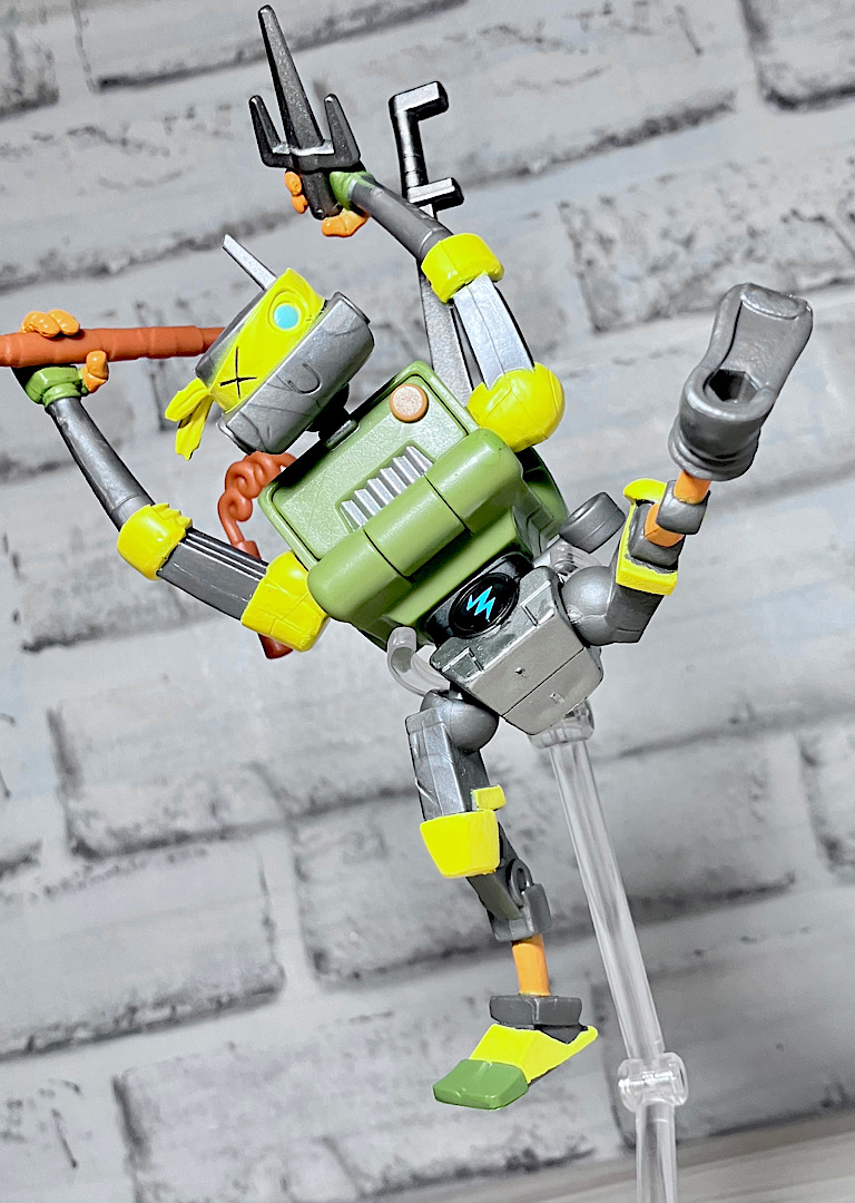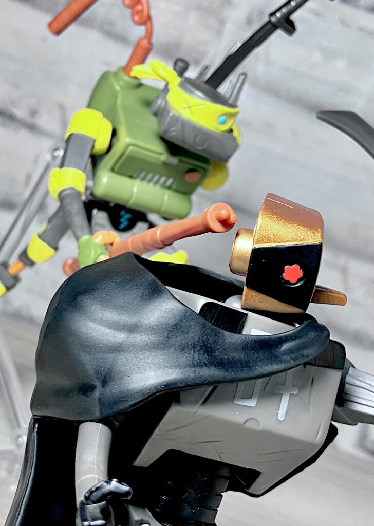 ヌンチャクと棒も付属。マイキーとドナの得意武器です。ロボットらしく4人の武器を使いこなすメタルヘッド。ちなみにどの武器も機械系のガラクタでできたようなデザインをしているのが芸コマ。