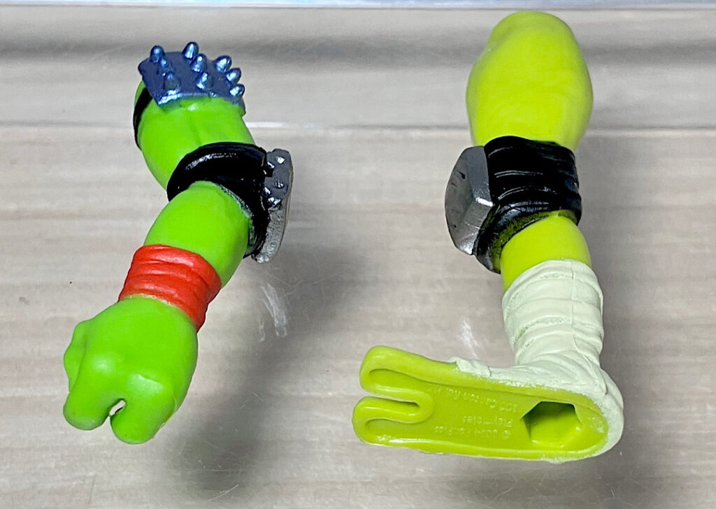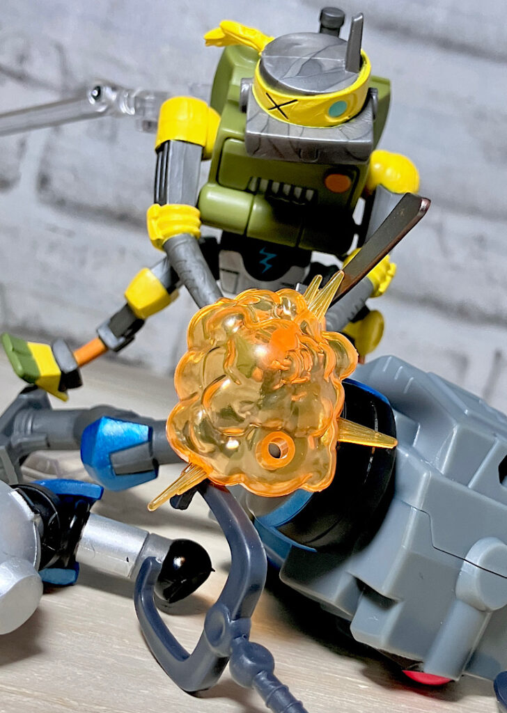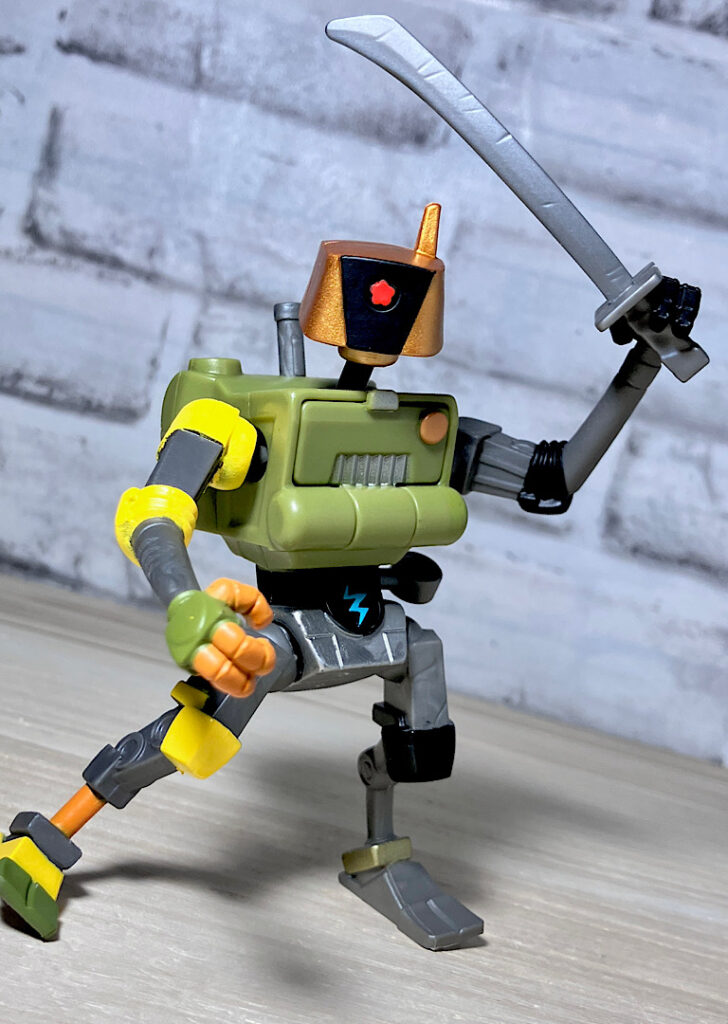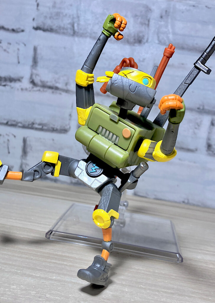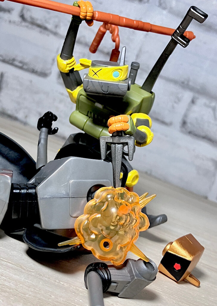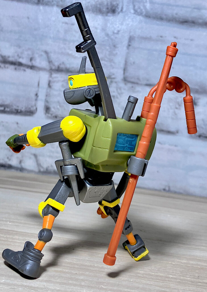 ヌンチャクと棒も付属。マイキーとドナの得意武器です。ロボットらしく4人の武器を使いこなすメタルヘッド。ちなみにどの武器も機械系のガラクタでできたようなデザインをしているのが芸コマ。