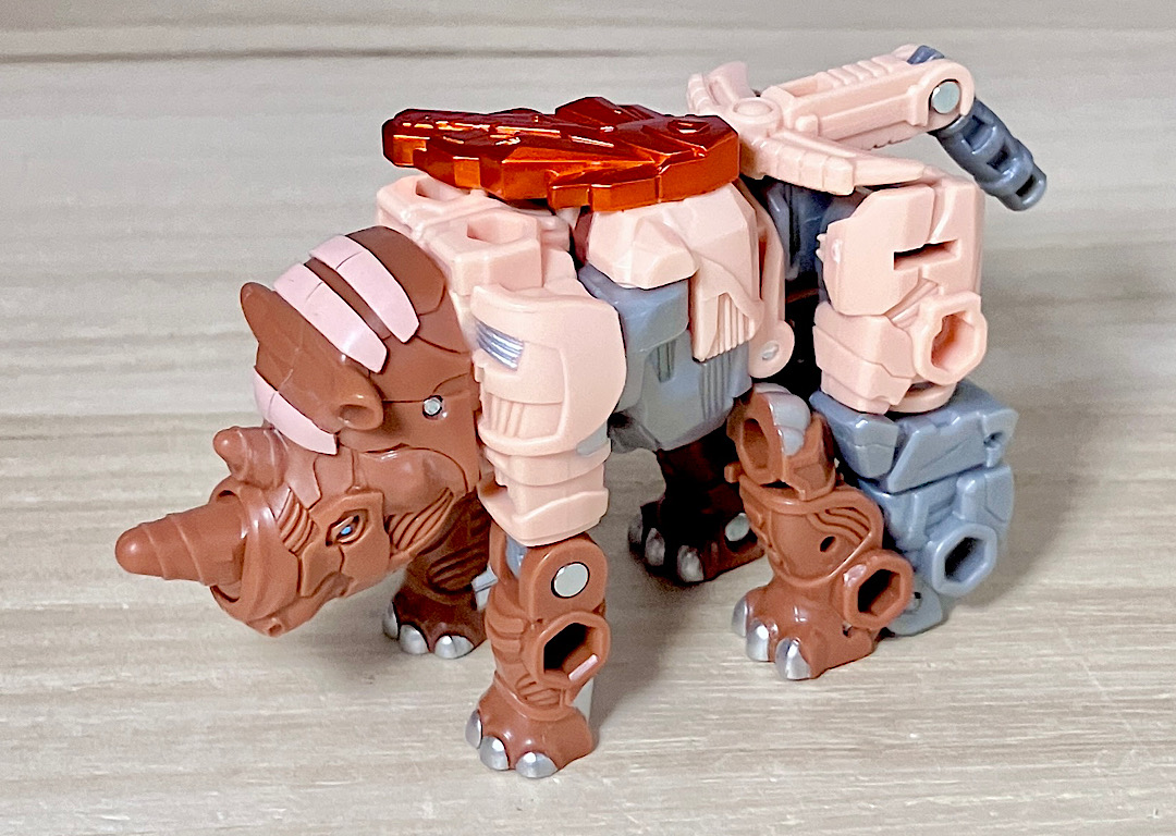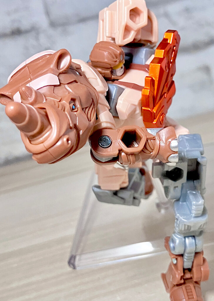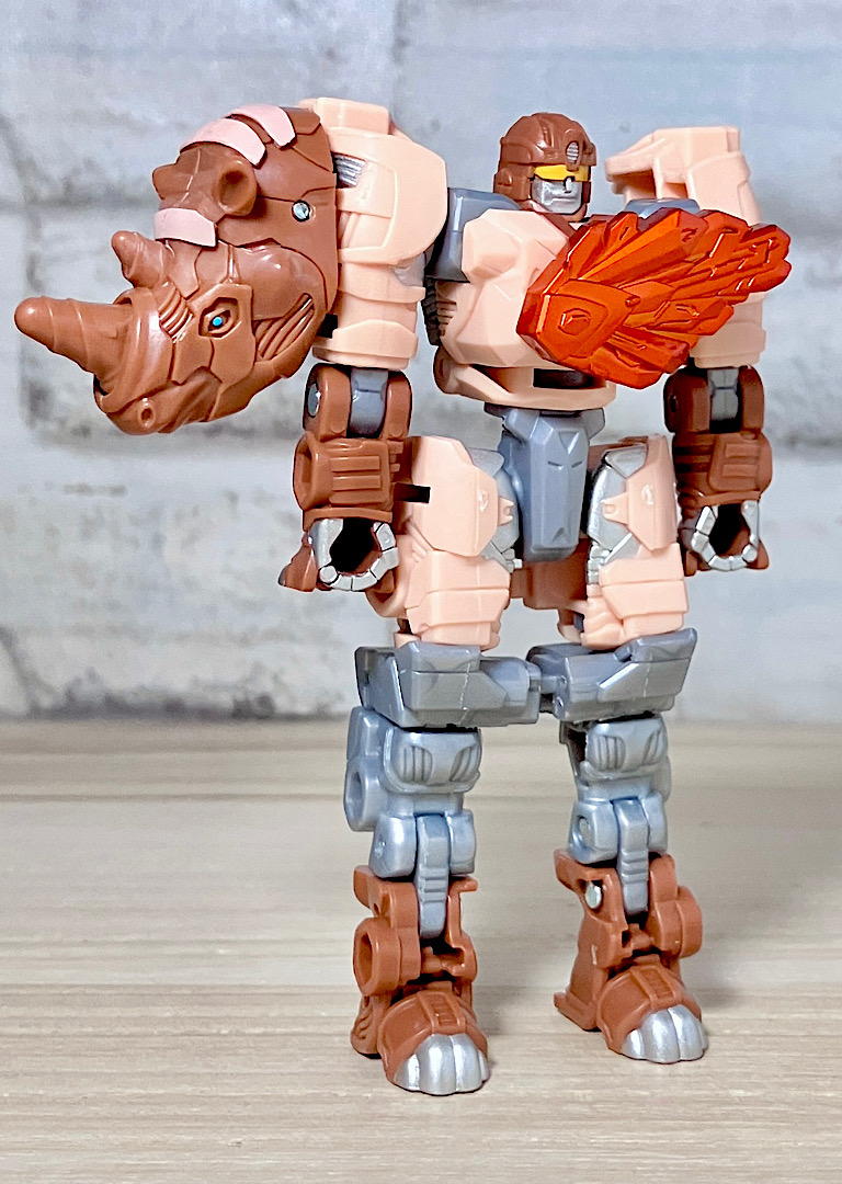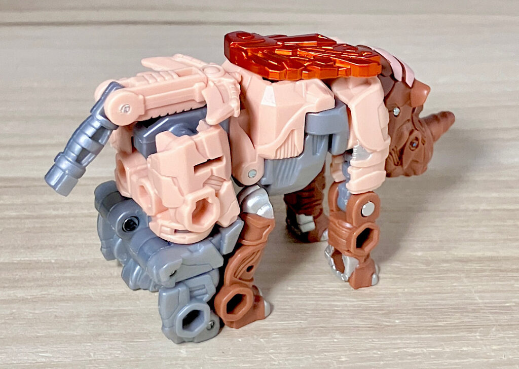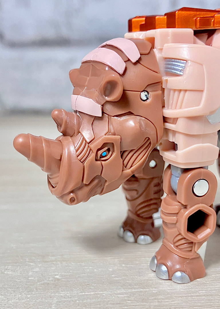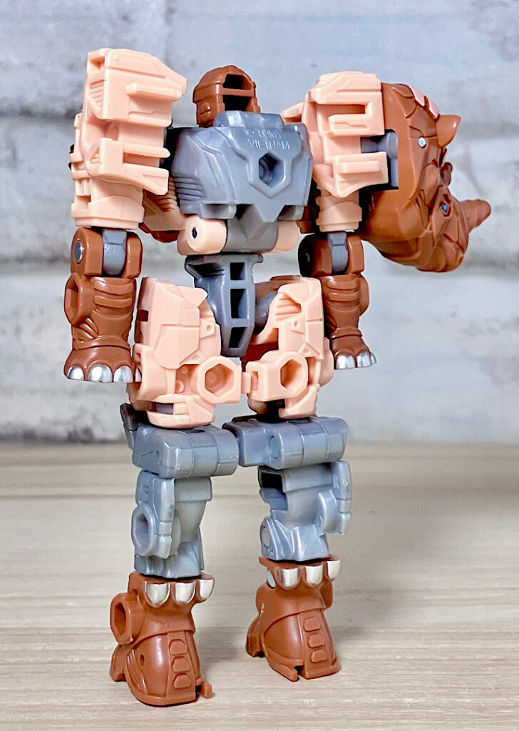 【ロボットモード】素体にサイの頭とエナジーを取り付けてロボットモード完成。大地属性ですが、カラーはベージュがメインなのでまるで裸のプロレスラーみたいに見えます。奇しくも同じサイモチーフのストラングルホールドを連想させるのはネットでも話題に。
