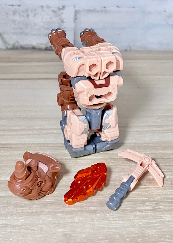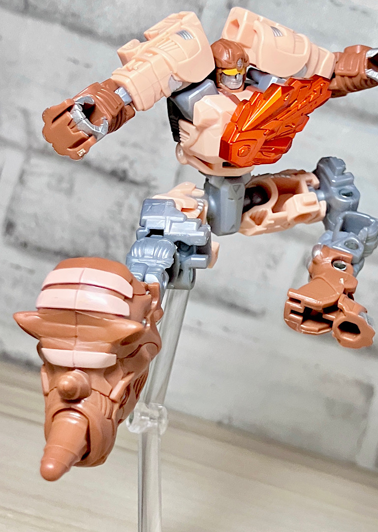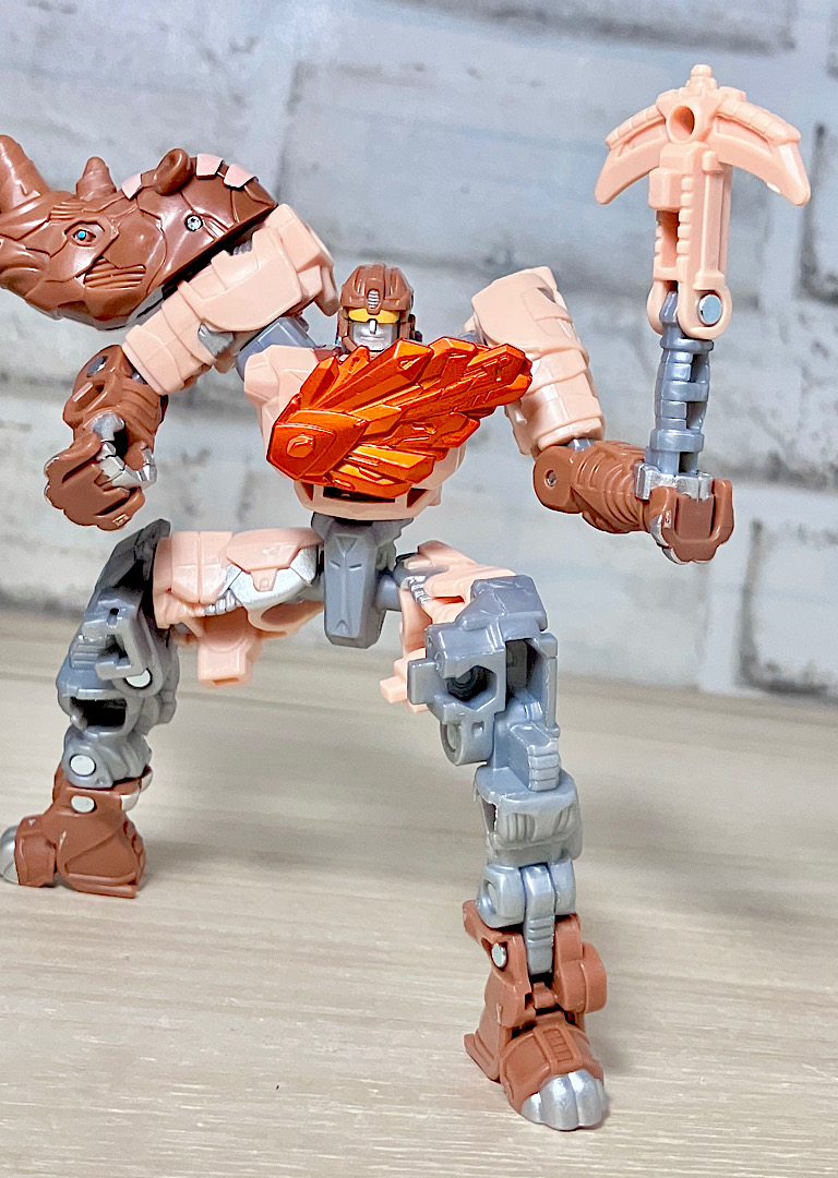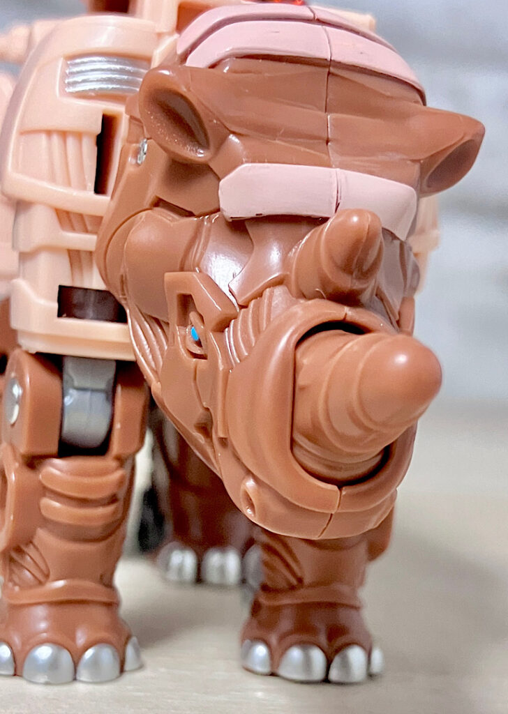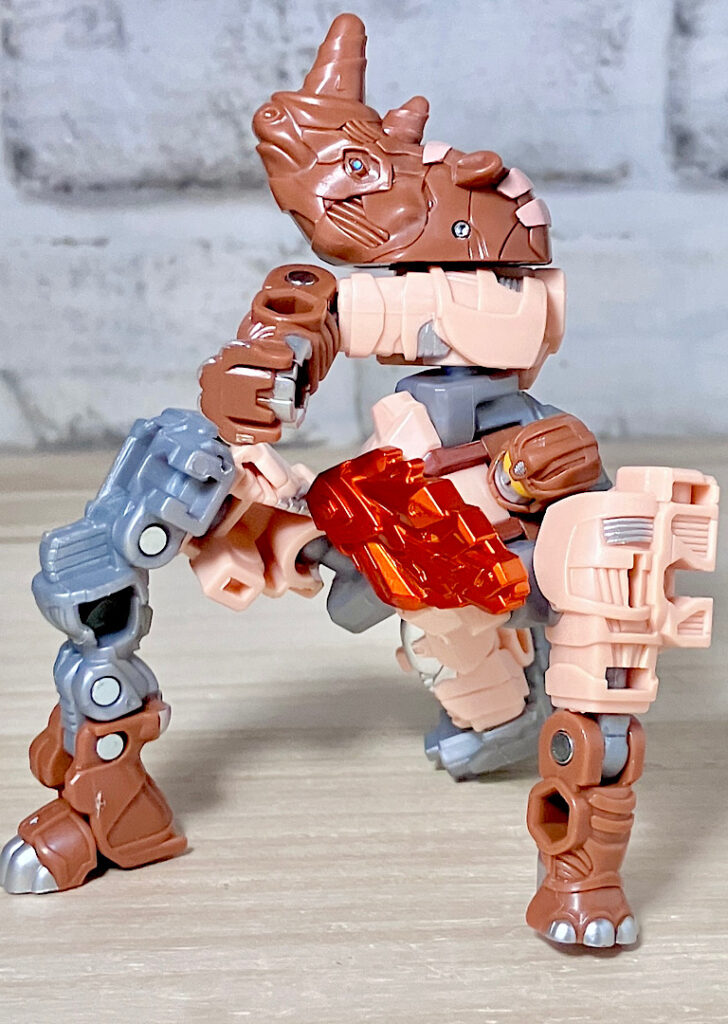 【ロボットモード】素体にサイの頭とエナジーを取り付けてロボットモード完成。大地属性ですが、カラーはベージュがメインなのでまるで裸のプロレスラーみたいに見えます。奇しくも同じサイモチーフのストラングルホールドを連想させるのはネットでも話題に。