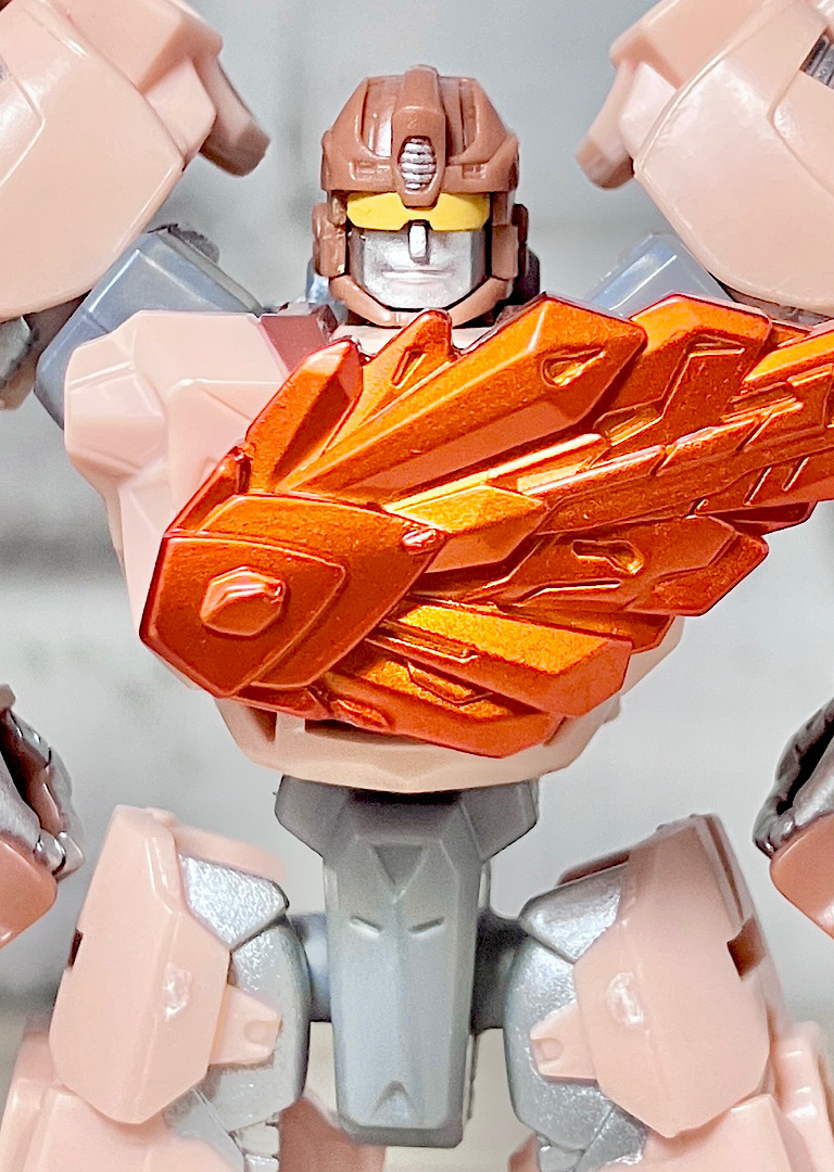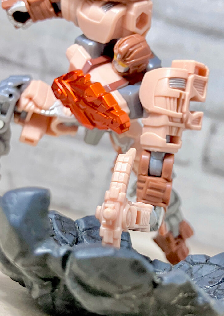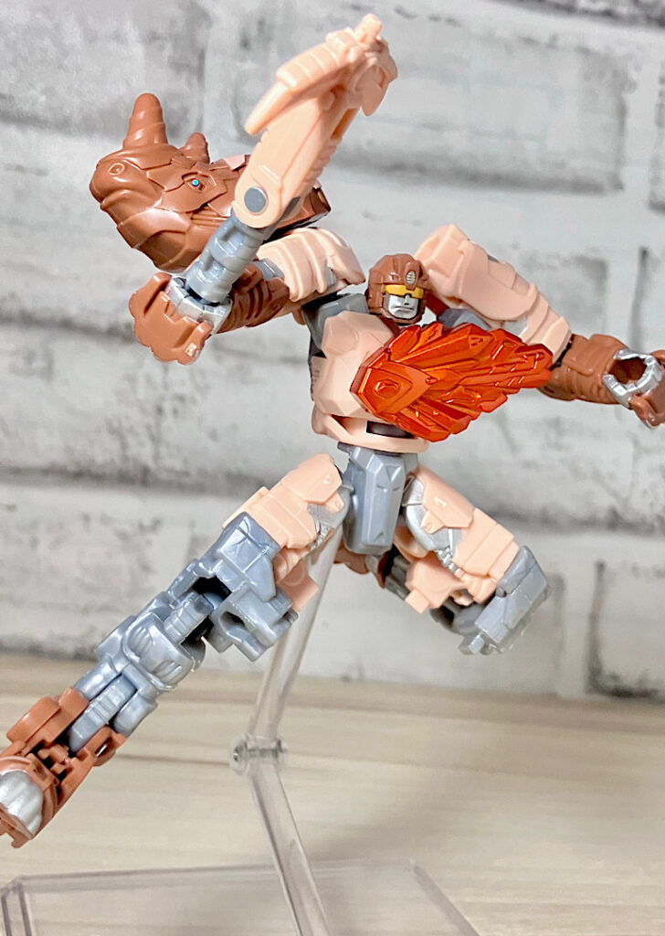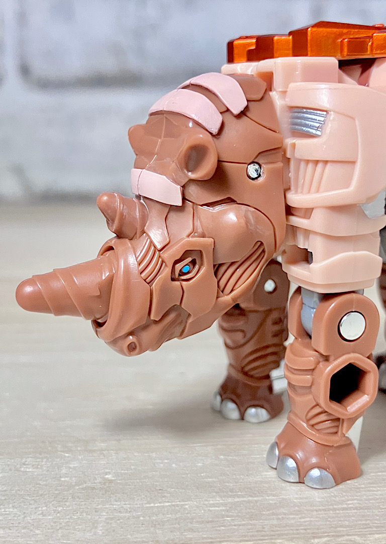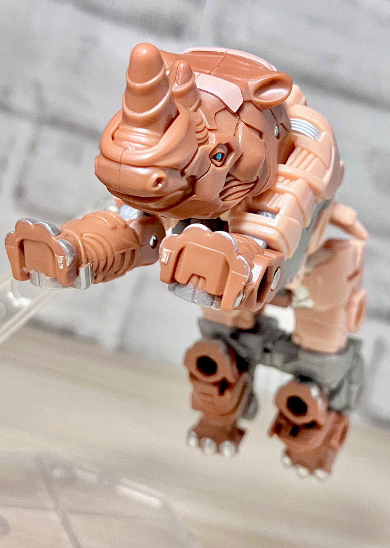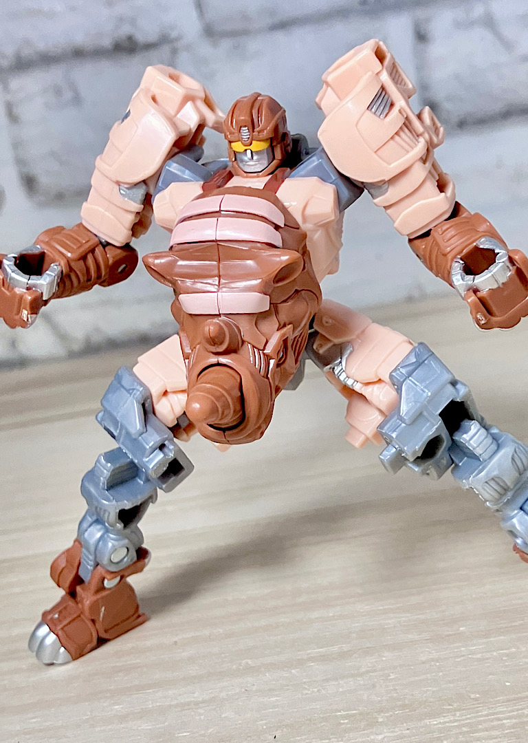 【ロボットモード】素体にサイの頭とエナジーを取り付けてロボットモード完成。大地属性ですが、カラーはベージュがメインなのでまるで裸のプロレスラーみたいに見えます。奇しくも同じサイモチーフのストラングルホールドを連想させるのはネットでも話題に。