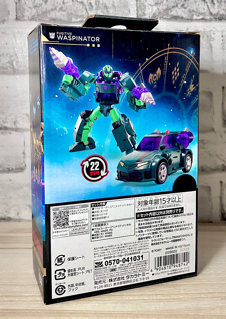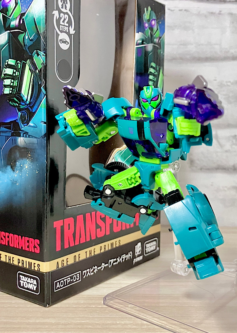 【パッケージ】アニメイテッドに登場。もともとの名前はワスプ。バンブルビーの訓練生時代の同僚でなにかと意地悪をしていましたが、いざこざの中でディセプティコンのスパイ容疑をかけられ逃亡。その発端となったバンブルビーを恨み、執拗に襲撃。最終的にはワスピネーターとして生まれ変わりました。