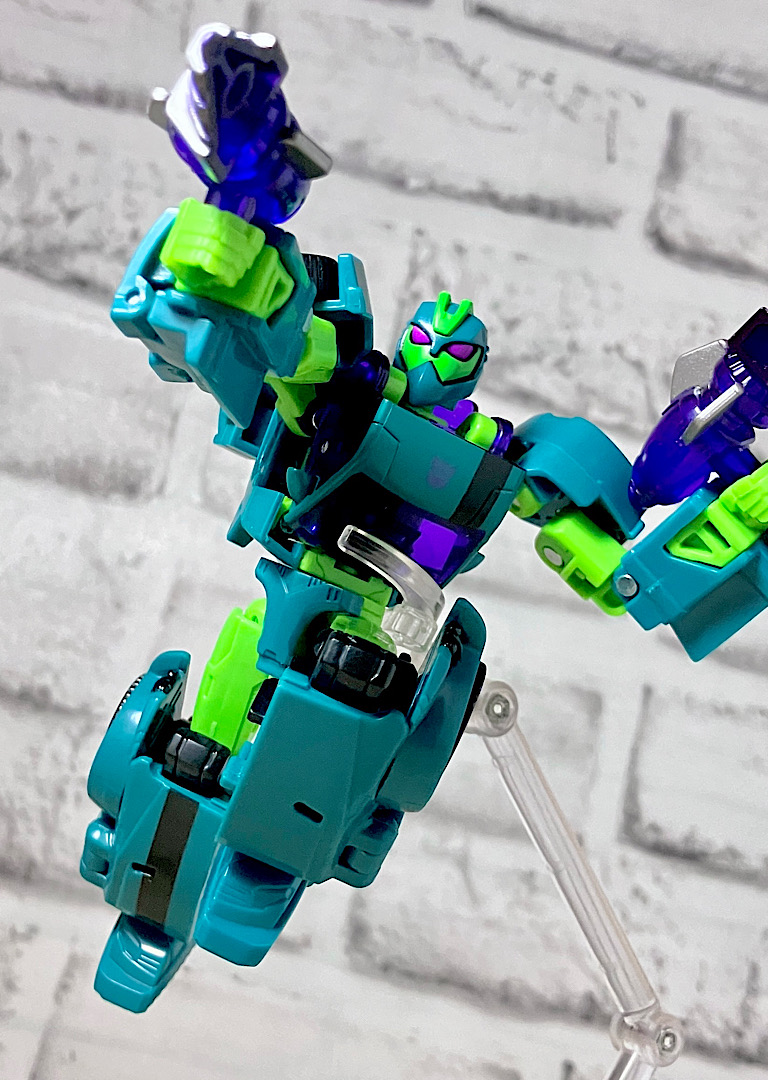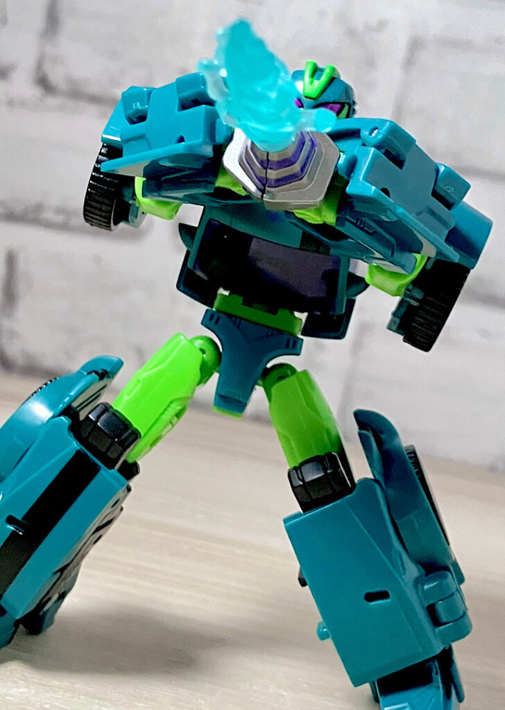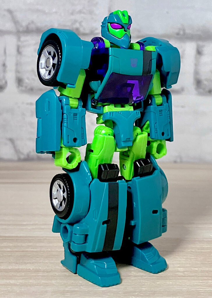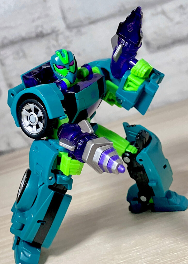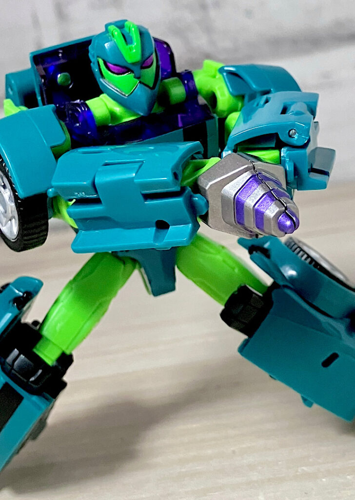 【ロボットモード】レガシーユナイテッド版バンブルビーのリデコ。アニメイテッド展開時は企画されていながらキャンセルとなった幻のアイテムだったので、まさに待望の初商品化というわけです。緑色のバンブルビーなんて、新鮮でなかなか良いですよね。