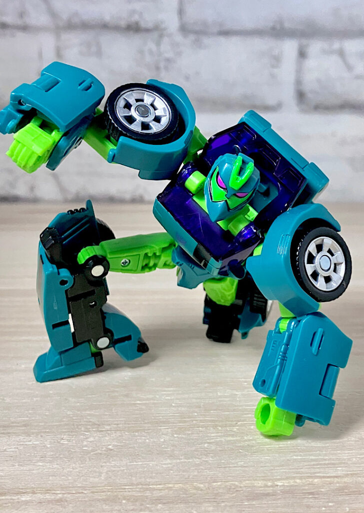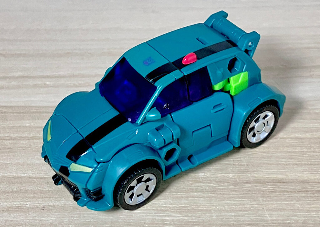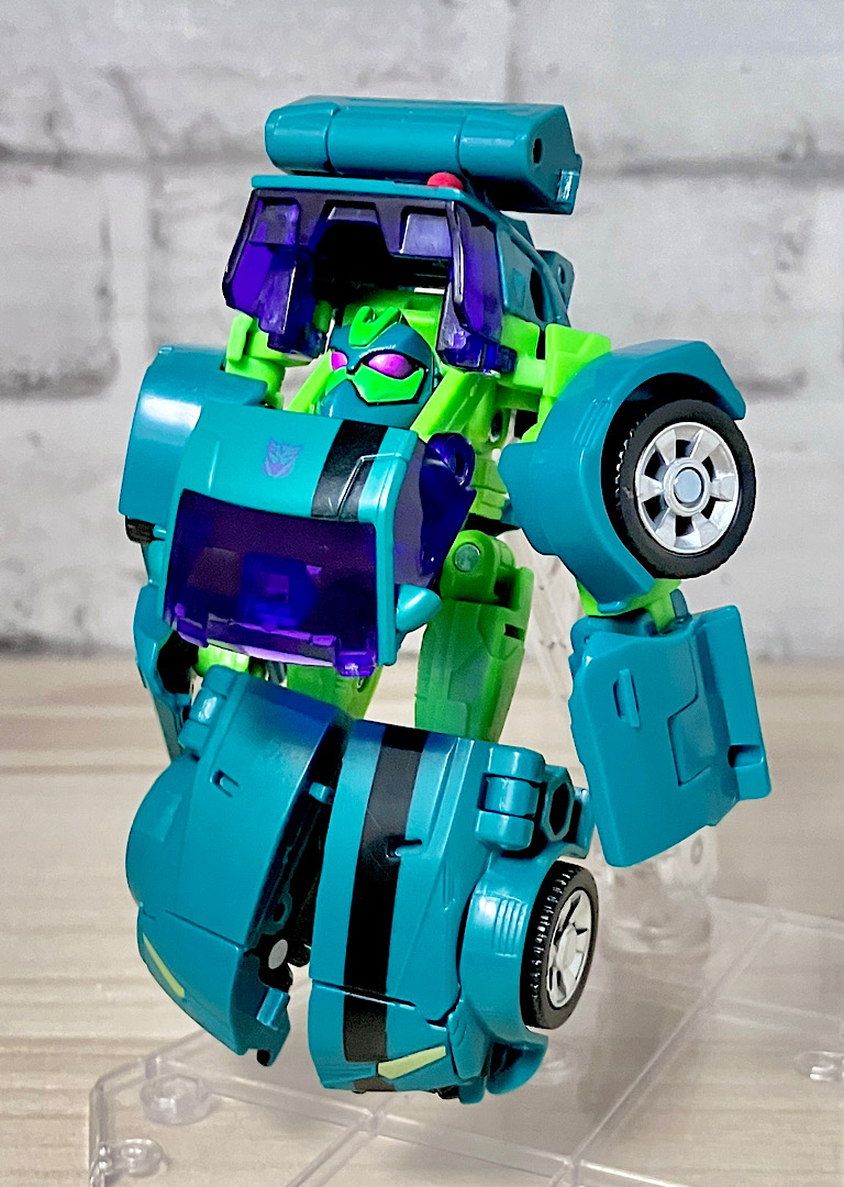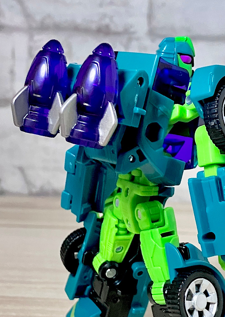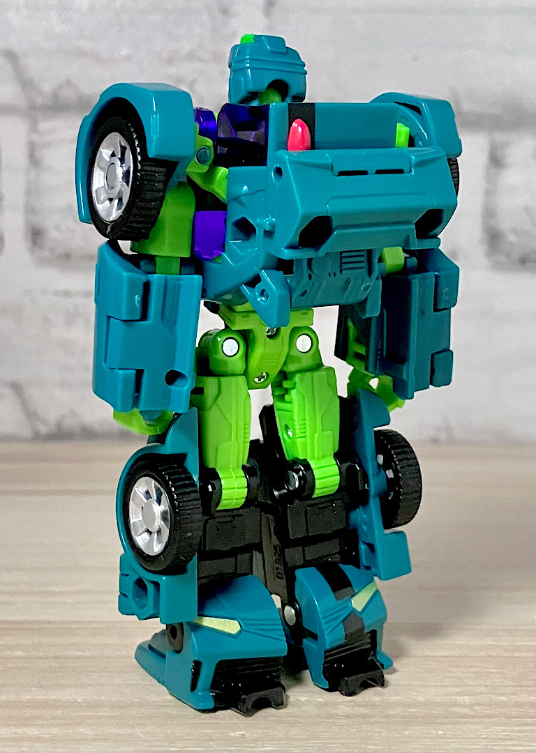 【ロボットモード】レガシーユナイテッド版バンブルビーのリデコ。アニメイテッド展開時は企画されていながらキャンセルとなった幻のアイテムだったので、まさに待望の初商品化というわけです。緑色のバンブルビーなんて、新鮮でなかなか良いですよね。