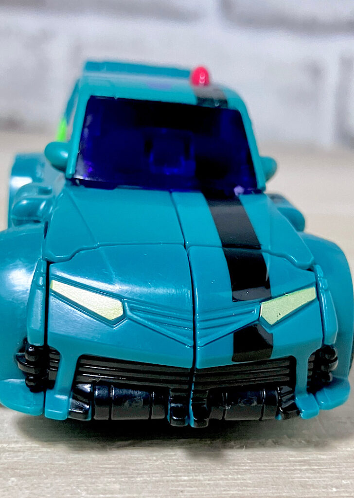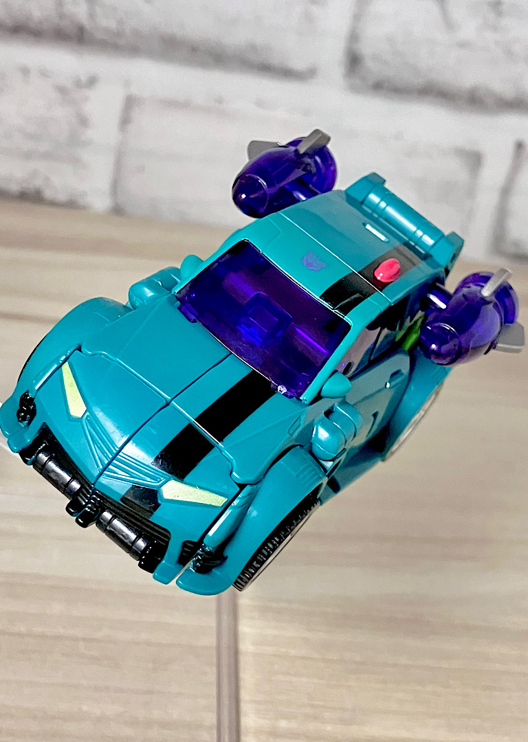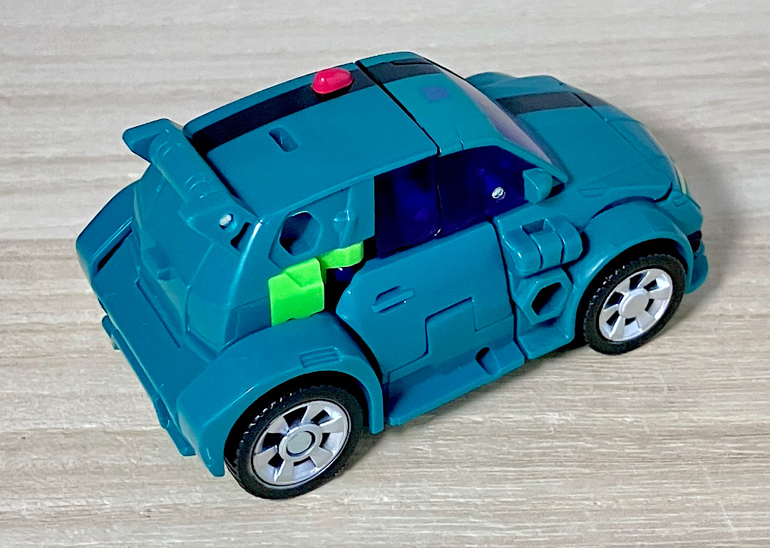 【ビークルモード】ディフォルメされた警察車両に変形。もちろんバンブルビーのリカラーです。コロンとしたフォルムがいかにもアニメイテッドなよくできたビークルだと思います。クリアパープルの窓も良いですね。