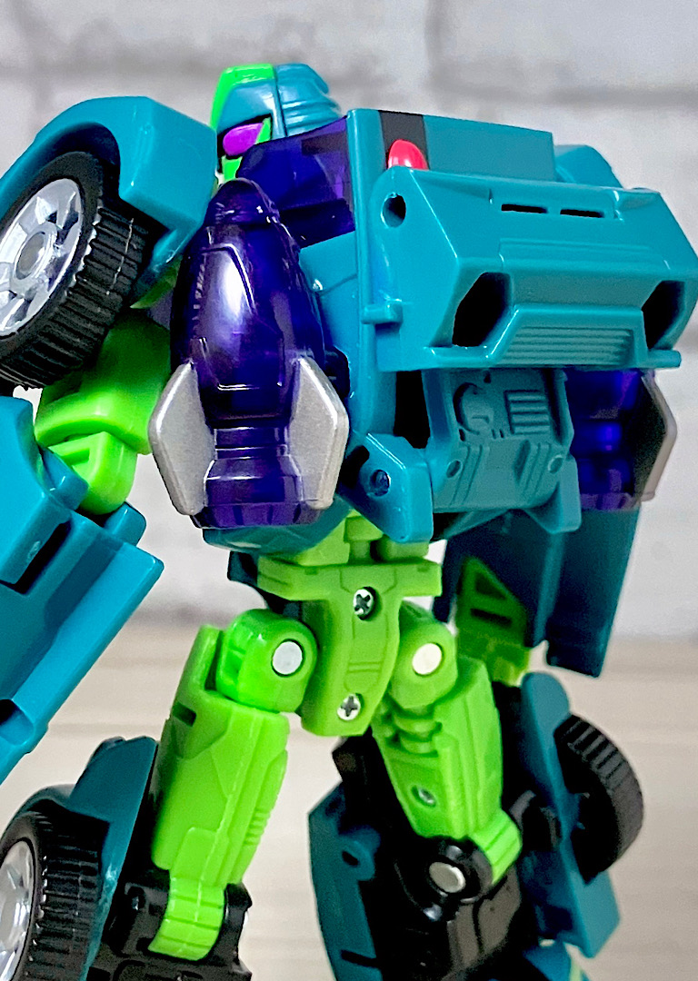 コロンとしたビークルとスラッとしたロボを両立するため、アニメイテッドビーは今までいろいろ伸縮の工夫をしてきたわけですが、この型はわりと簡単な方法でそれを実現。胸パーツがダミーじゃないのもいいですね。大胆なパーツ移動に変形させてる感があってなかなか面白い方だと思います。