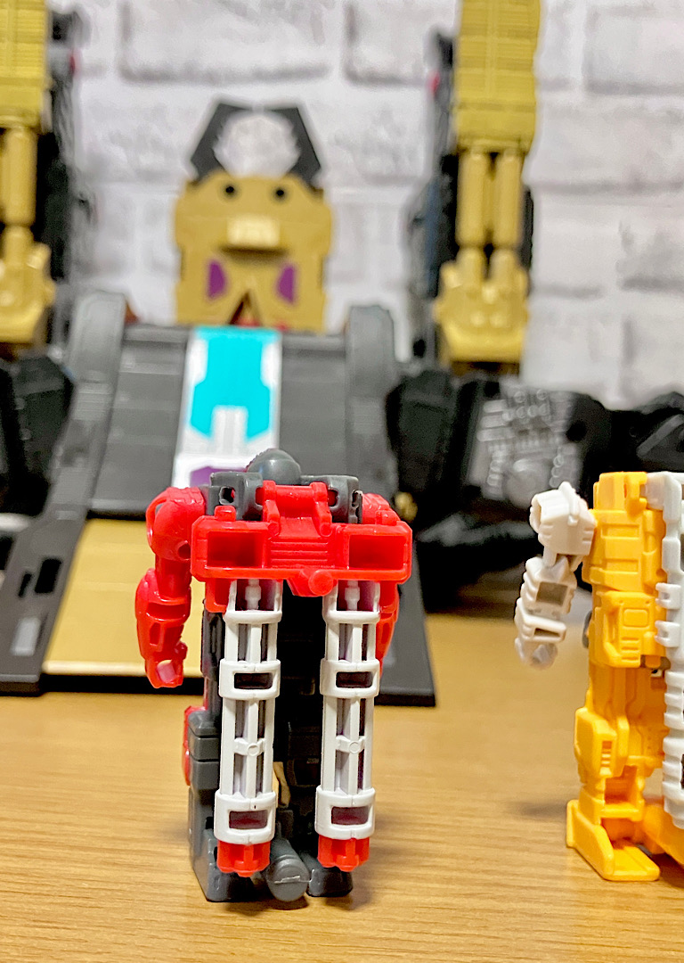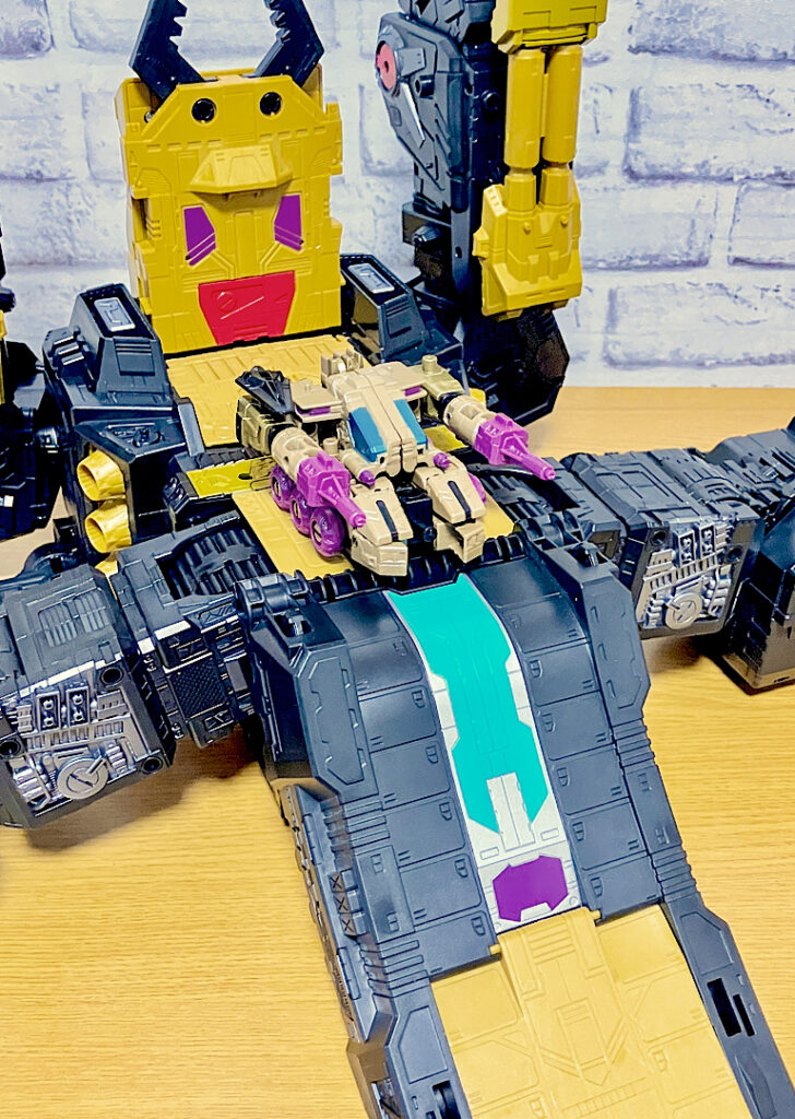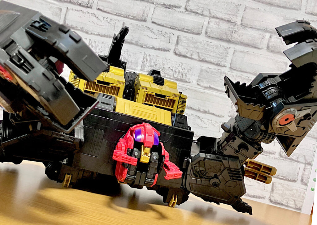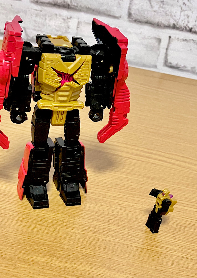 そしてブラックザラックは大中小の3段構えヘッドマスター。上記のヘッドマスターを、中間ロボのボディにヘッドオンさせます。