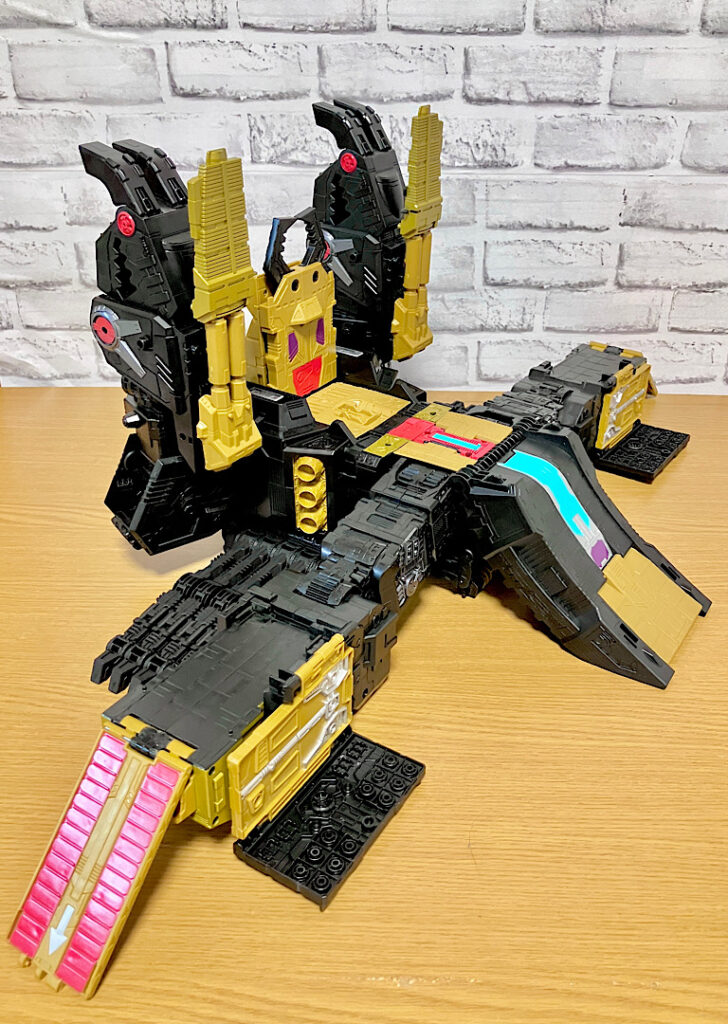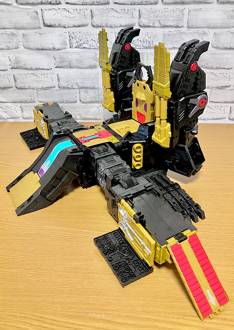 【基地モード】ブラックザラック基地モード。大きく横に広がったベースと3本のタワーにより、オルトモードからシルエットがガラッと変わりました。これまでのタイタンクラスの中でもかなり基地っぽい方だと思います。