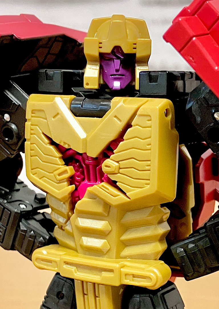【アップ】頭部は眼帯をしたかなり凶悪な表情。おそらく「トランスフォーマー Z」版ブラックザラックからのインスパイアと思われます。また胸には十字に大きな傷が追加され、かつて戦いに敗れた戦士だったという設定からの連想なんじゃないでしょうか?