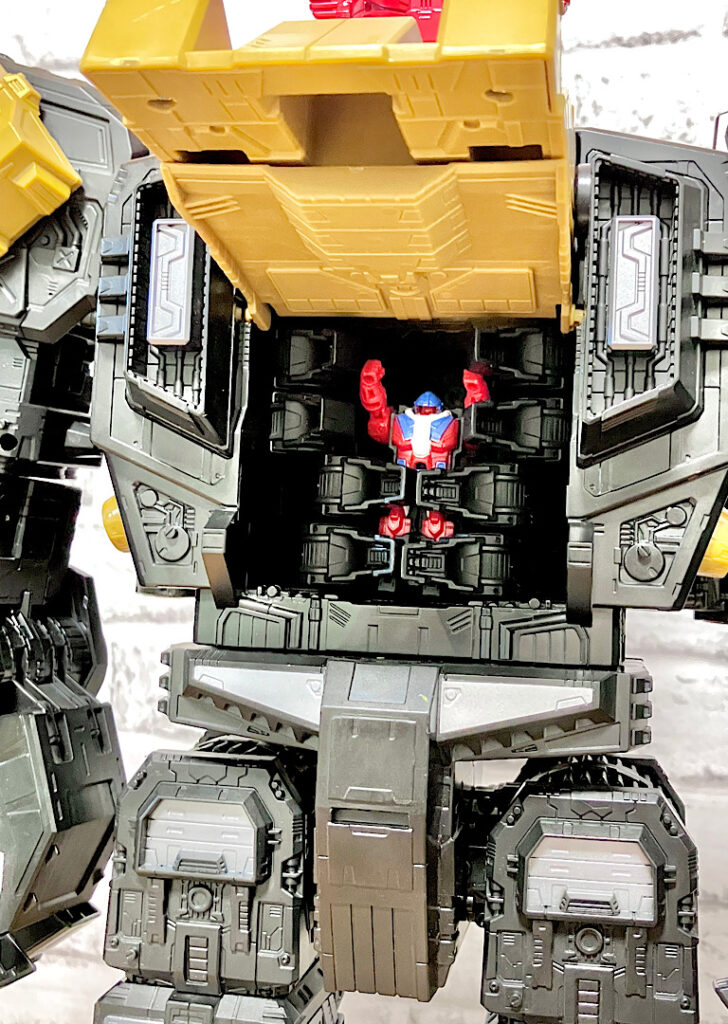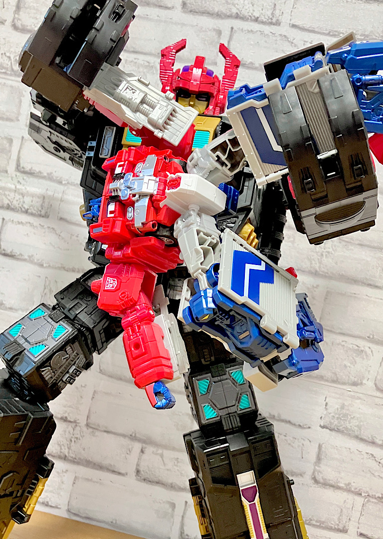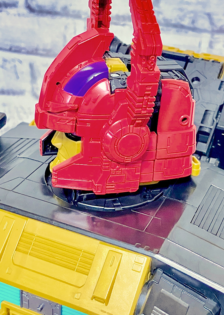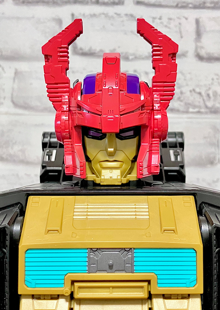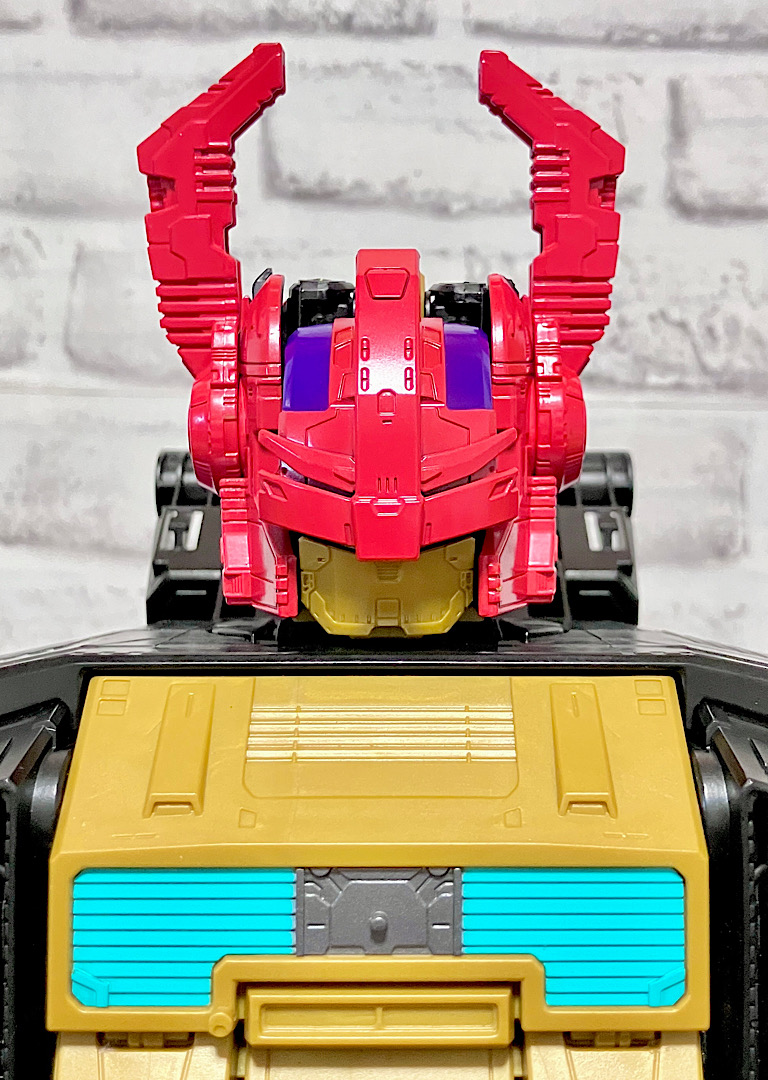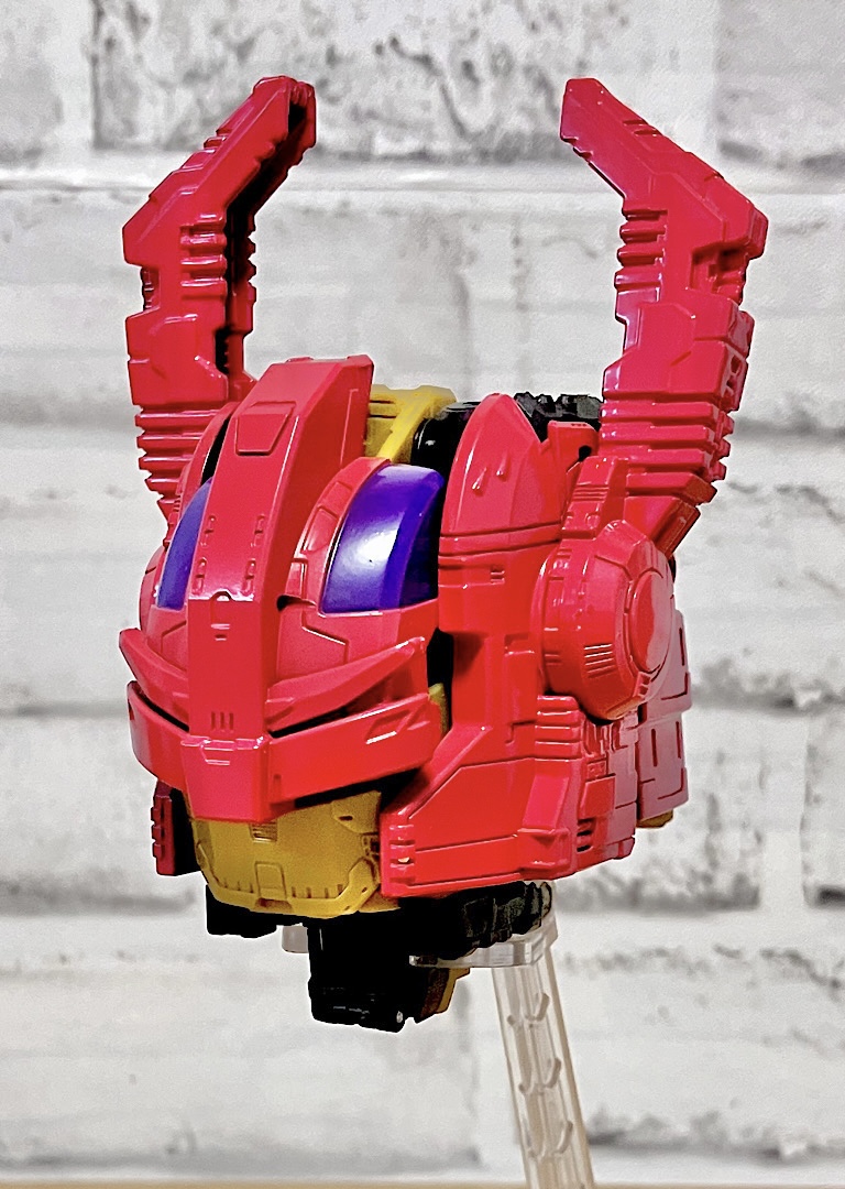 頭部はバイザーが閉まった状態でくっついており、ツノがキバの役割をしています。ちなみに小ヘッドマスターがくっついた中ヘッドマスターを合体させているわけですが、小ヘッドマスターは無くても合体できます。