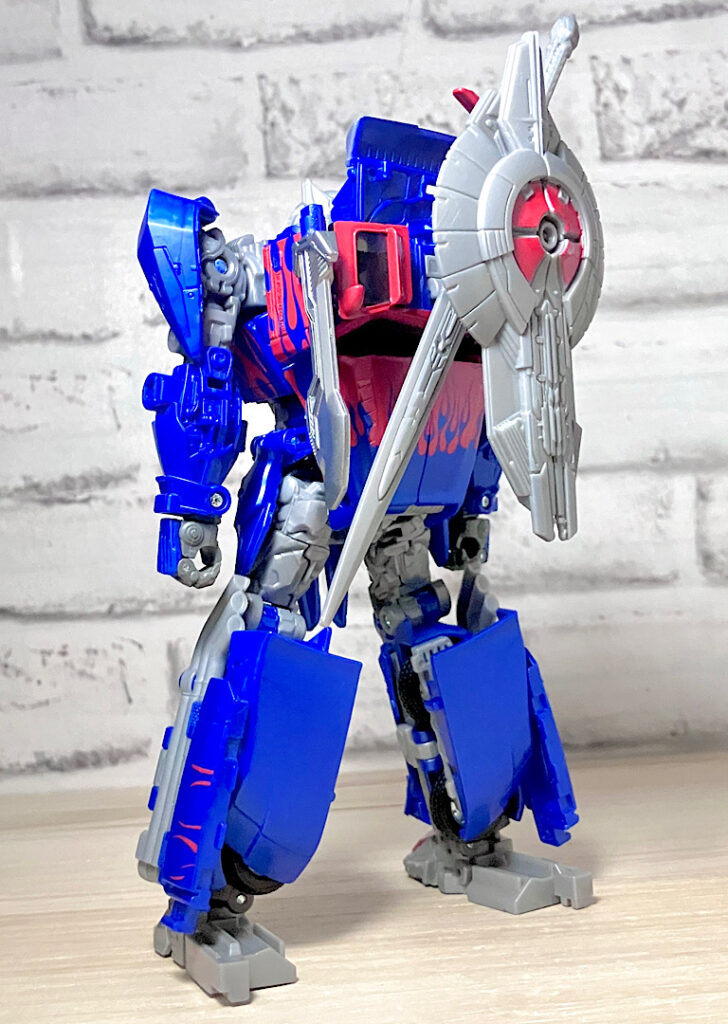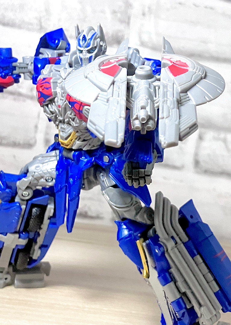 【変形】基本的にはガワ変形にせざるを得ない騎士オプ。バックパックと脚部に集められたガワを展開して、裏返しながらかぶせていくような変形です。要所要所にガイドがちゃんとあって迷うことはありませんが、最後にガワをツライチにするのに苦戦するかもしれません。難易度は手応えがあってスタジオシリーズとしてはちょうどいい感じ。