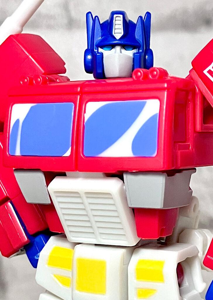 【ロボットモード】ゲーム作品とはいっても初代アニメを意識した世界観なので、見た目はややゆるい作画のG1アニメオプ(コンボイ)そのもの。ディテールの少ない造形、ベタで単調なカラーリングと窓のワカメ影により、一瞬平面に錯覚してしまいそうな面白い仕上がりなんですよね。