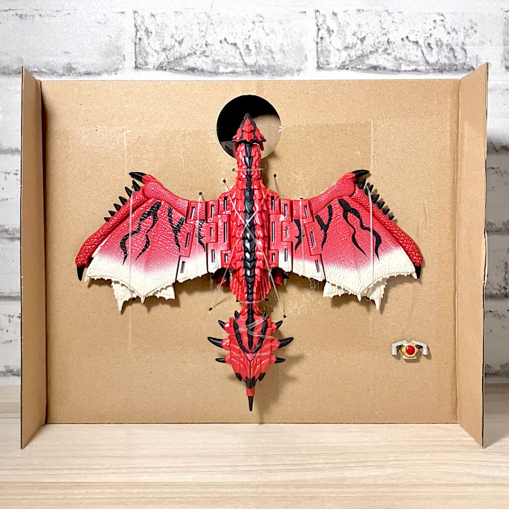パッケージを開けると、段ボールに括り付けられて捕えられたようなリオレウスが。今回はブリスター無しの簡素なパッケージでした。