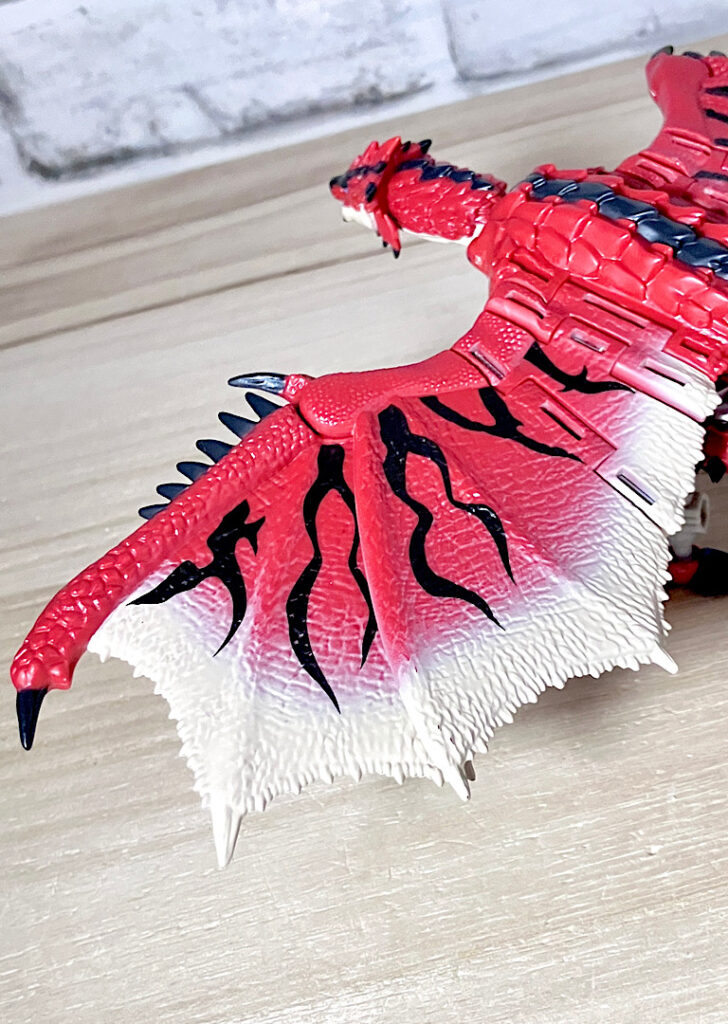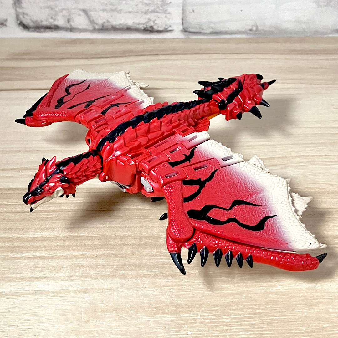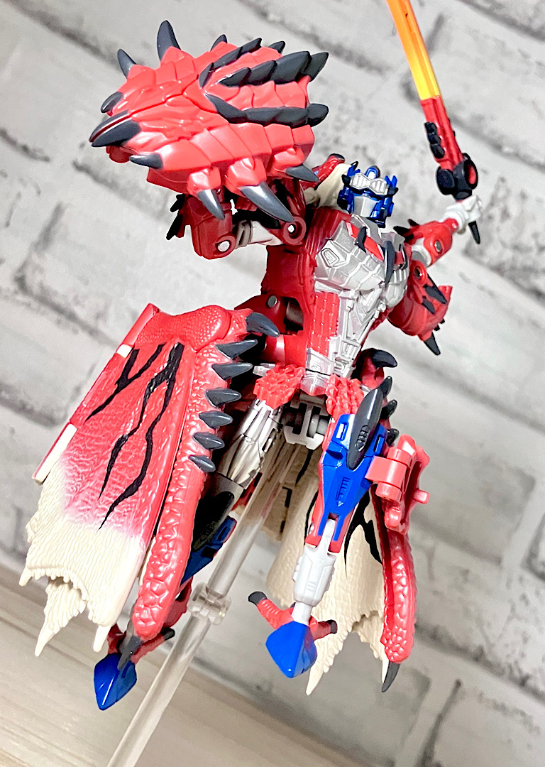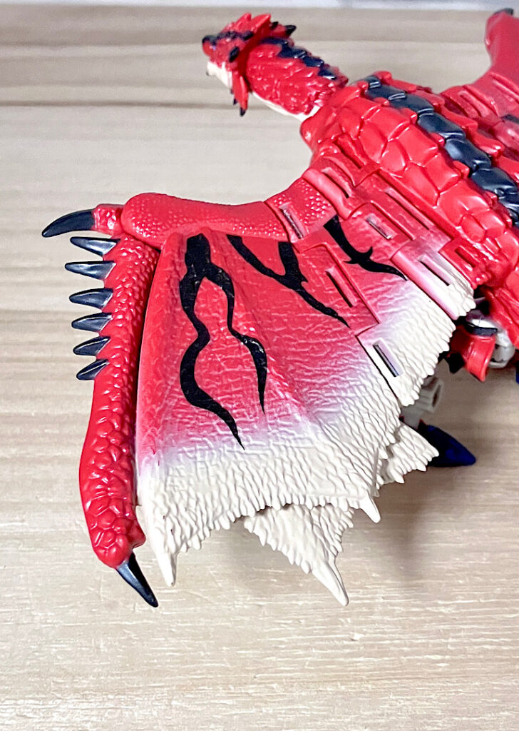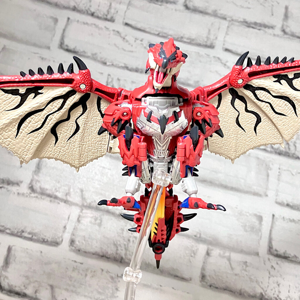 【ビーストモード】スペースブリッジの不具合でモンハンの世界に迷い込んでしまったオプティマスが、目立たないようにリオレウスをスキャンした姿。ちなみにモンハンはプレイ動画しか見たことがないですが、パッと見はまさかロボットになるとは思えないくらいにドラゴン(というかワイバーン)ですね。なおボリューム感はデラックスとボイジャーの中間くらいで、気軽に遊ぶのにちょうどいいサイズです。