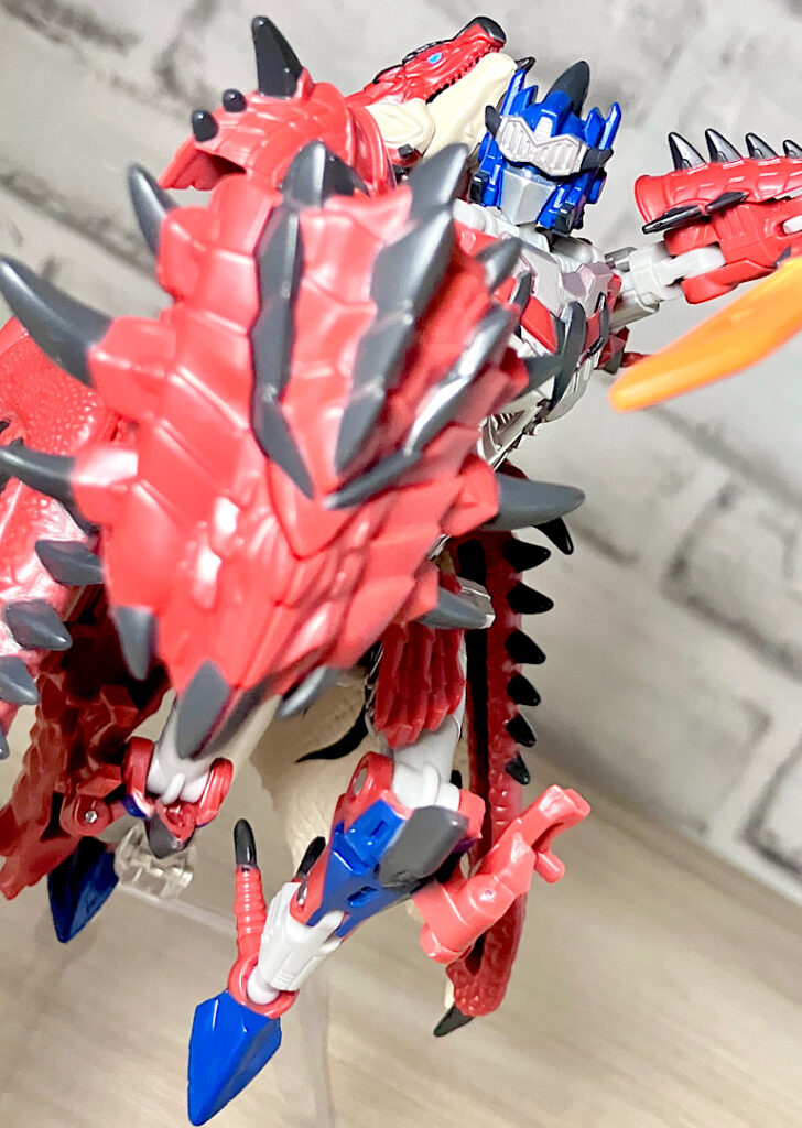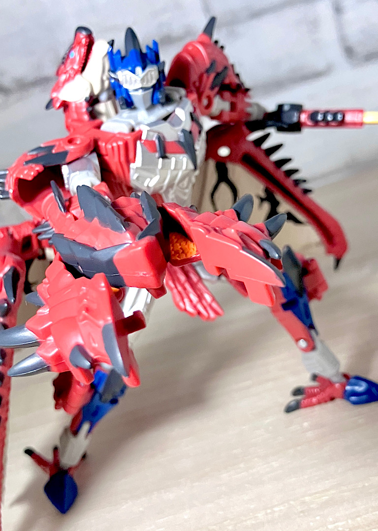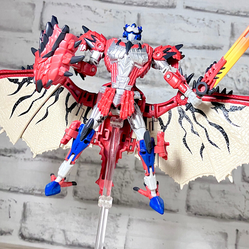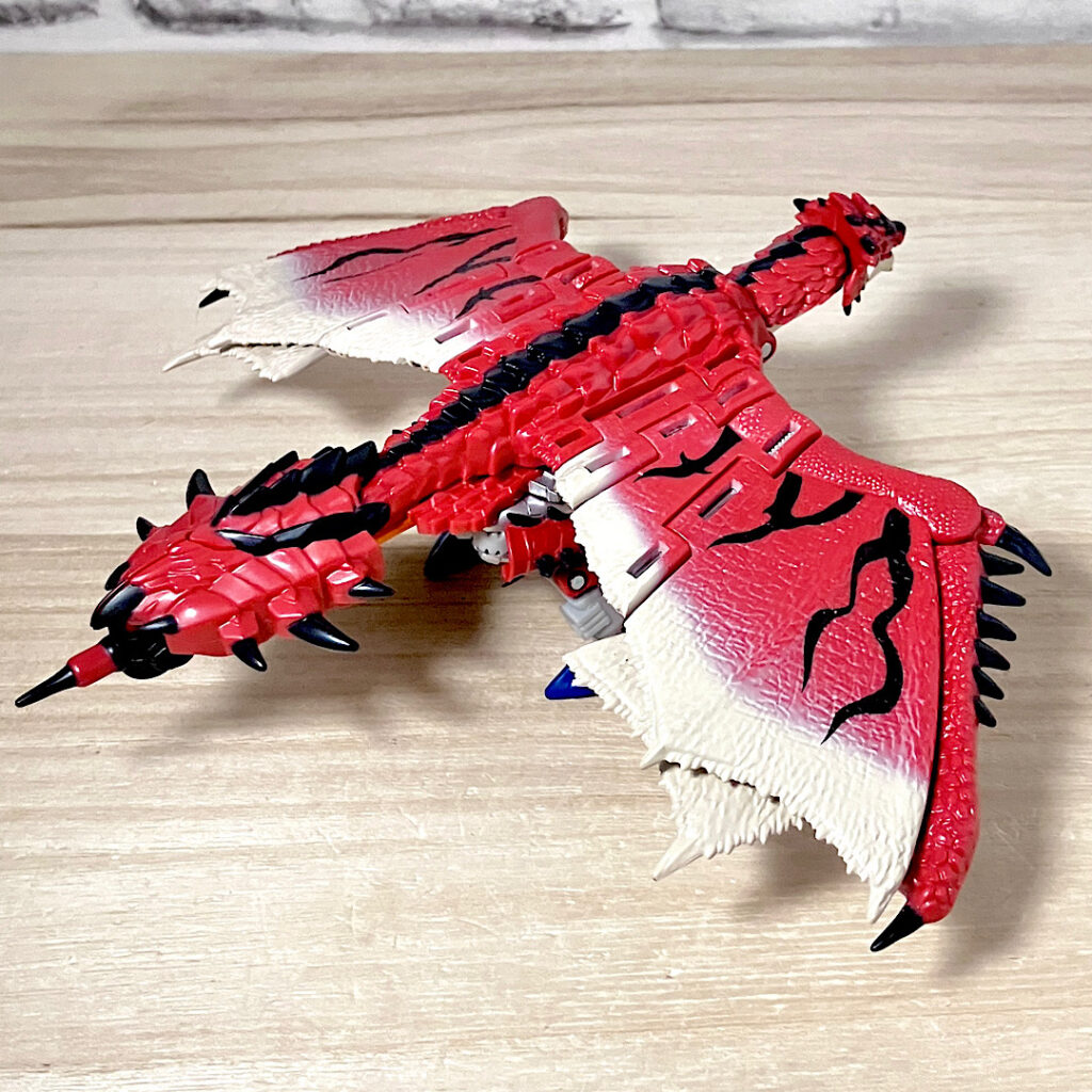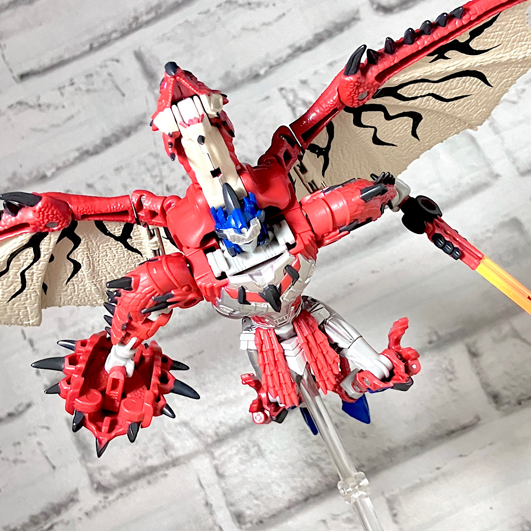 【ビーストモード】スペースブリッジの不具合でモンハンの世界に迷い込んでしまったオプティマスが、目立たないようにリオレウスをスキャンした姿。ちなみにモンハンはプレイ動画しか見たことがないですが、パッと見はまさかロボットになるとは思えないくらいにドラゴン(というかワイバーン)ですね。なおボリューム感はデラックスとボイジャーの中間くらいで、気軽に遊ぶのにちょうどいいサイズです。