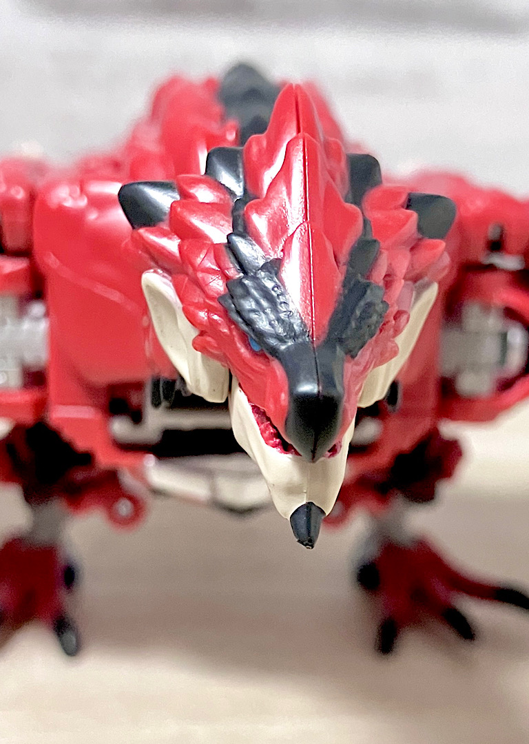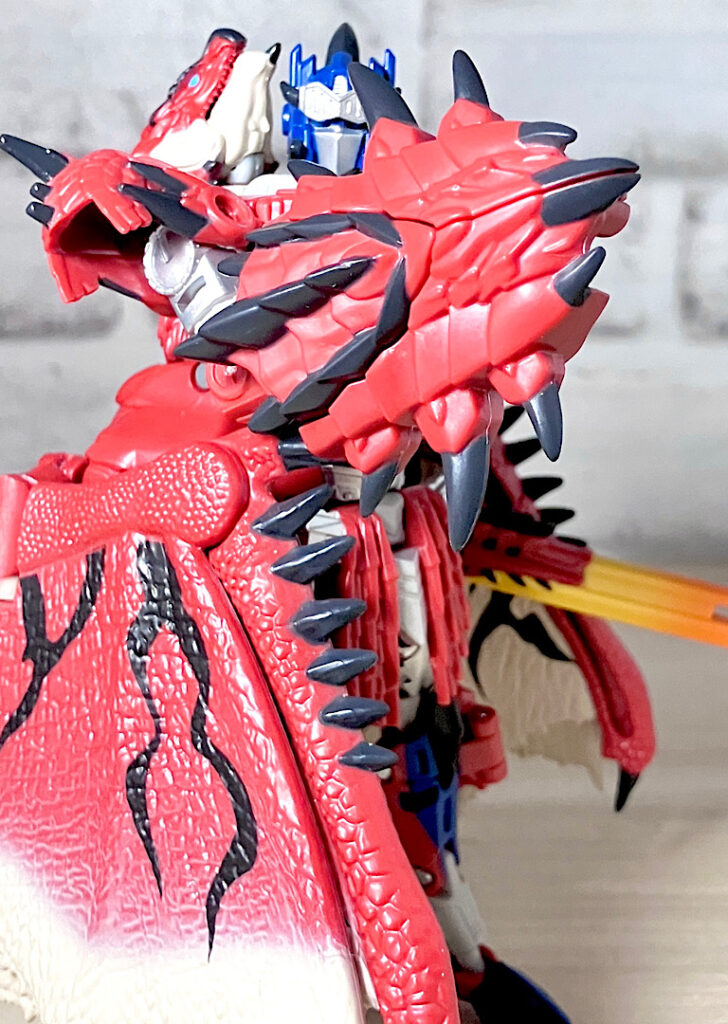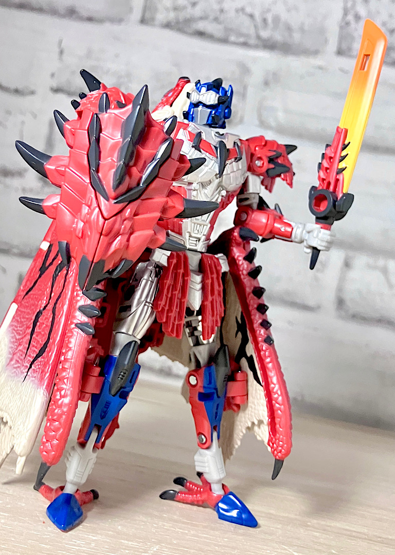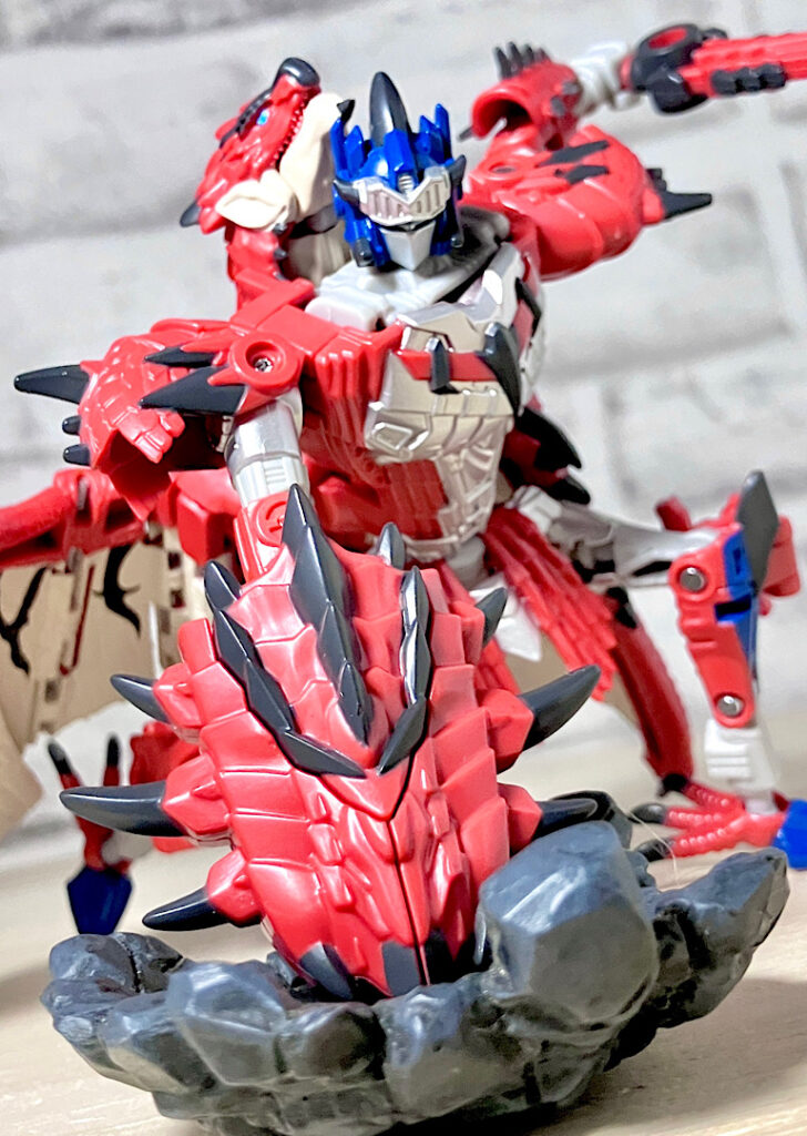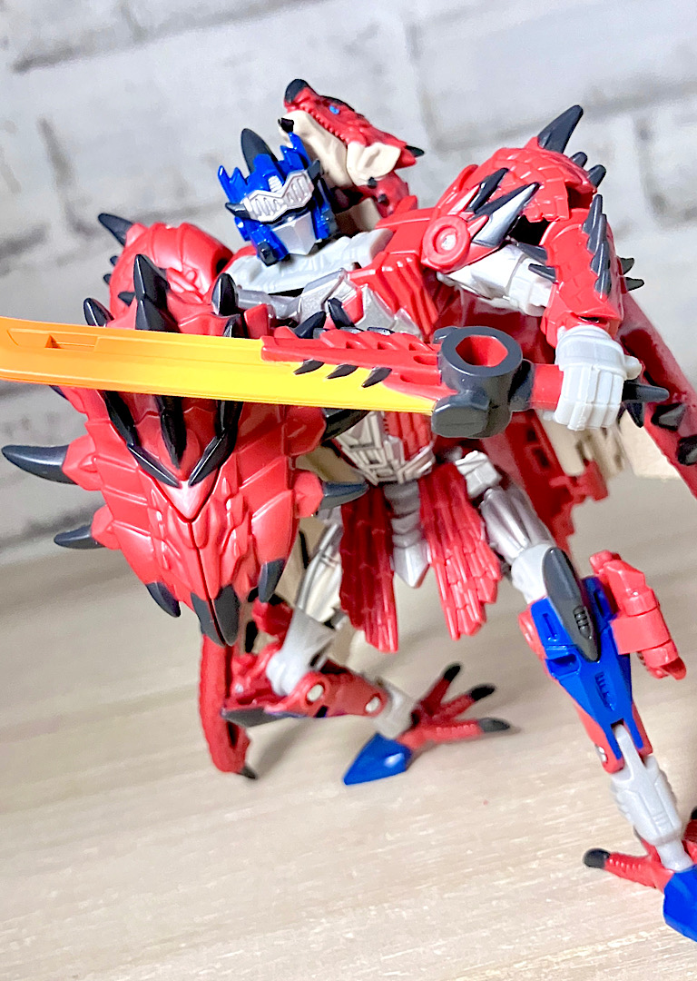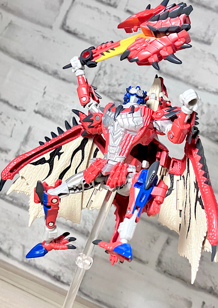 【ビーストモード】スペースブリッジの不具合でモンハンの世界に迷い込んでしまったオプティマスが、目立たないようにリオレウスをスキャンした姿。ちなみにモンハンはプレイ動画しか見たことがないですが、パッと見はまさかロボットになるとは思えないくらいにドラゴン(というかワイバーン)ですね。なおボリューム感はデラックスとボイジャーの中間くらいで、気軽に遊ぶのにちょうどいいサイズです。
