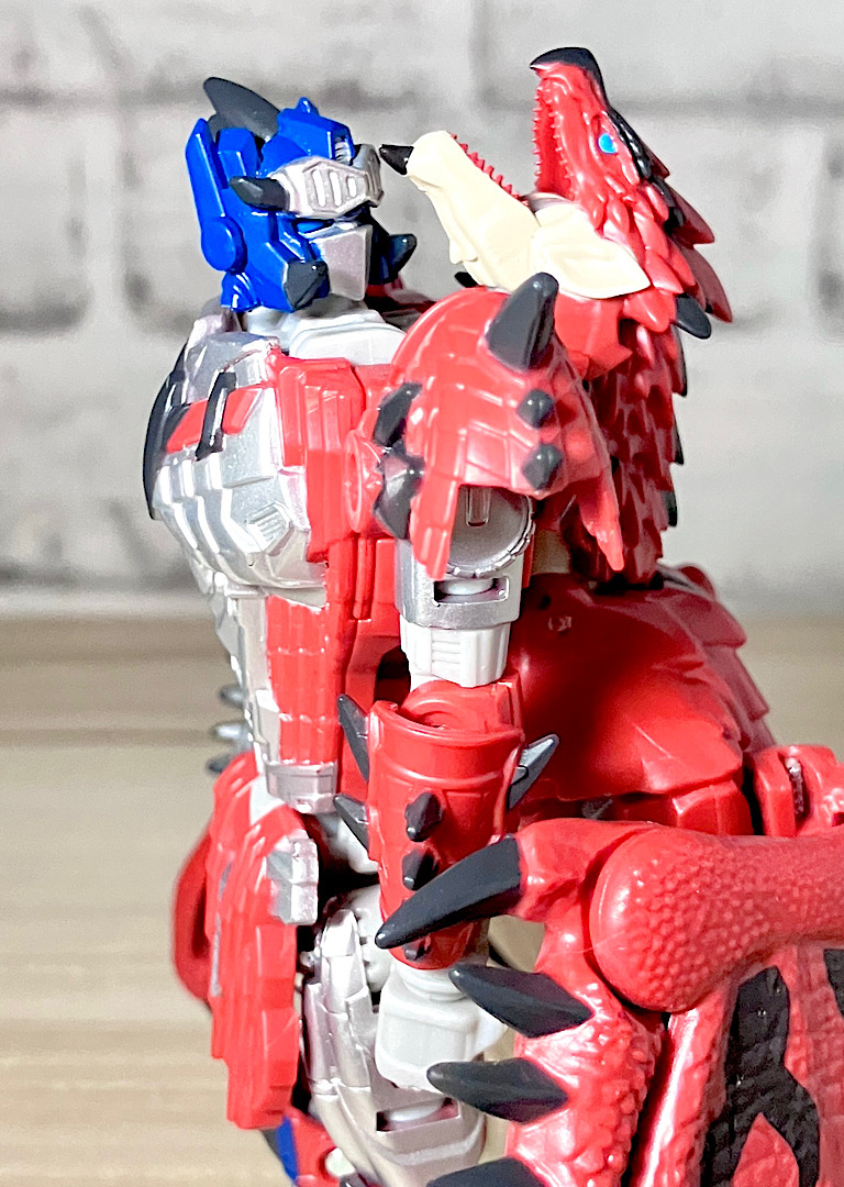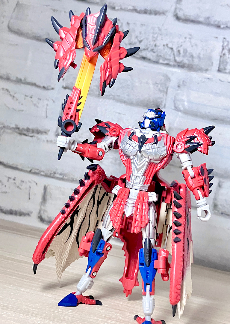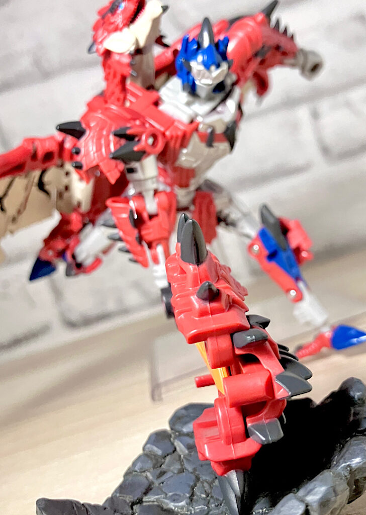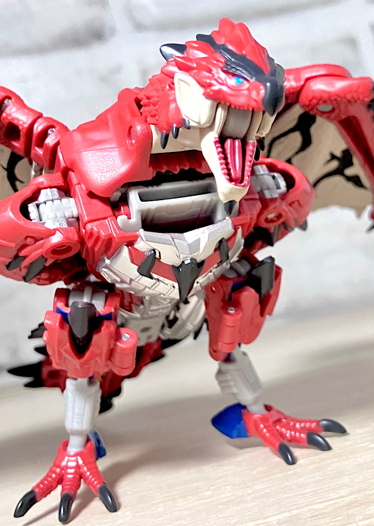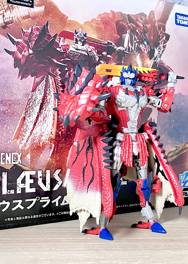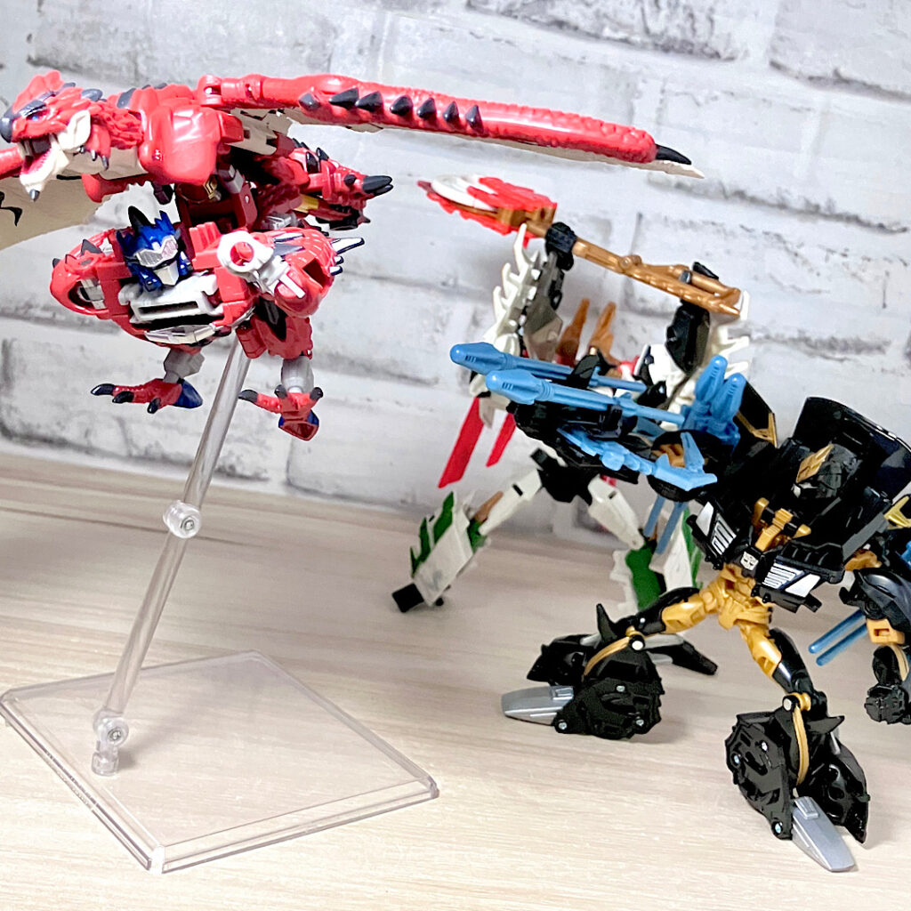 【ビーストモード】スペースブリッジの不具合でモンハンの世界に迷い込んでしまったオプティマスが、目立たないようにリオレウスをスキャンした姿。ちなみにモンハンはプレイ動画しか見たことがないですが、パッと見はまさかロボットになるとは思えないくらいにドラゴン(というかワイバーン)ですね。なおボリューム感はデラックスとボイジャーの中間くらいで、気軽に遊ぶのにちょうどいいサイズです。
