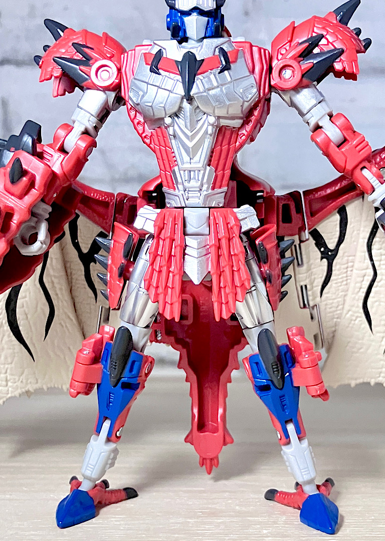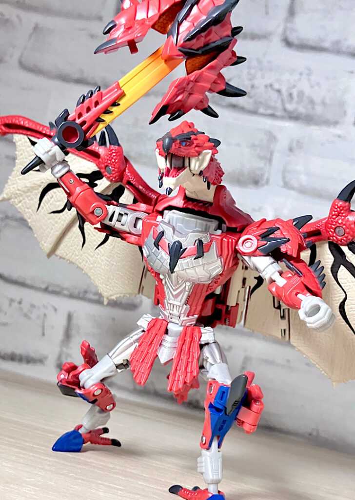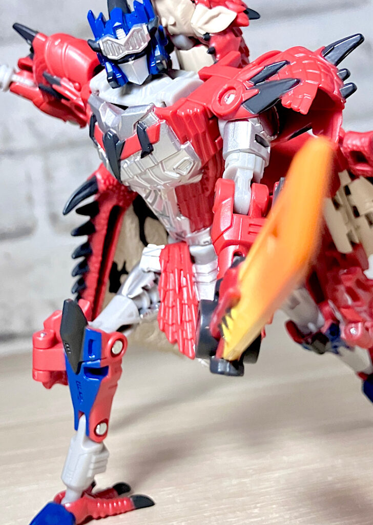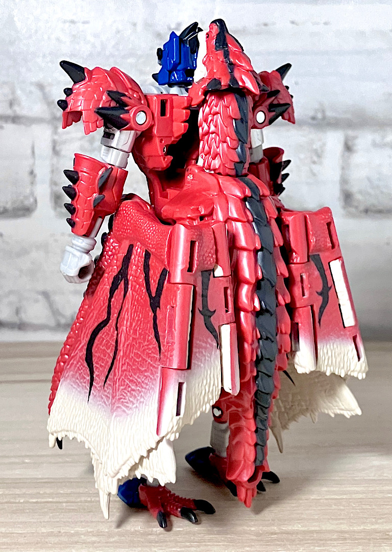 【変形】実はこのリオレウスプライム、パーツは大部分が新規なんですが構造自体はキングダムエアラザーの流用だったりします。KDテラーソアやSSエアレイザーにも流用された機構で、なじみのある変形方法。腰を回したと思ったら脚部をさらに回したりするのはいかにもビーストらしい部分。全体的にはそんなに難しくもなく、鳥型としては完成度が高い方になるんでしょうね。