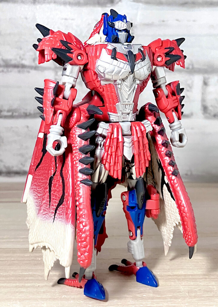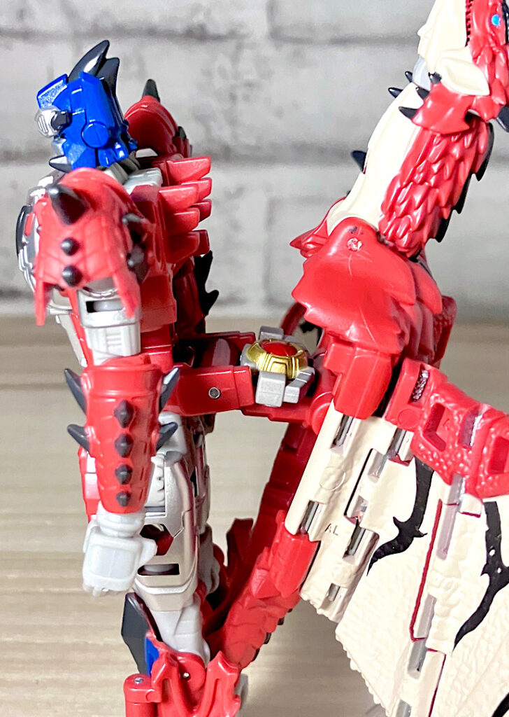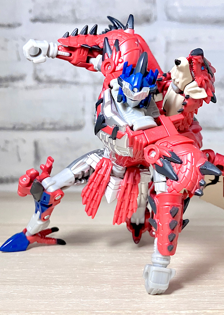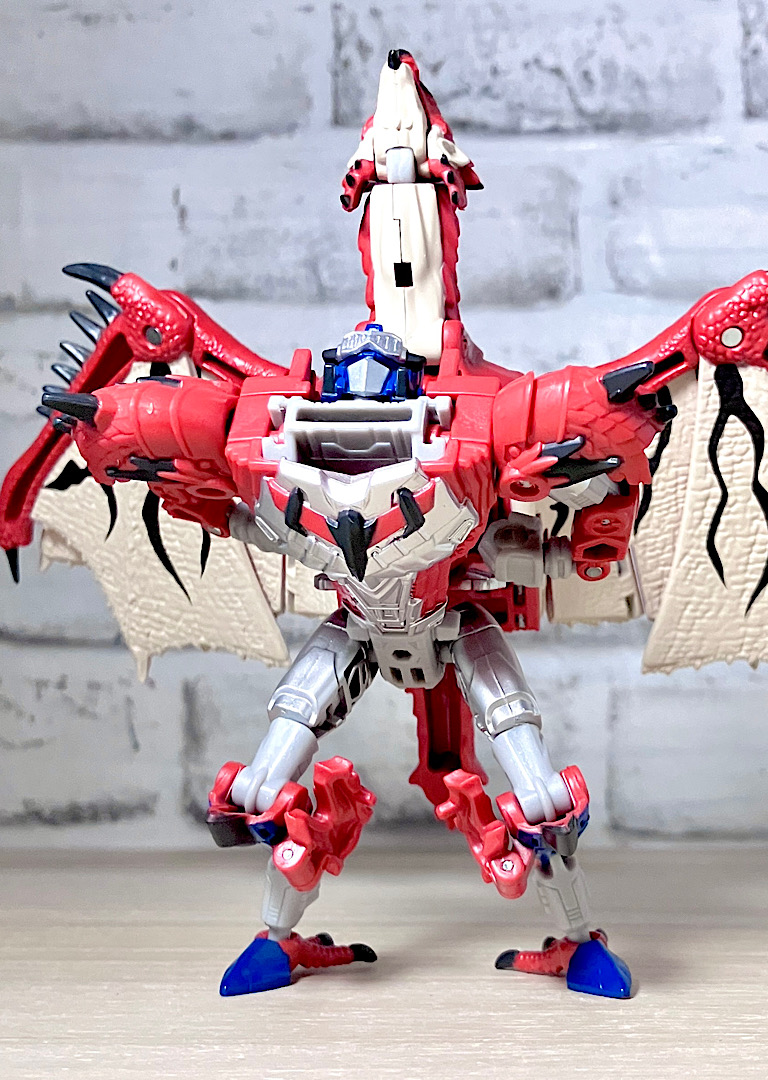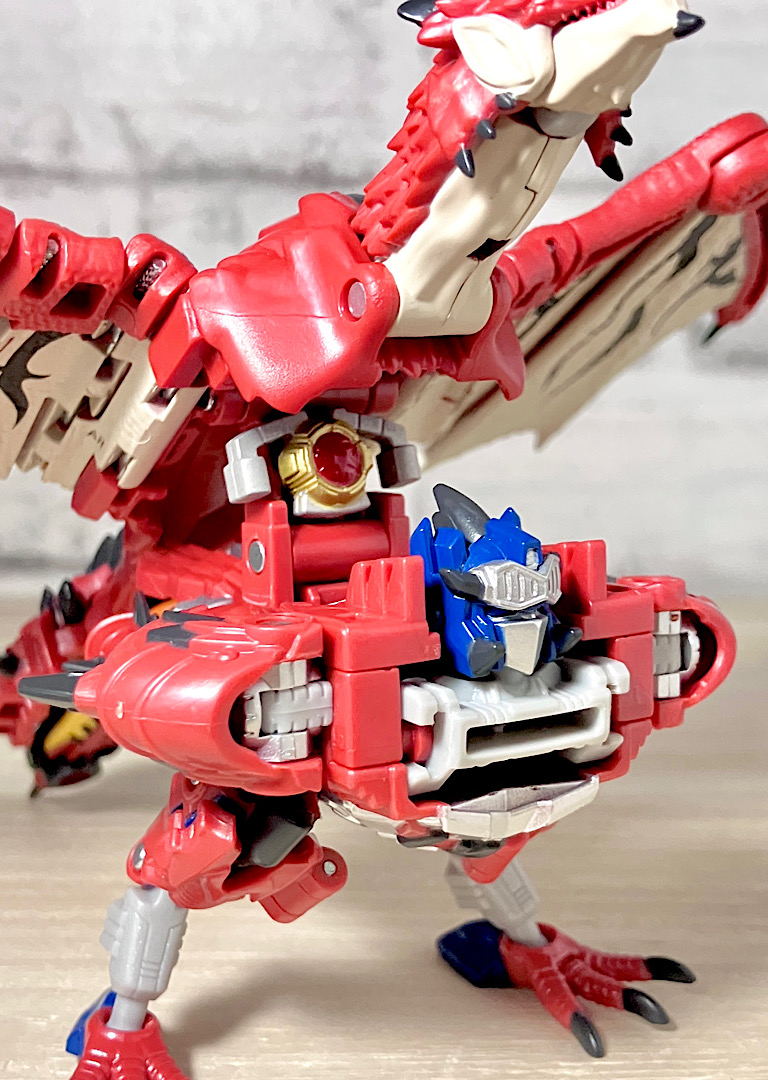 【変形】実はこのリオレウスプライム、パーツは大部分が新規なんですが構造自体はキングダムエアラザーの流用だったりします。KDテラーソアやSSエアレイザーにも流用された機構で、なじみのある変形方法。腰を回したと思ったら脚部をさらに回したりするのはいかにもビーストらしい部分。全体的にはそんなに難しくもなく、鳥型としては完成度が高い方になるんでしょうね。