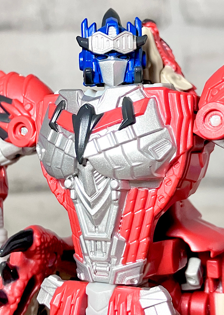 【アップ】頭部もレウス装備モチーフ。鎧のバイザーがゴーグルっぽくなっていて、空中を舞うオプティマスをイメージしている…なんていうのは考えすぎでしょうか。とにかく先述しましたが、エアレイザーを元にしながらもパーツがほとんど新規なのが非常に贅沢なアイテムです。